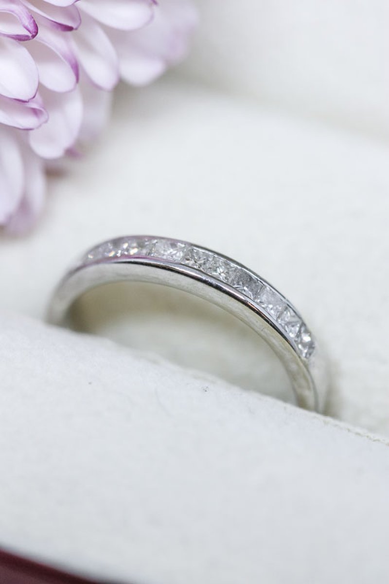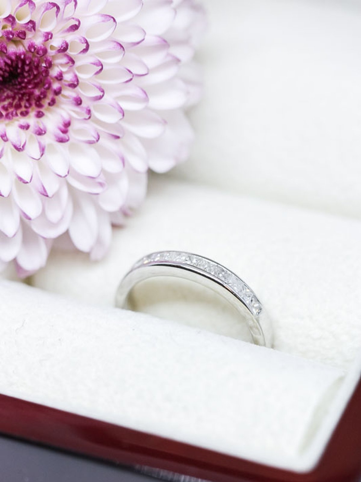 Doserad alliansring med fyrkantigt slipade diamanter på totalt 0,55ct. Att ringen har doserad skena innebär att den är tunnare baktill än fram och passar därför bäst solo.