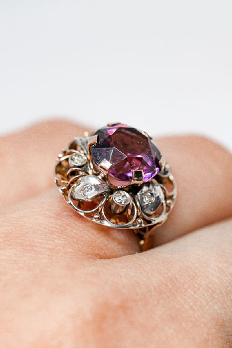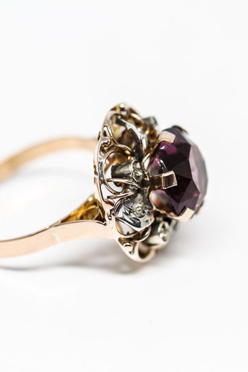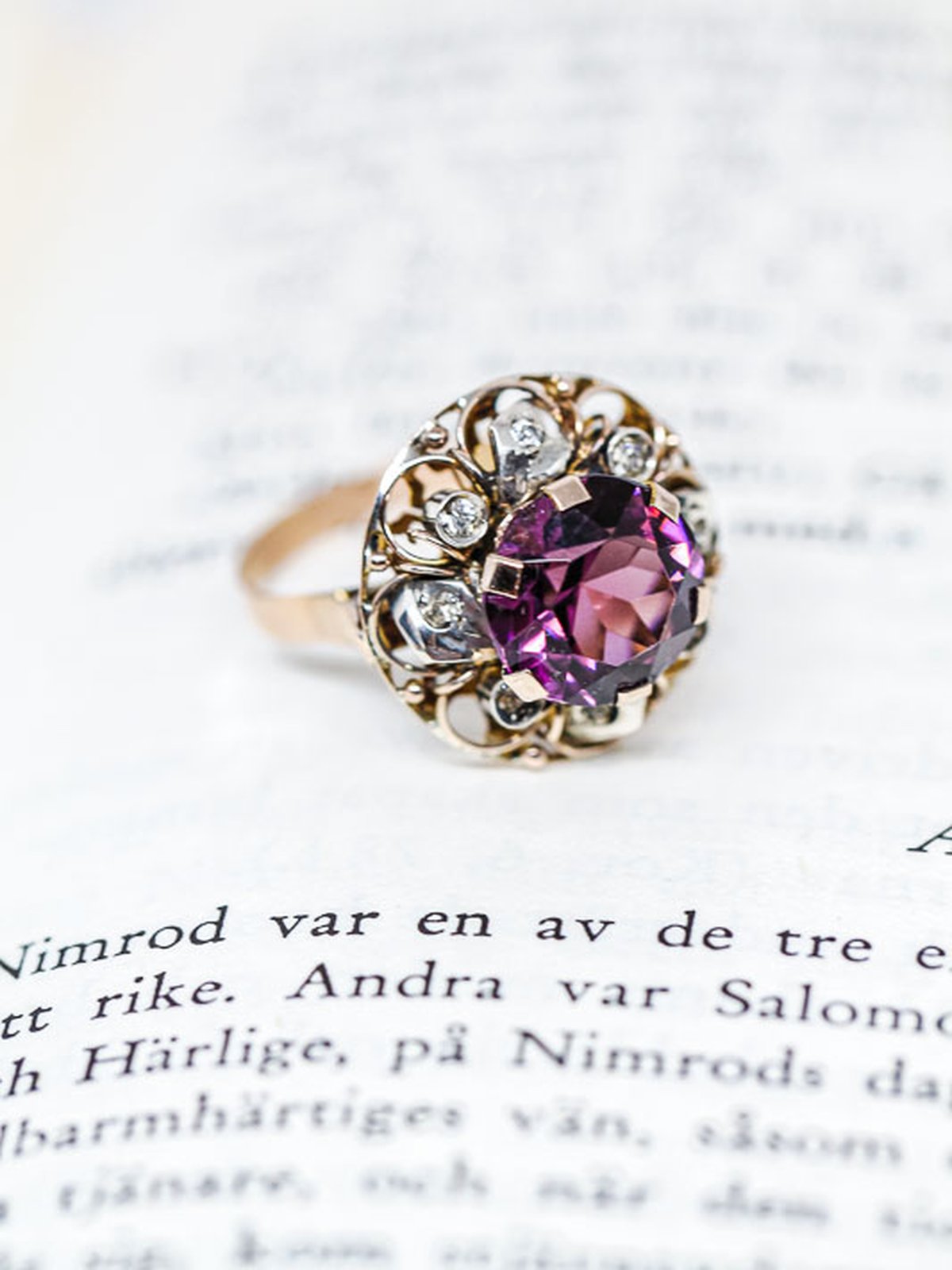 Vacker 14k ring med lila och vita stenar. Går att storleks ändra mot kostnadsförslag vid behov.