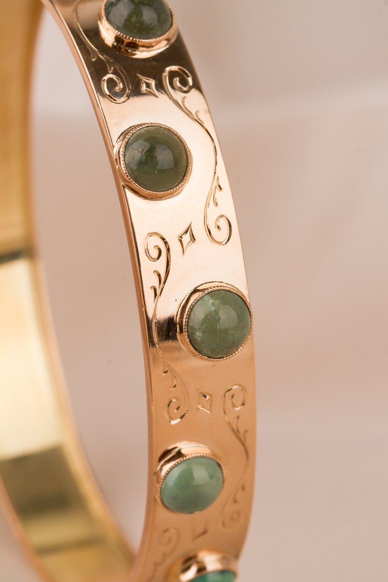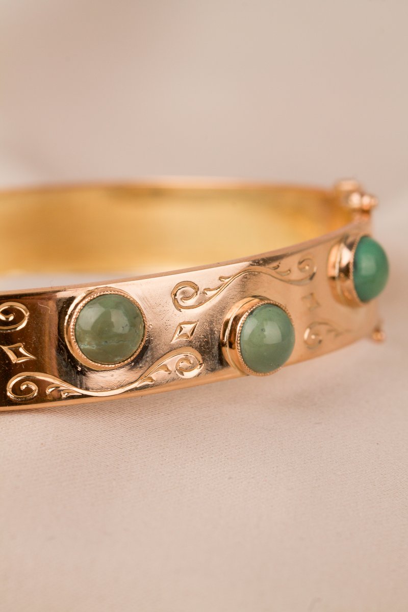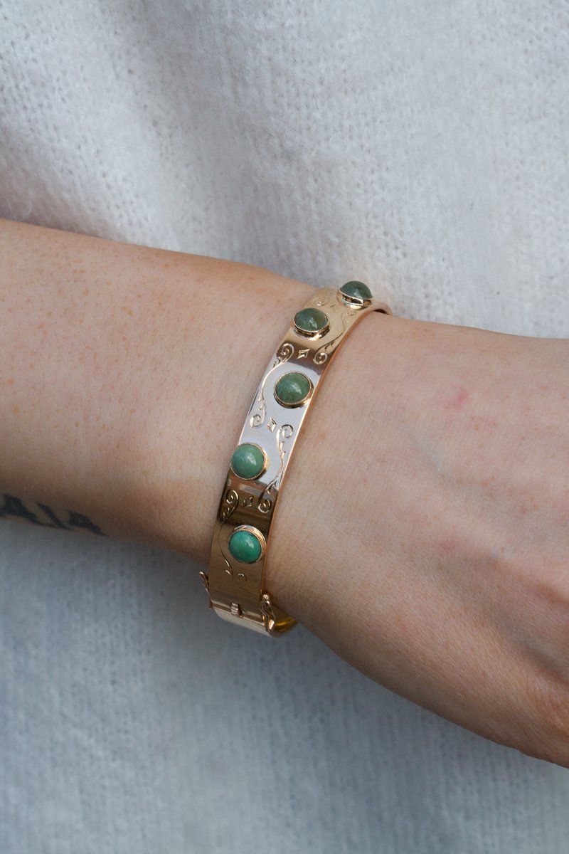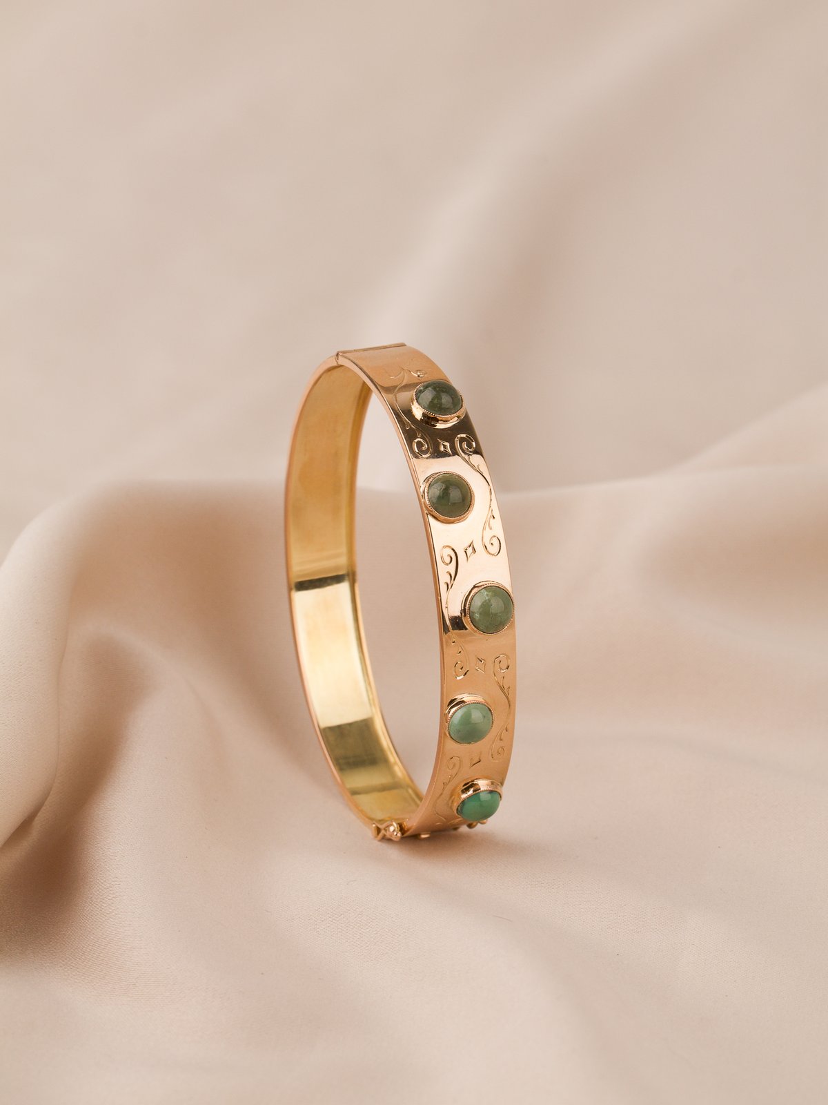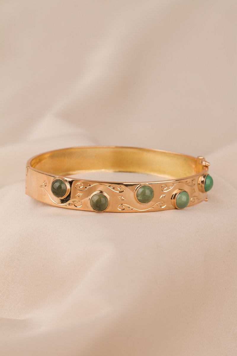 18K guld, fem st cabuchonslipade aventuriner a 5,5 mm