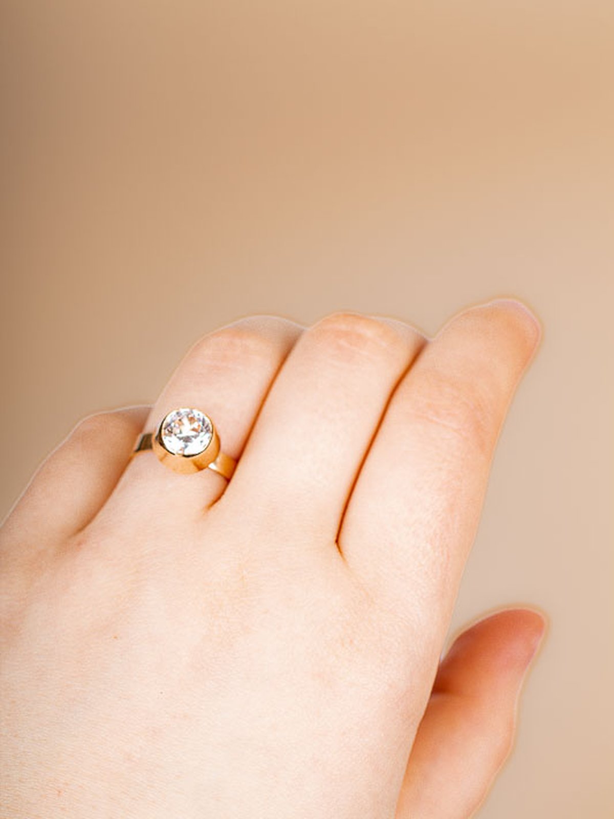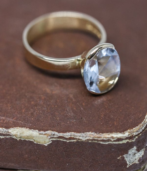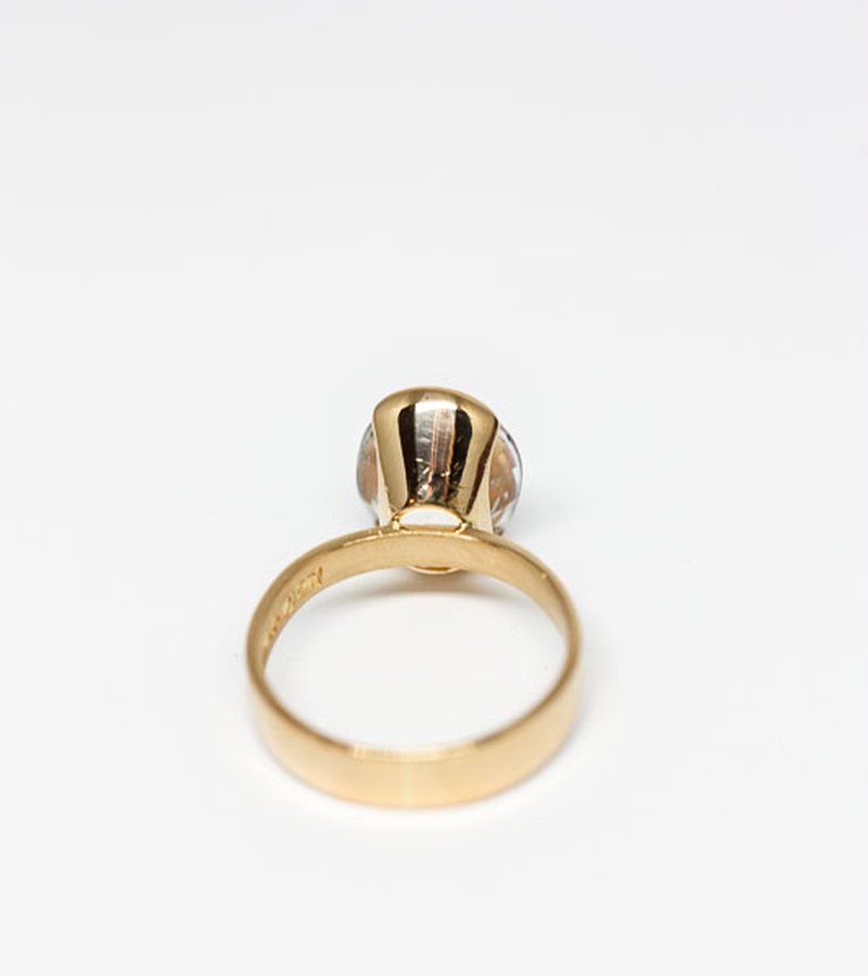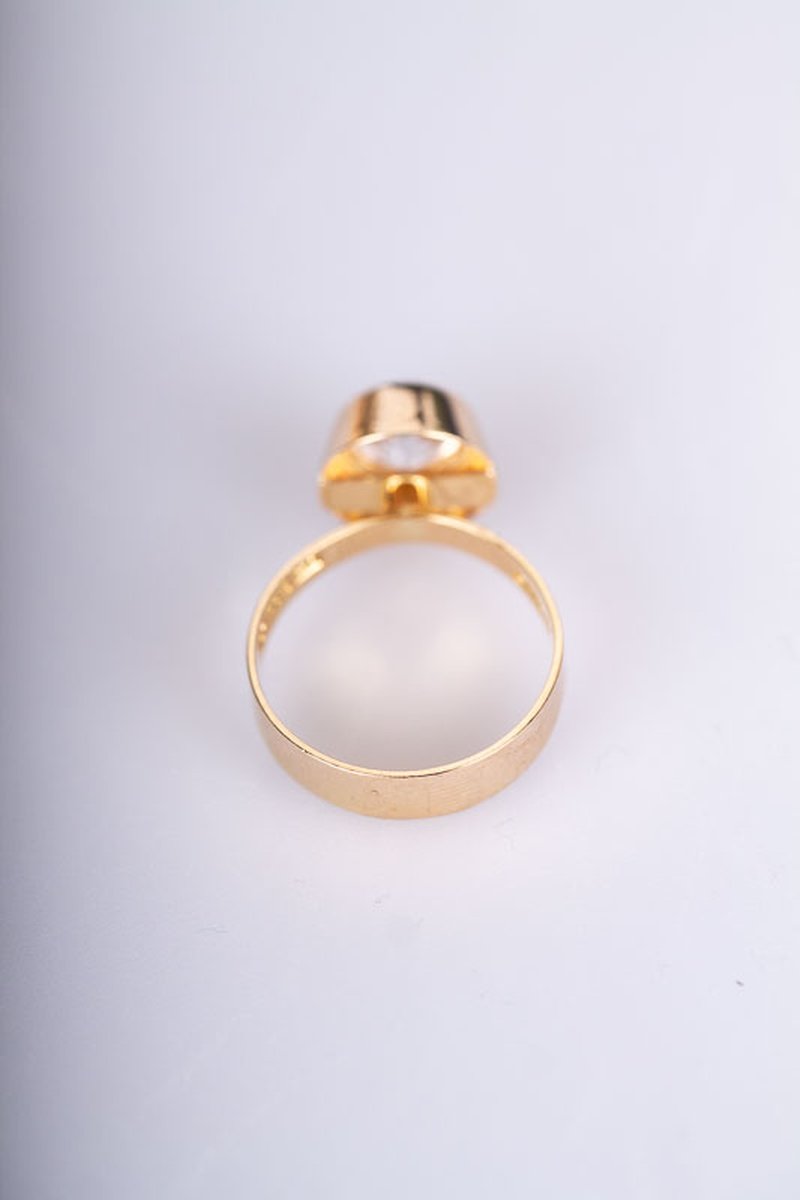 Läcker 70-tals ring i 18k guld. Den vita stenen skimrar vackert i ljuset med sina många facetter. Okänd tillverkare och år.