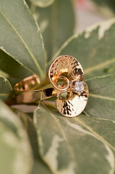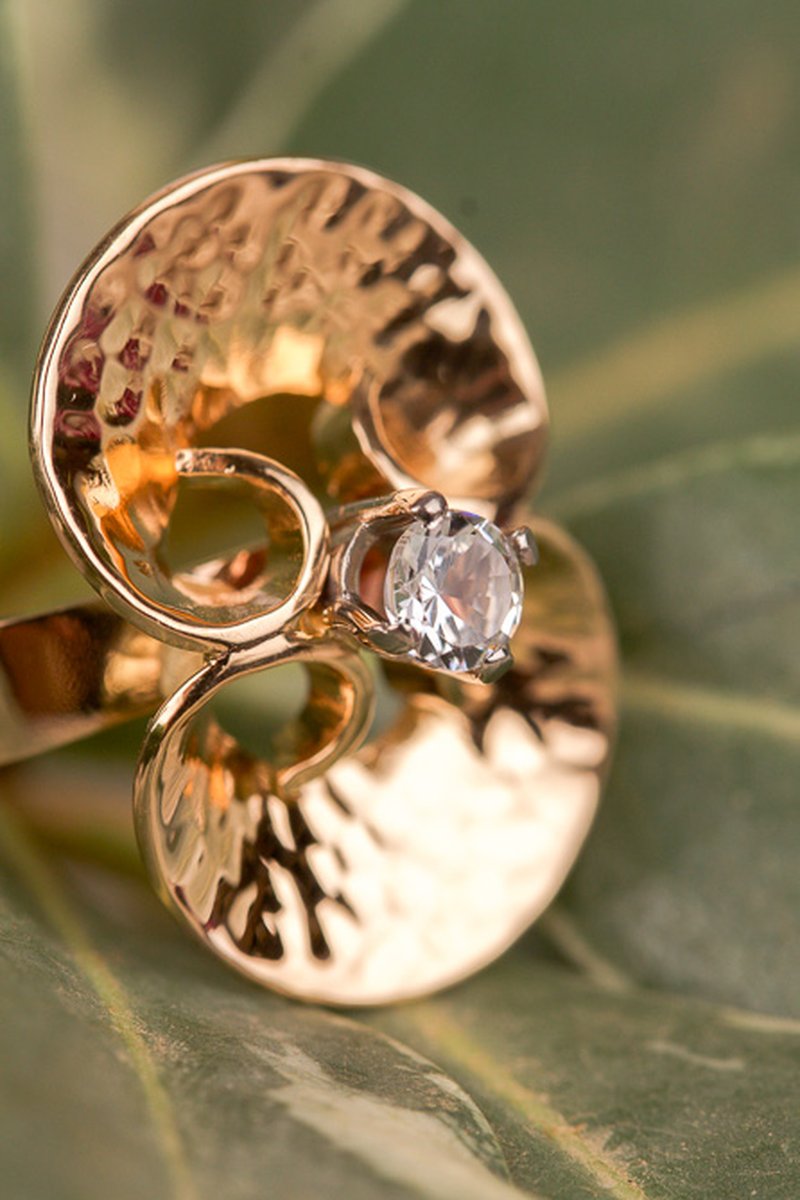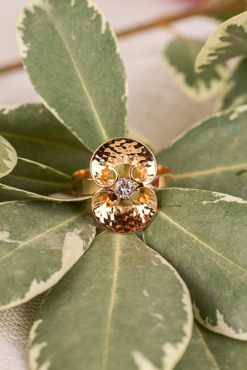 Tillverkad år 1973, underbar ring med hamrade ytor och en vitguldsinfattad vit sten i centrum.