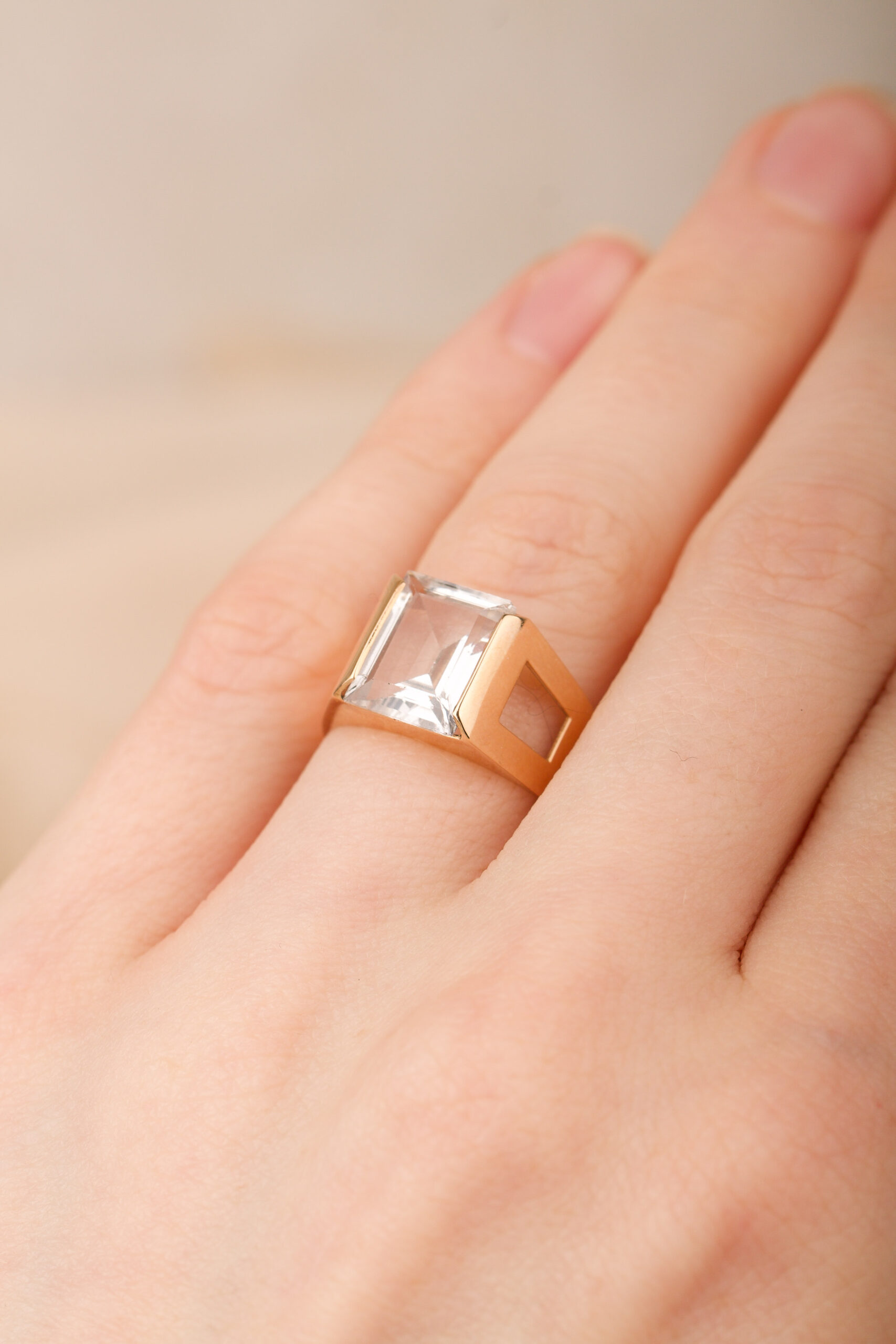 Ring tillverkad 1971 i guld med en klar/vit sten infattad i en stram, geometrisk design
