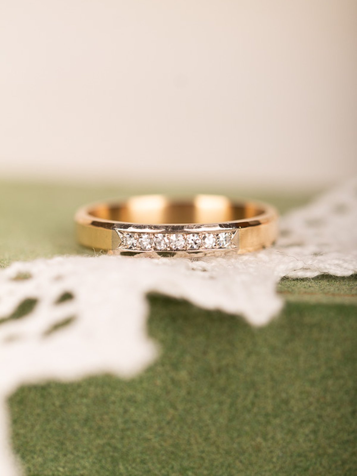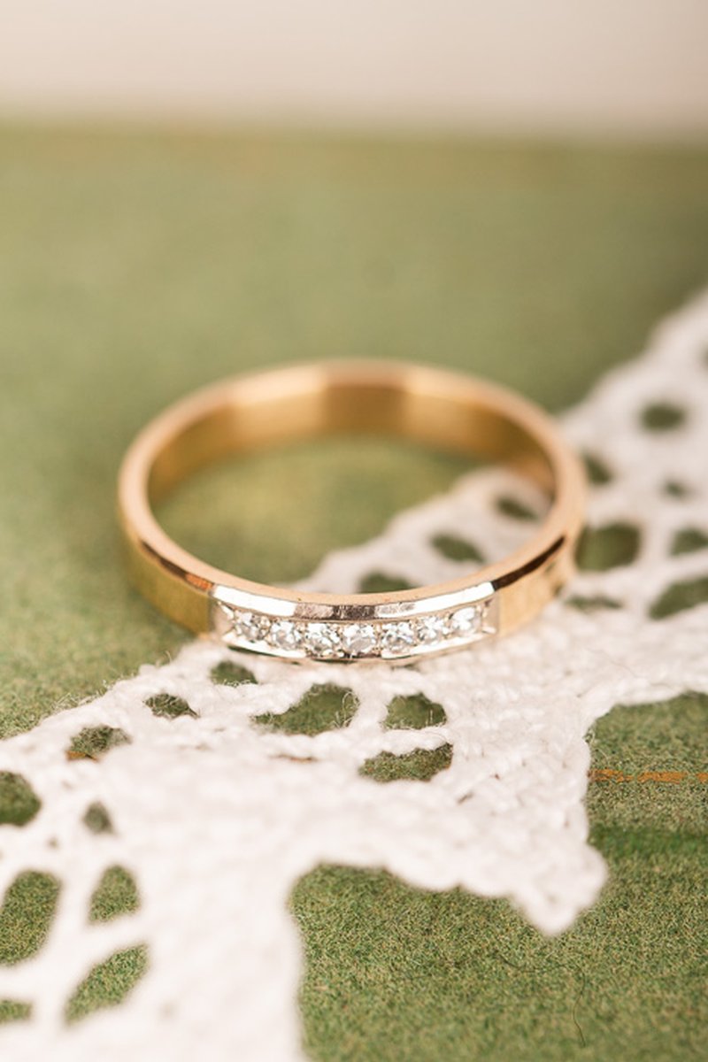 Tillverkad 1981 av Engelbert Stockholm. Vitguldsinfattade briljanter i en rödguldsskena med hamrade detaljer på kanten.