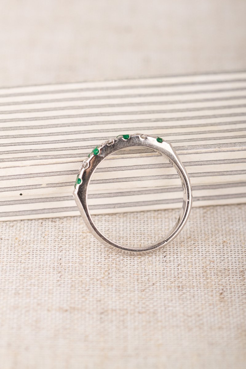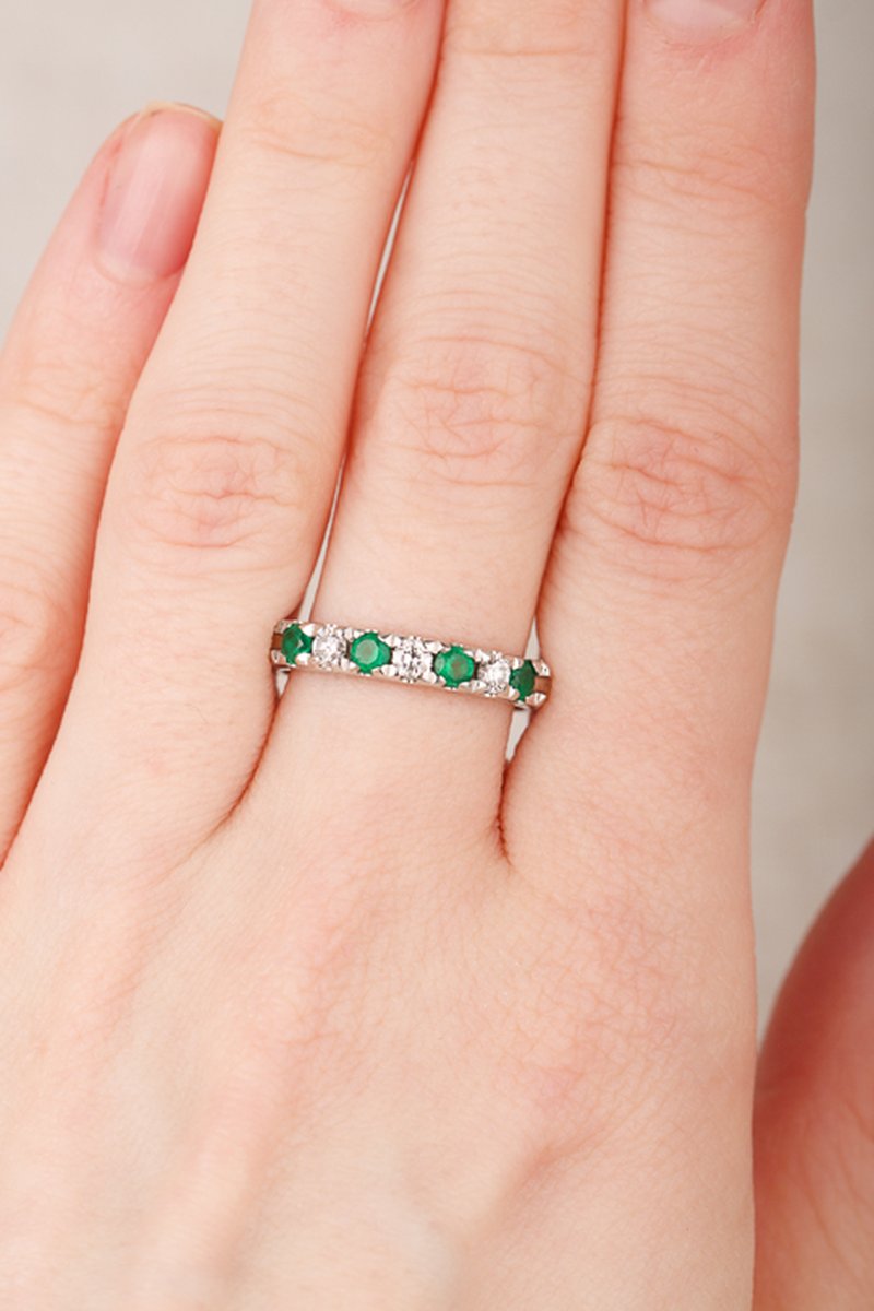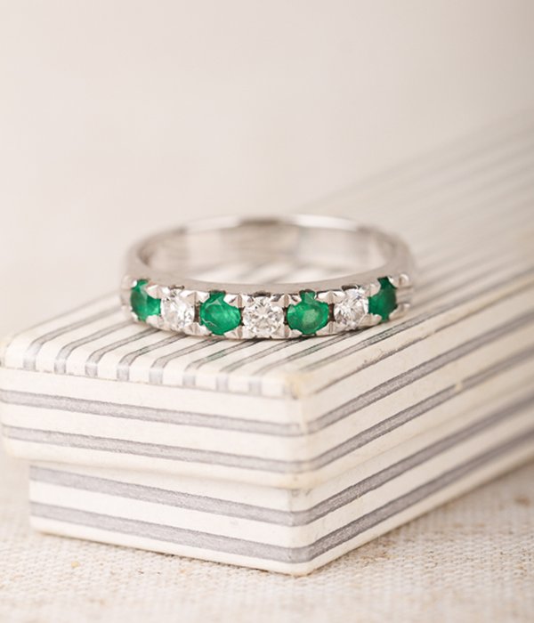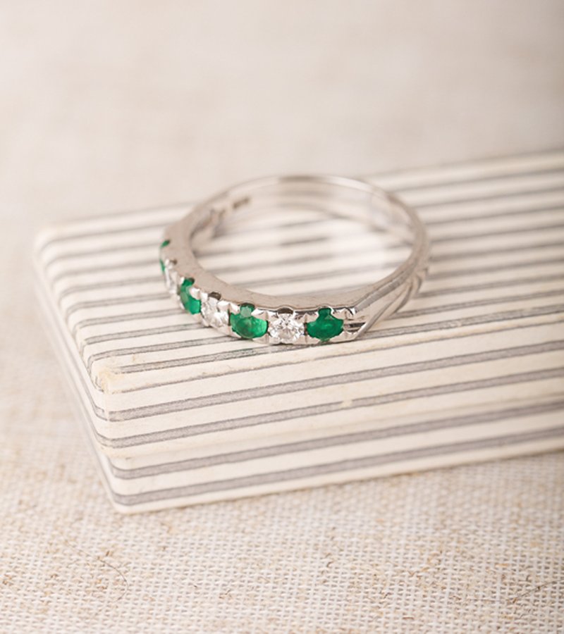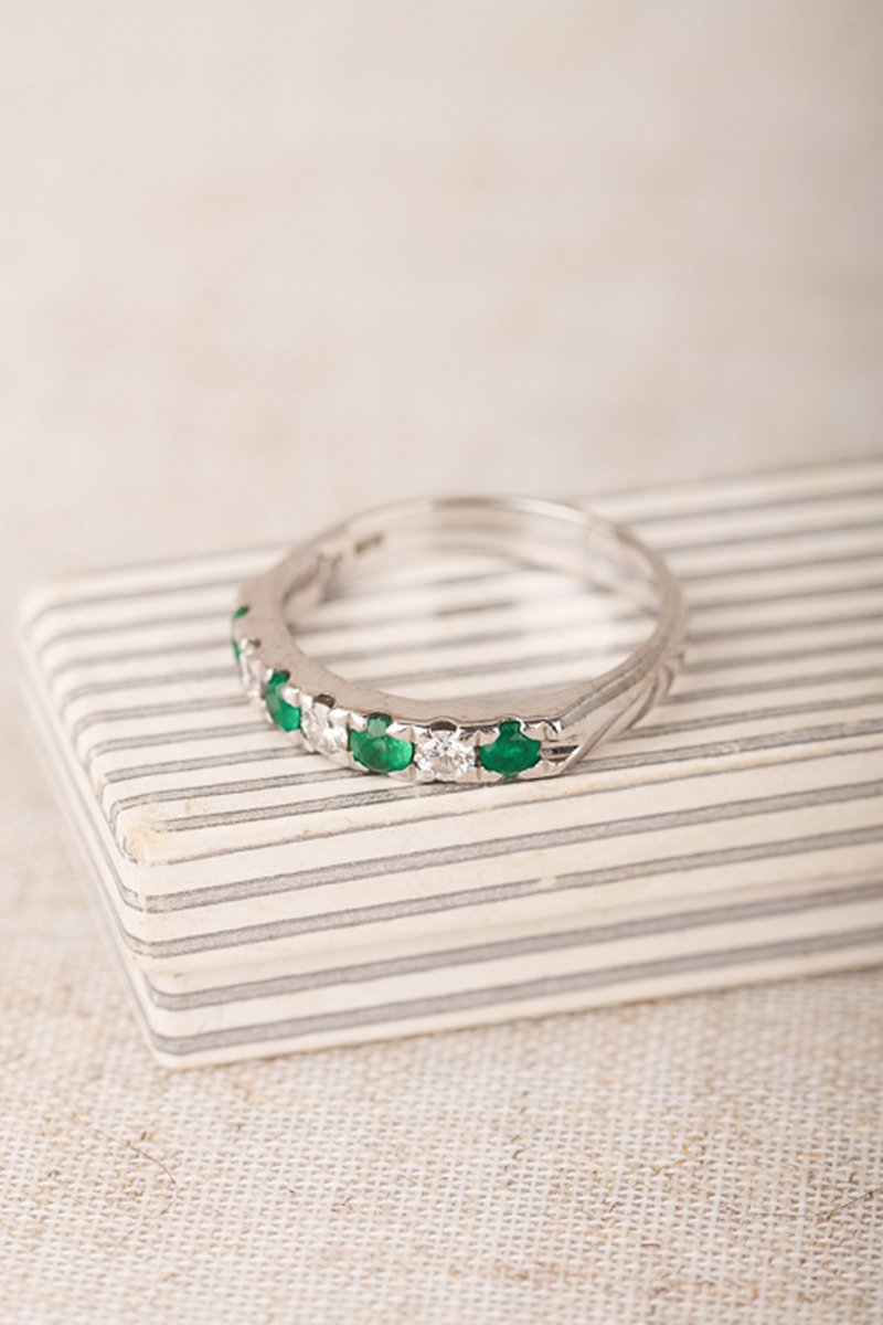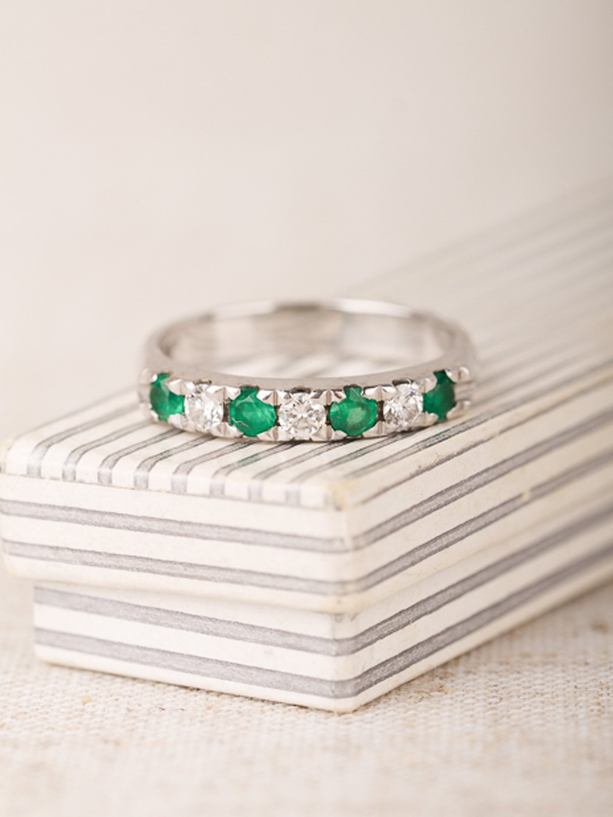 18K vitguld, 4 st smaragder á 2,9 mm, 3 x 0,08 ct briljantslipade diamanter