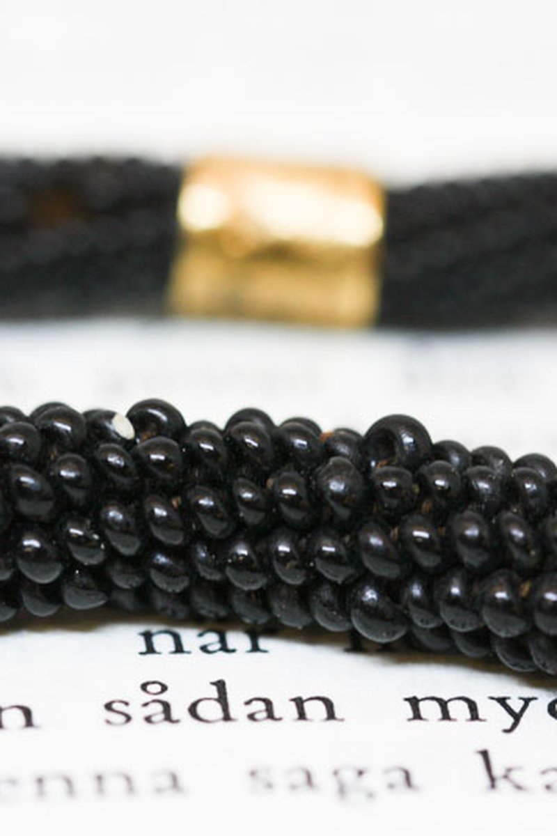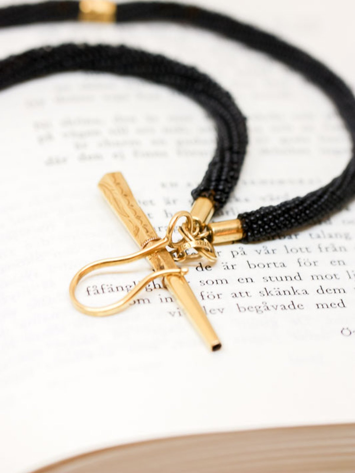 Antik klockkedja flätad med flera rader av onyxkulor med nyckel längst ned. Väldigt vacker att använda som halsband.