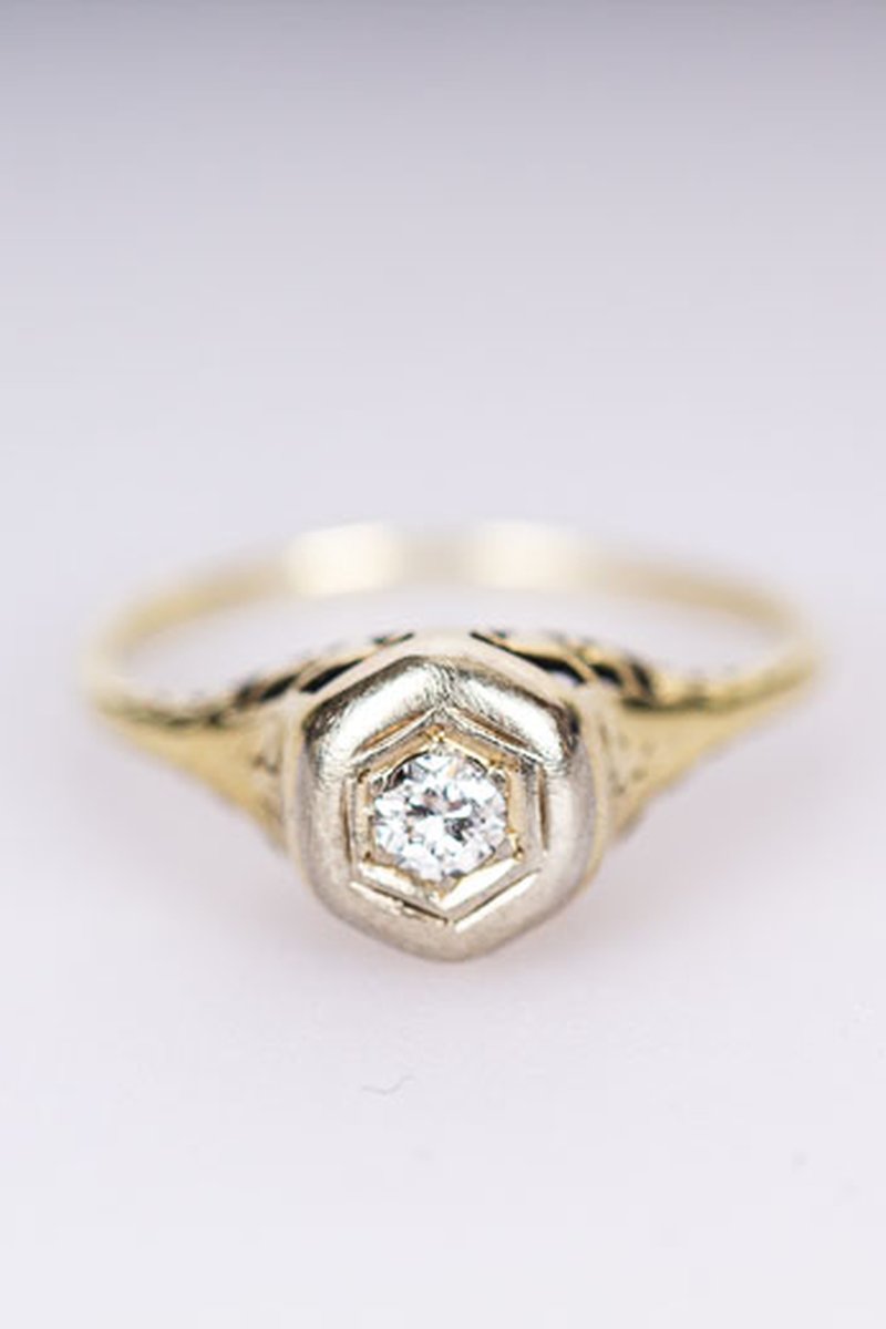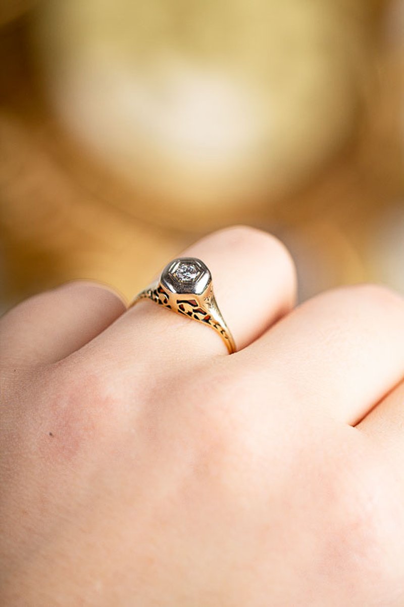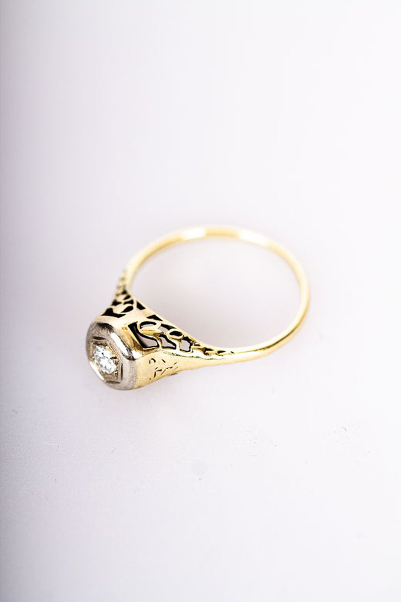 Underbar solitärring med romantiska detaljer. En gammal, unik ring som inte finns i dussintal.