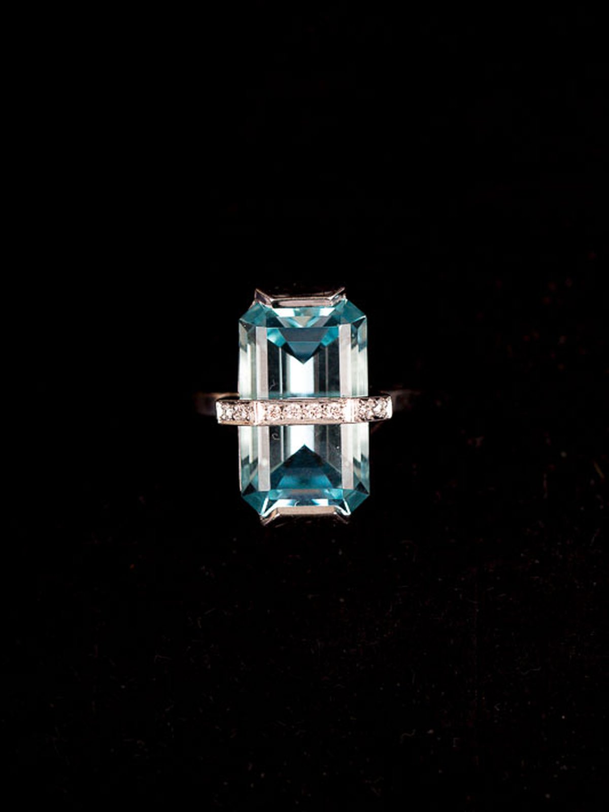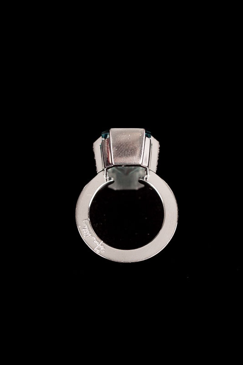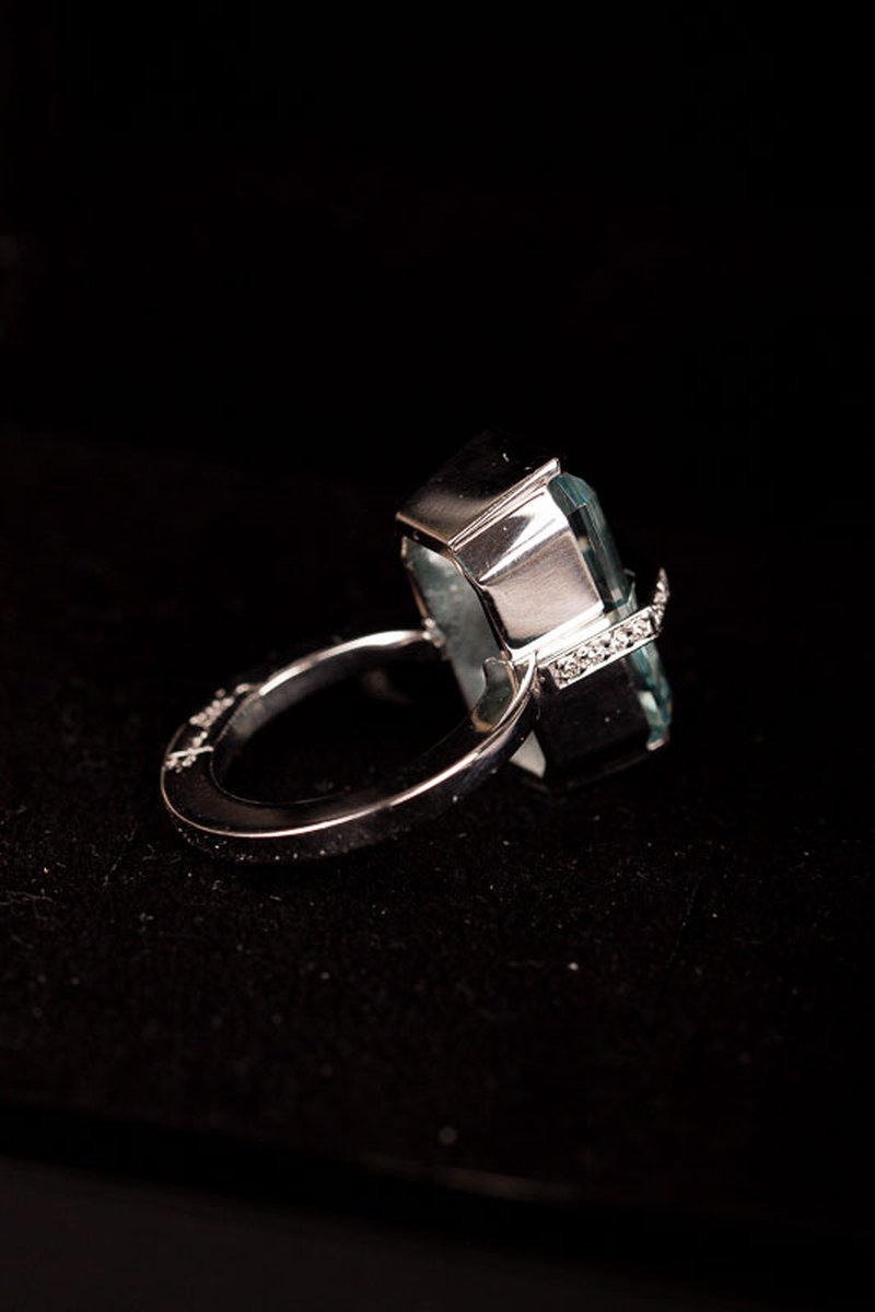 Cocktailring tillverkat i 18k återvunnet vitt guld med 8,5ct akvamarin och totalt 0,12ct diamanter. Skenan mäter 2mm bred och 3mm hög.