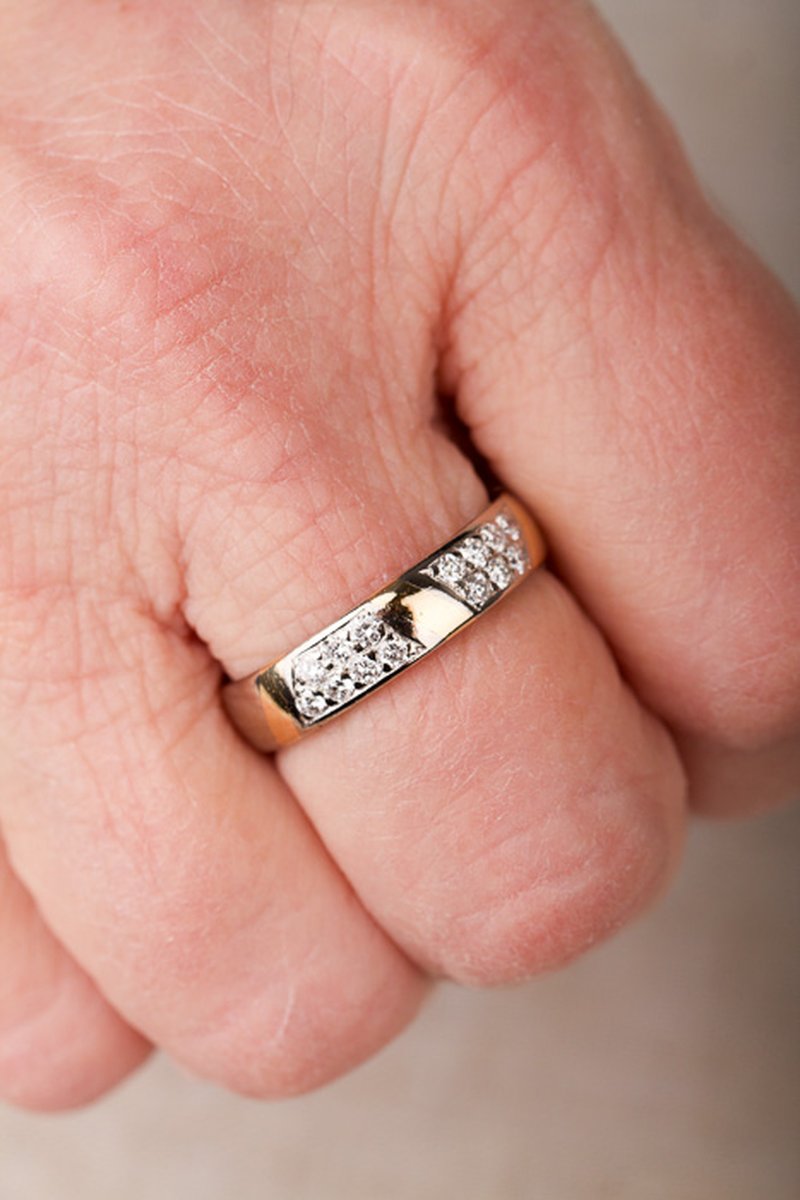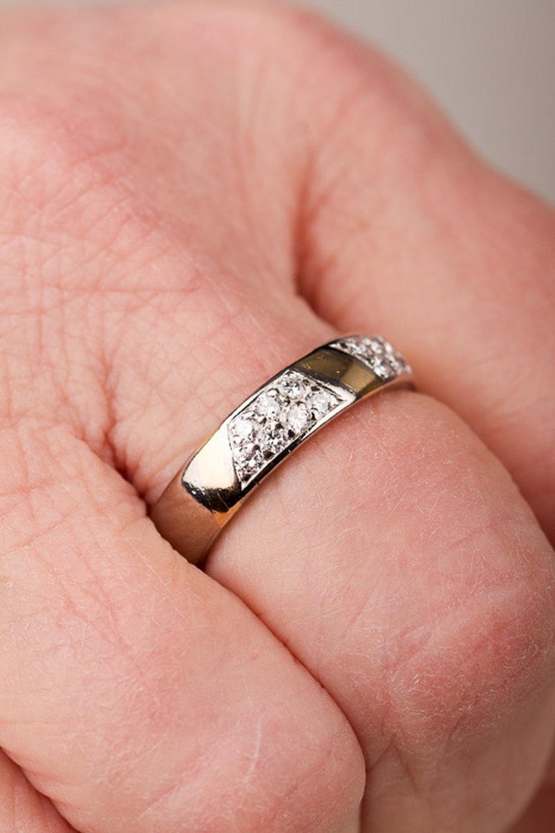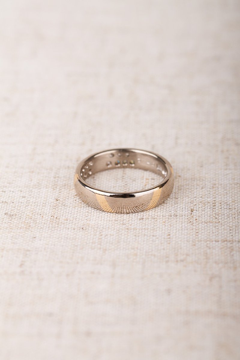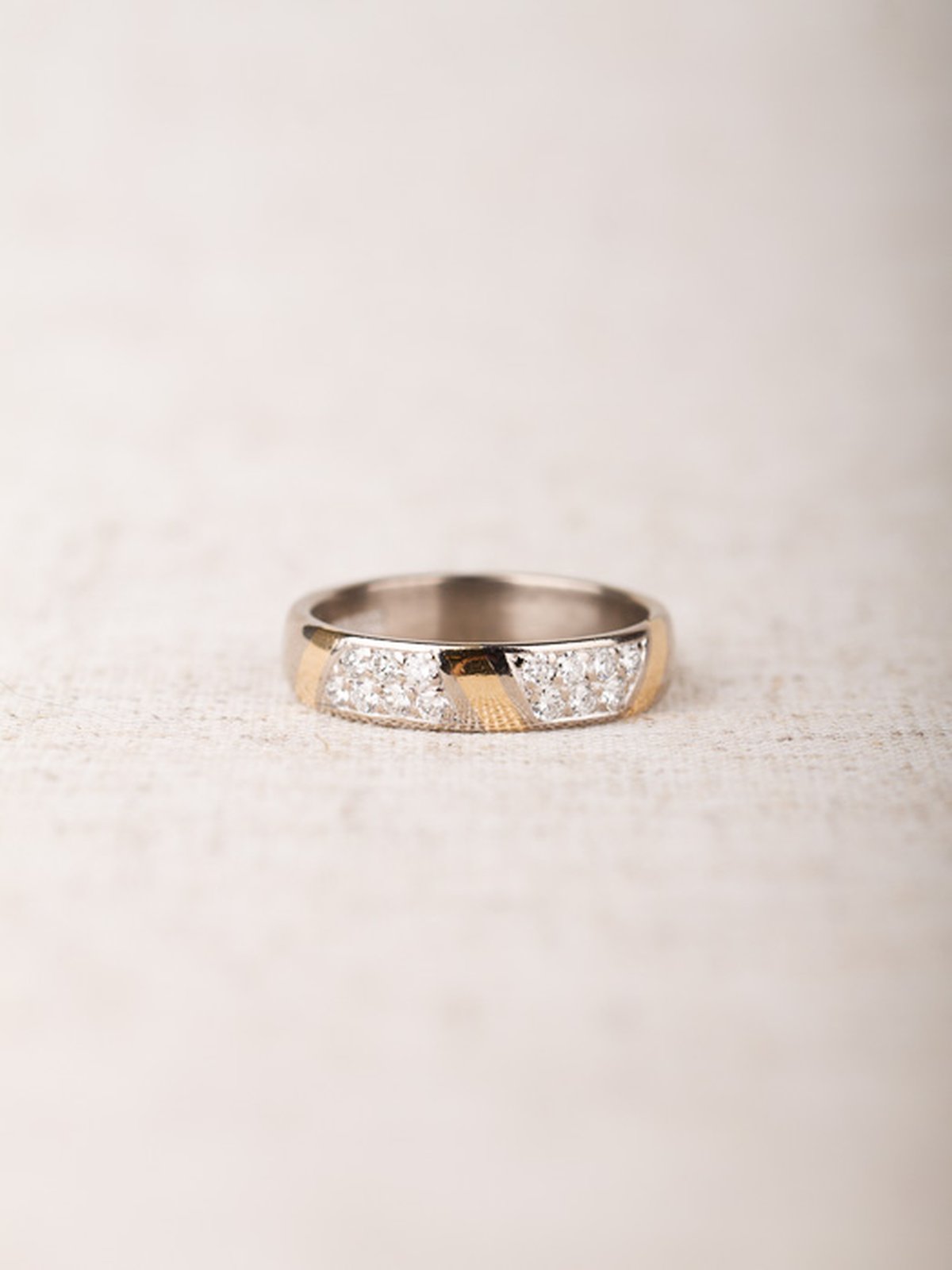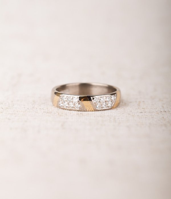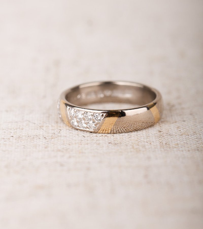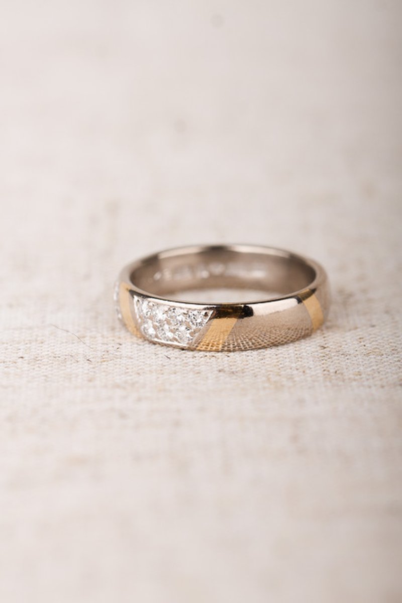 Vitguldsring med diamanter och rödguldsdetaljer.