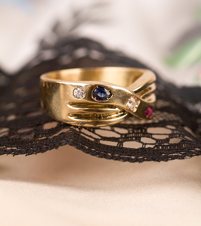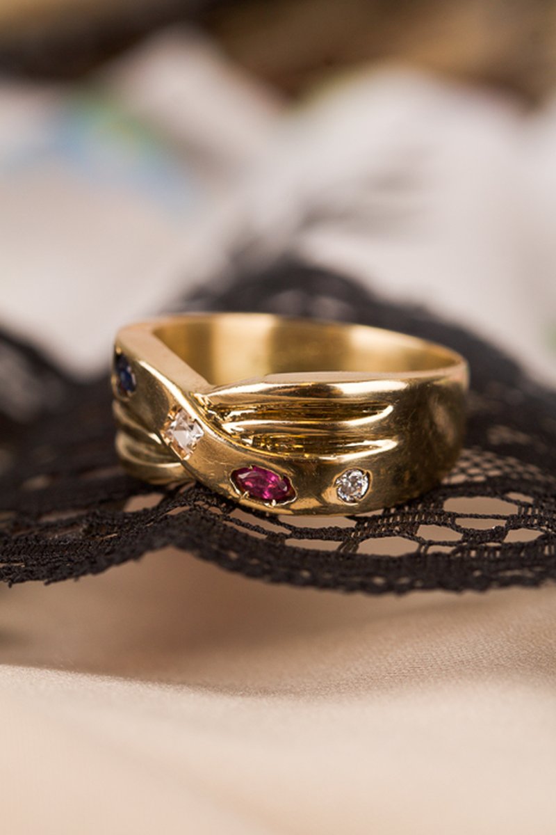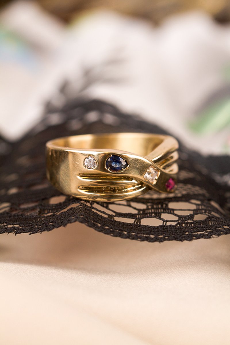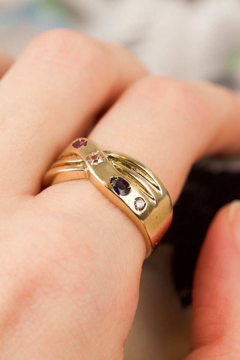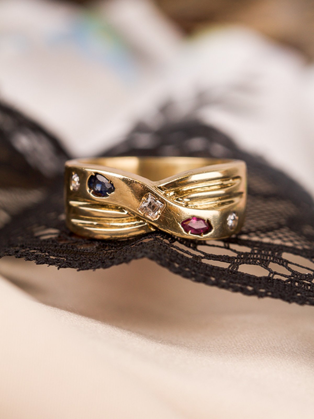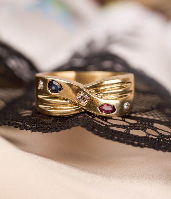 18K guld, en safir, en rubin, tre vita oäkta stenar