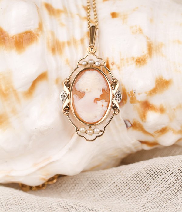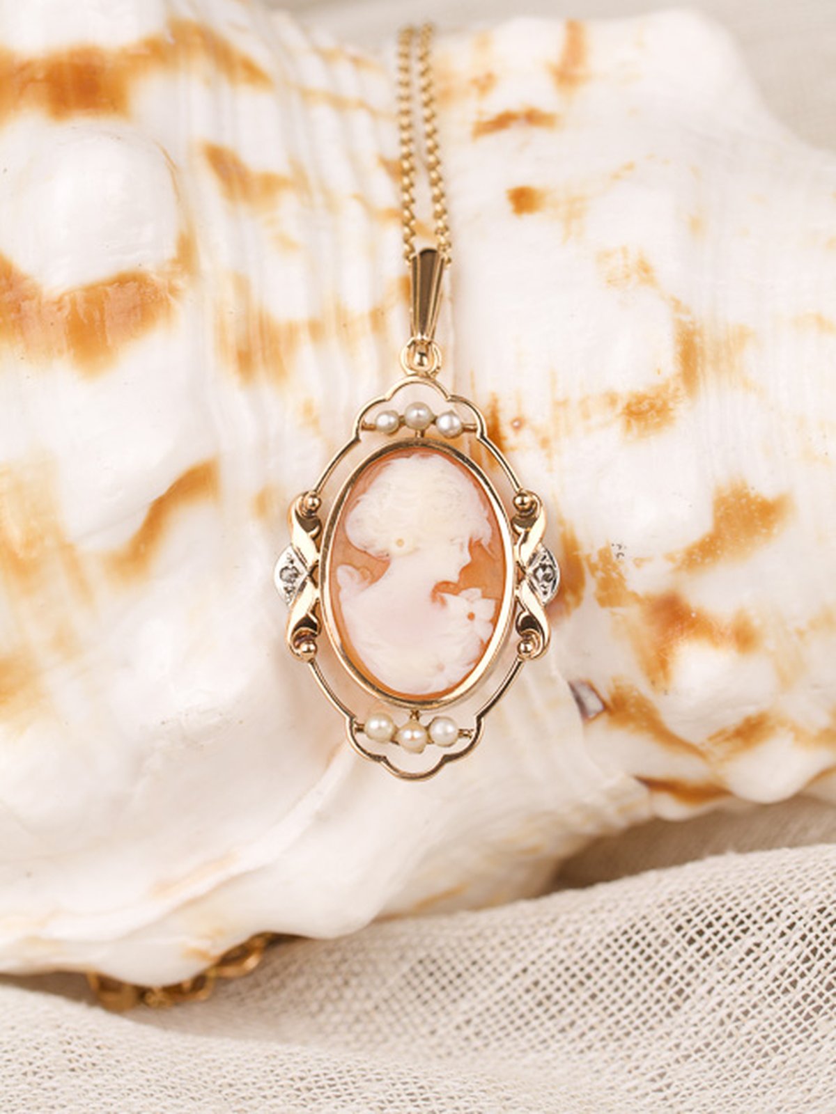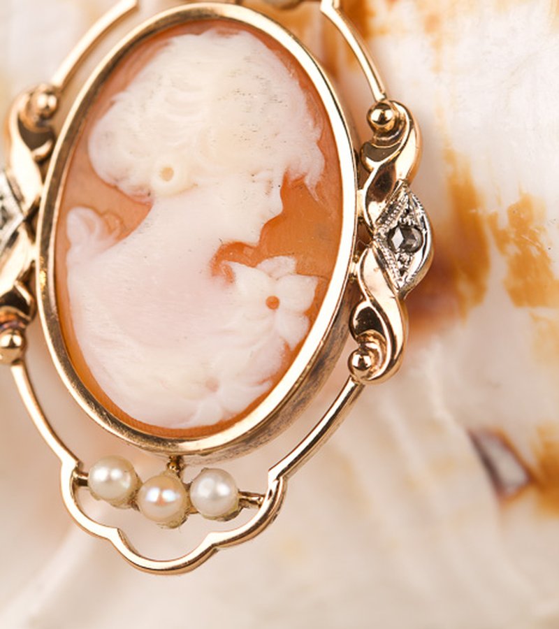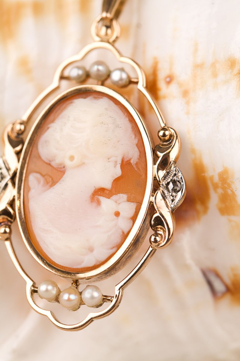 18k guld, rosenslipade diamanter 2 x 0,01 ct, odlade pärlor och camé