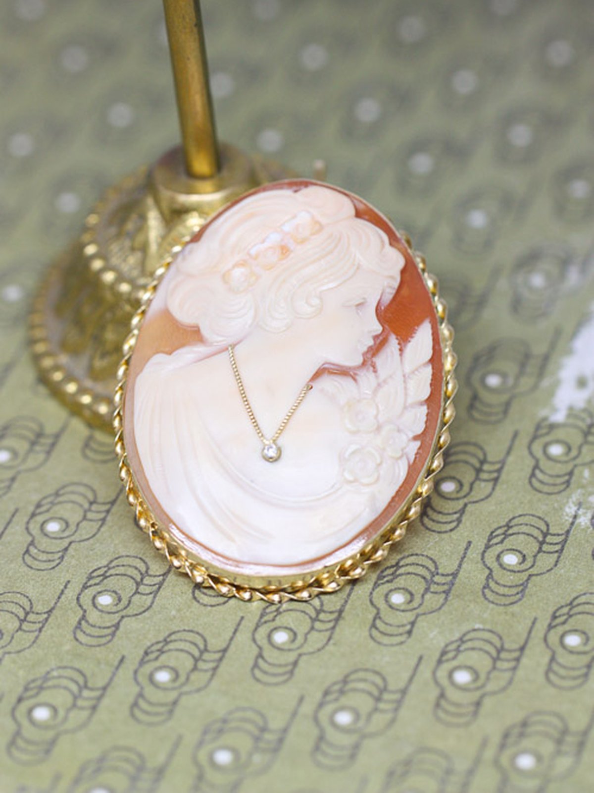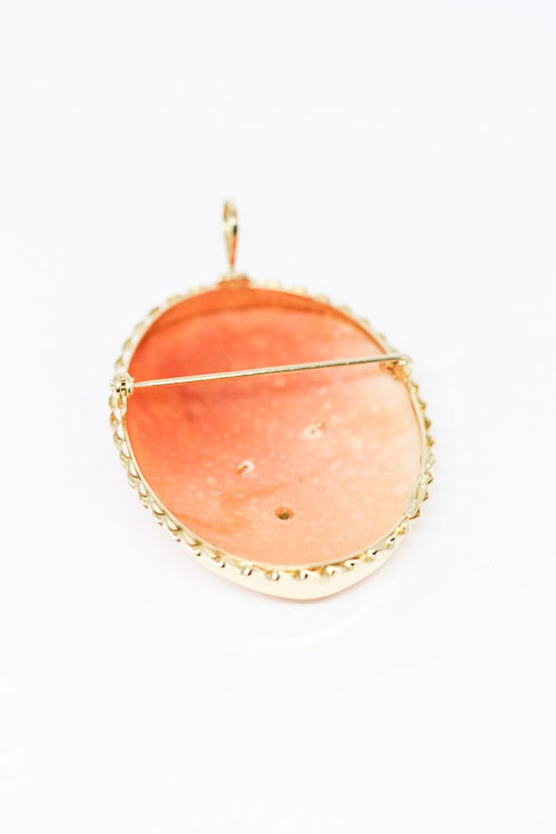 Camésmycke som går att använda både som brosch eller hängsmycke. Tvinnad guldkant runt en camédam som har ett halsband med en 0,01 ct diamant.