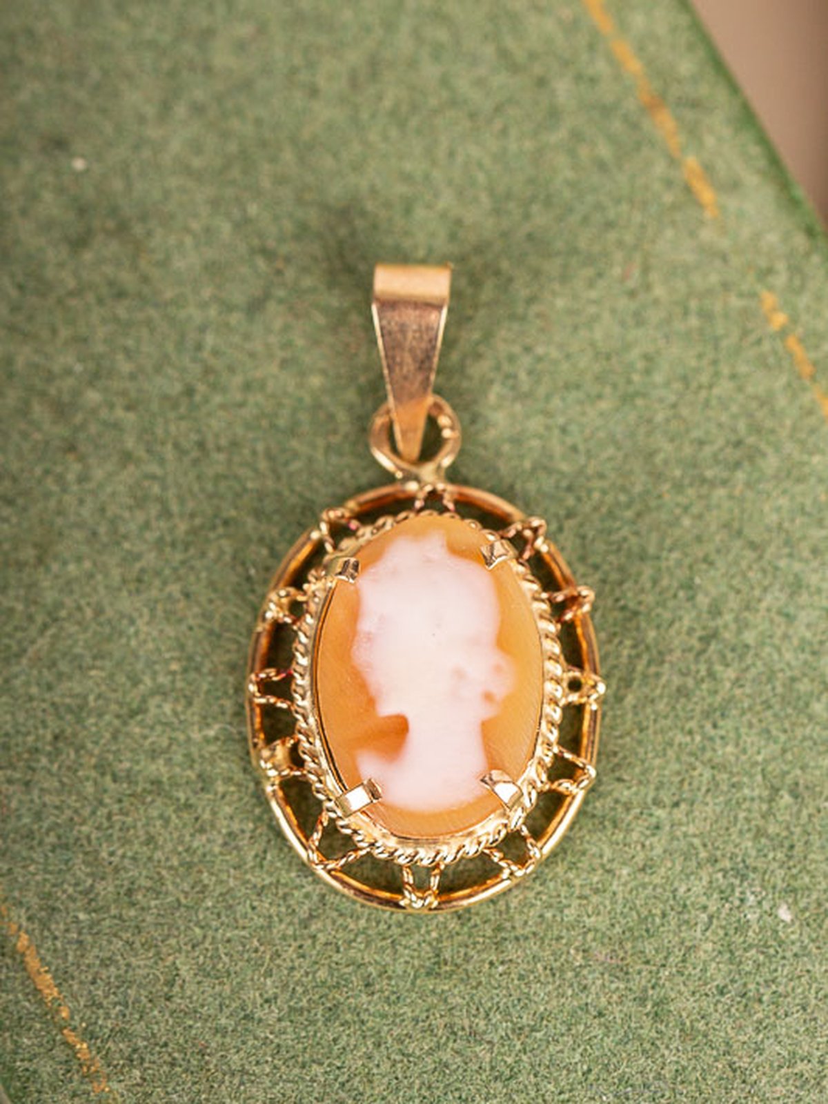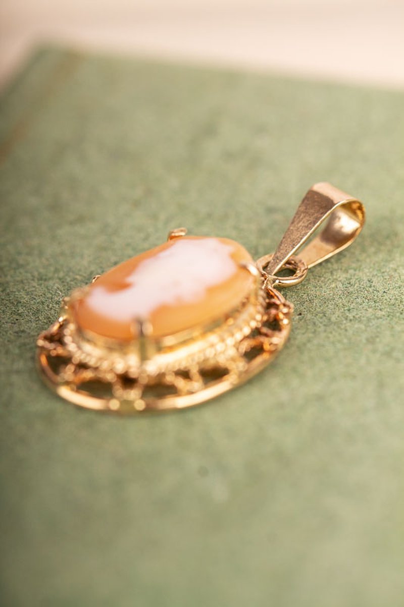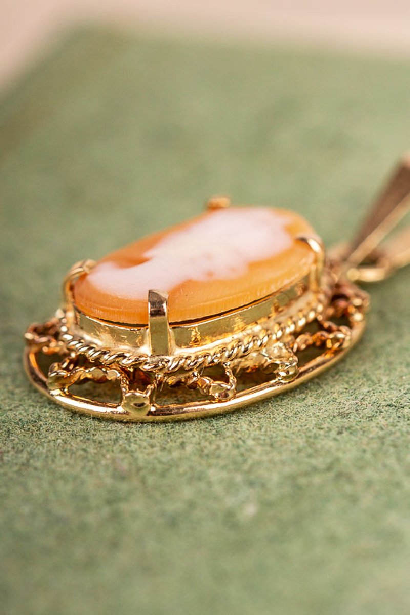 Caméhänge med dekorativ ram tillverkat i 14k guld. Vacker i lång som kort kedja.