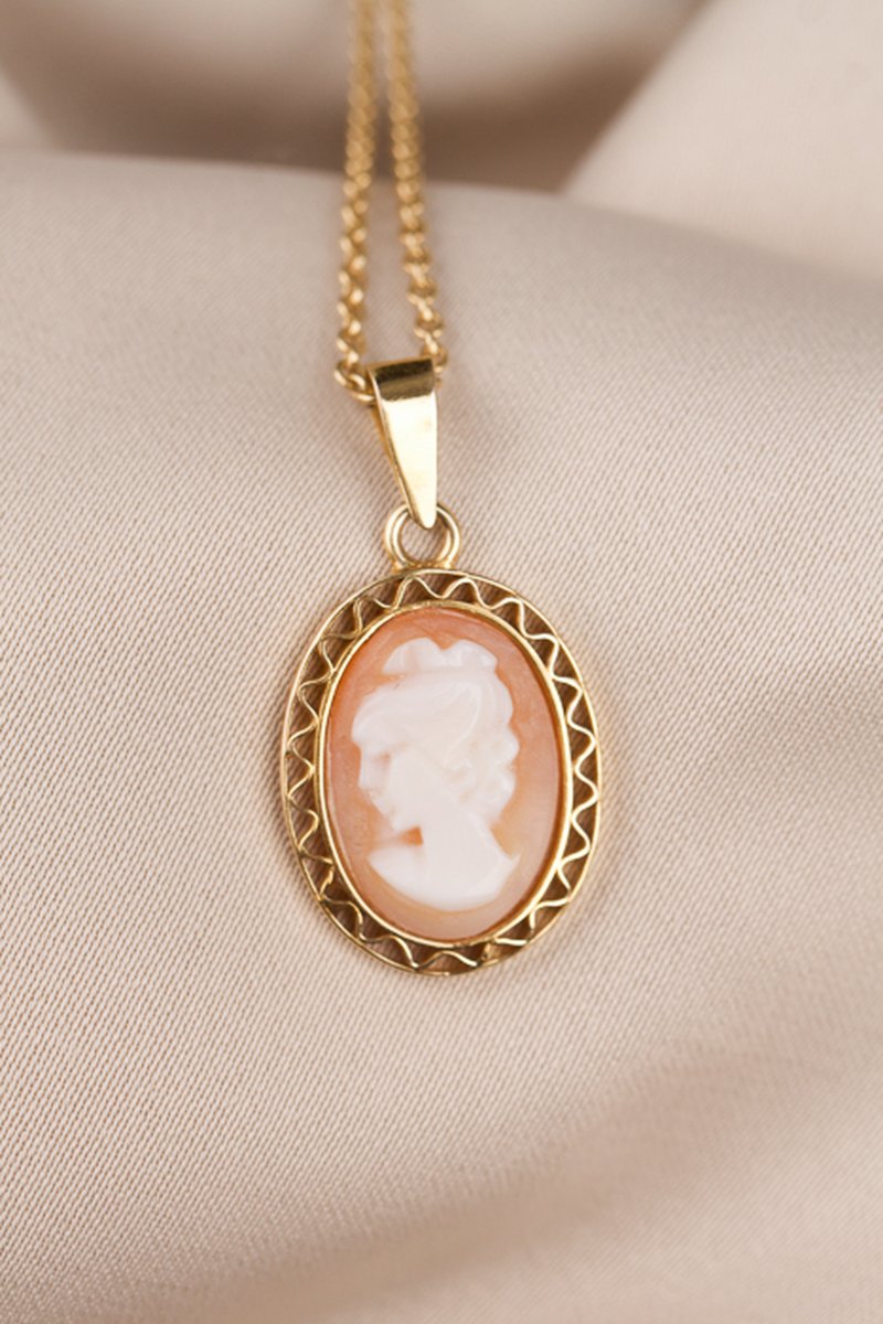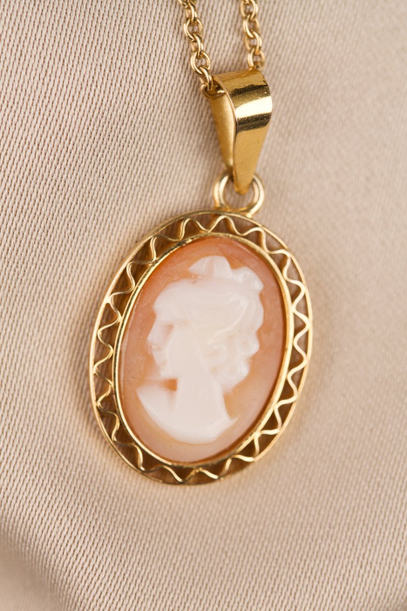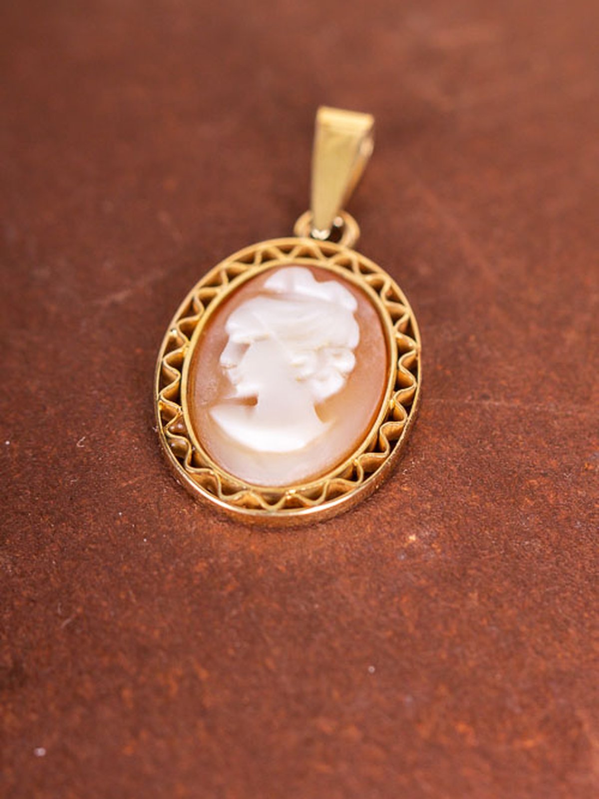 15x10mm camédam inramad i en vacker och detaljerad guldram. Mycket vacker berlock för camé-älskaren.