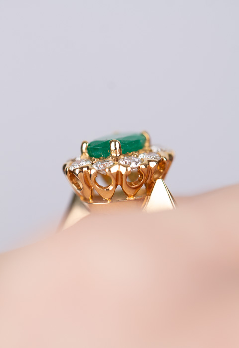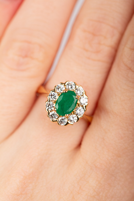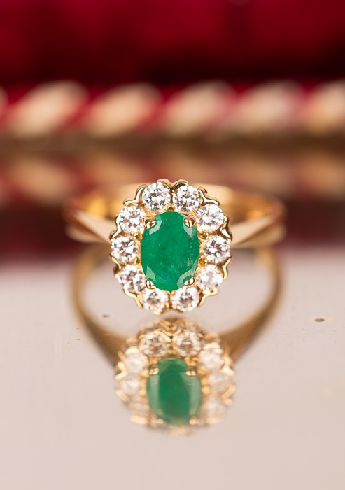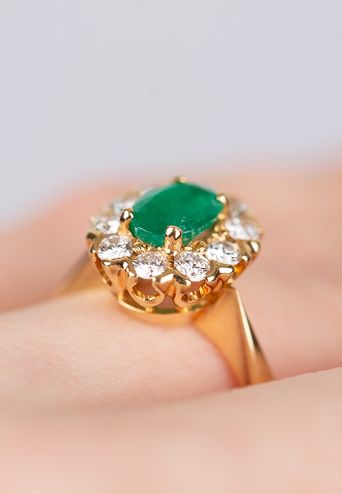 Otrolig carmouséring med en smaragd på ca 0,80 ct omsluten av fantastiska briljanter. Ringen är tillverkad av Strömdahls Juveler år 1993 och är i toppskick.