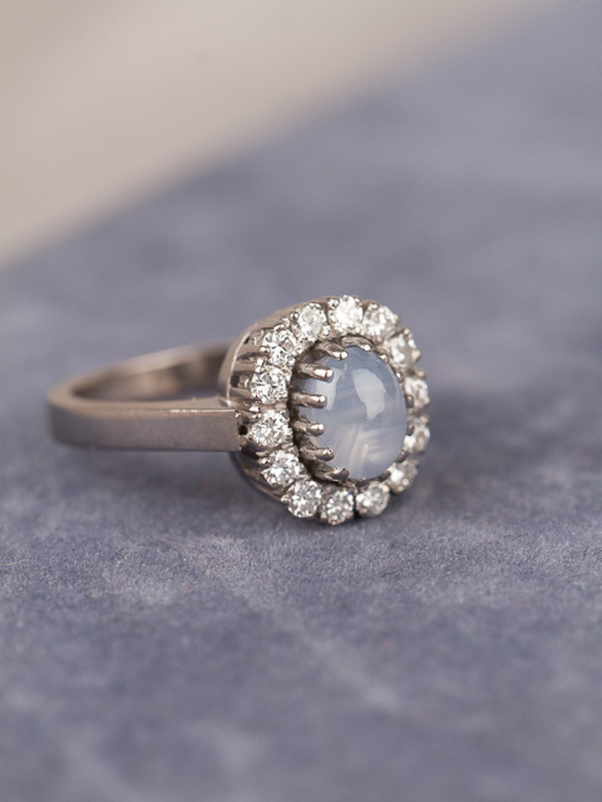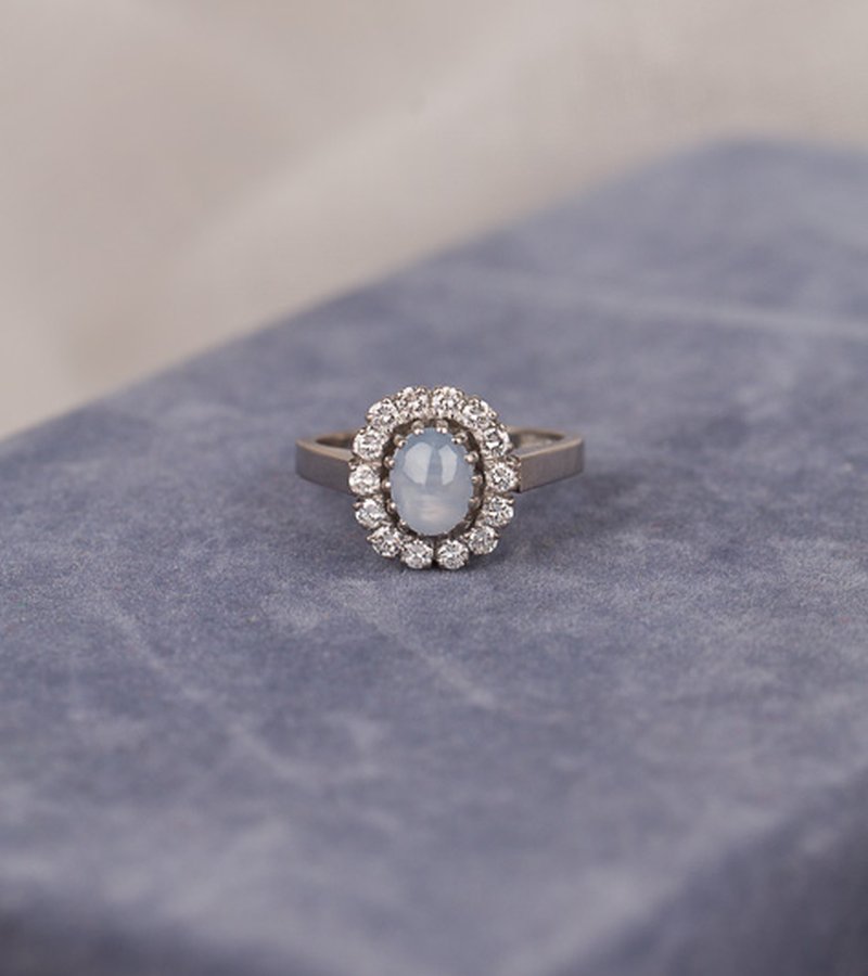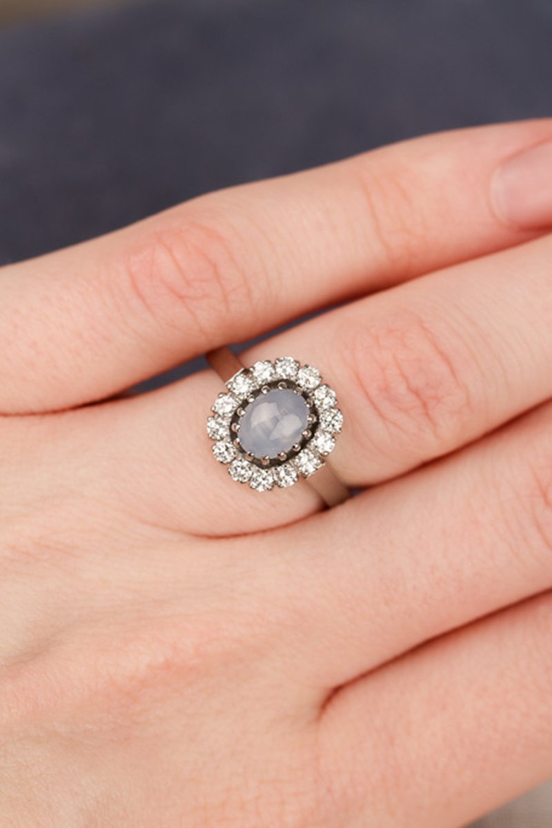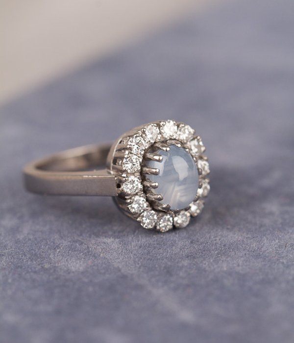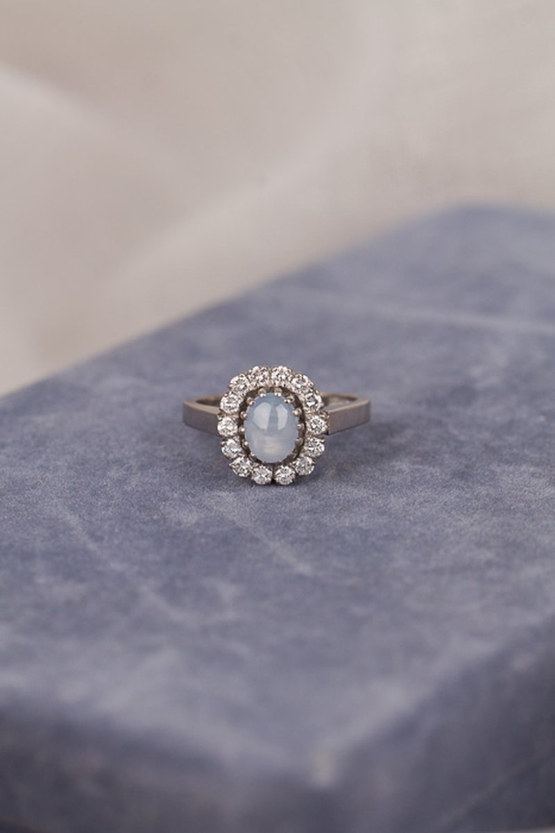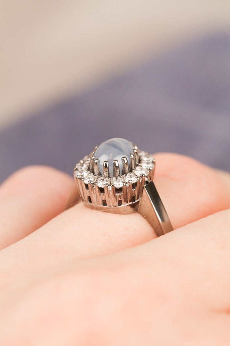 18K vitguld, stjärnsafir 7x6 mm, briljantslipade diamanter 14 x 0,03 ct