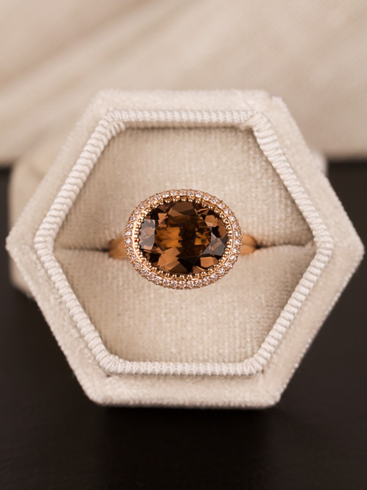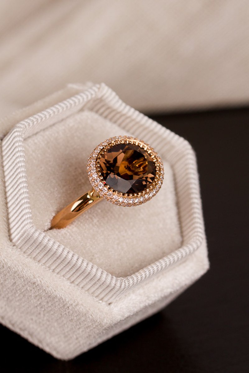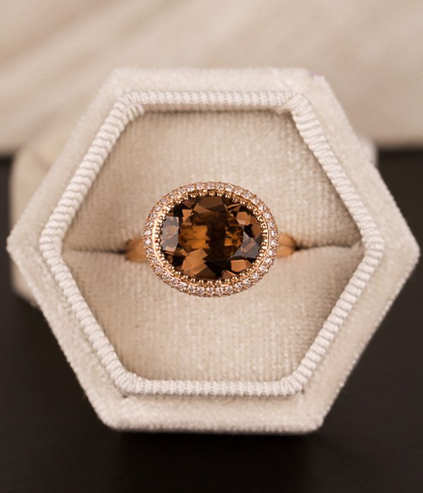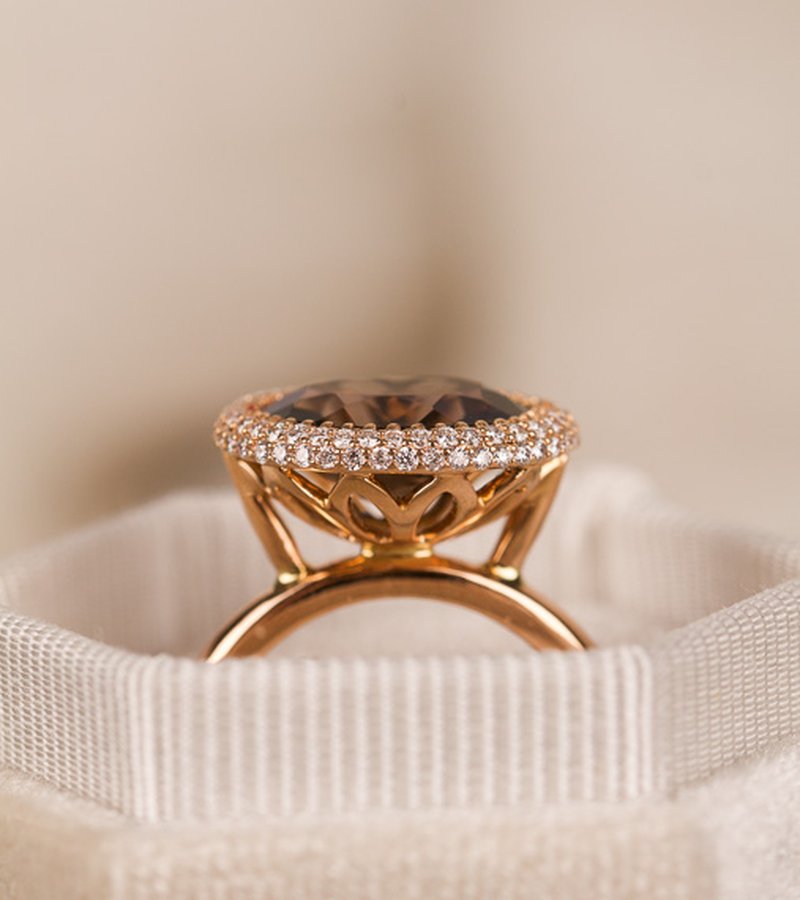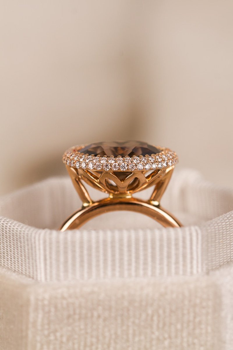 Unik cocktailring tillverkad i roséguld med en fantastisk rökkvarts i centrum. Pavéinfattade diamanter omger rökkvartsen över en spektakulär fattning undertill.