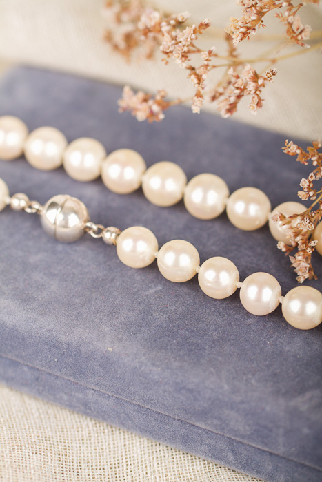 Pärlcollier förvaras bäst liggandes på en mjuk yta, dock inte av bomull. Detta torkar ur pärlorna.