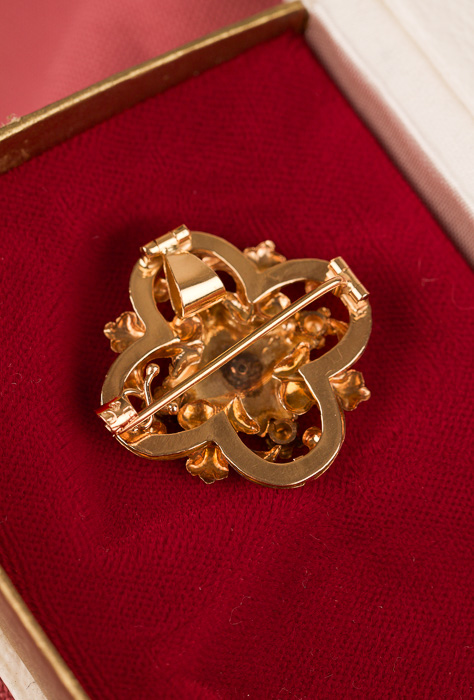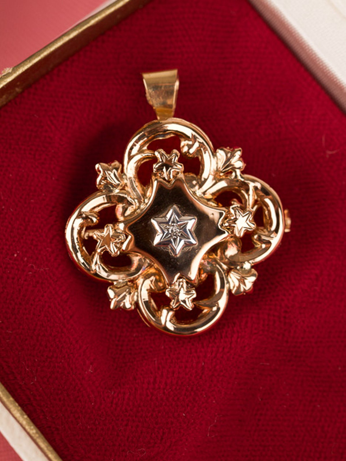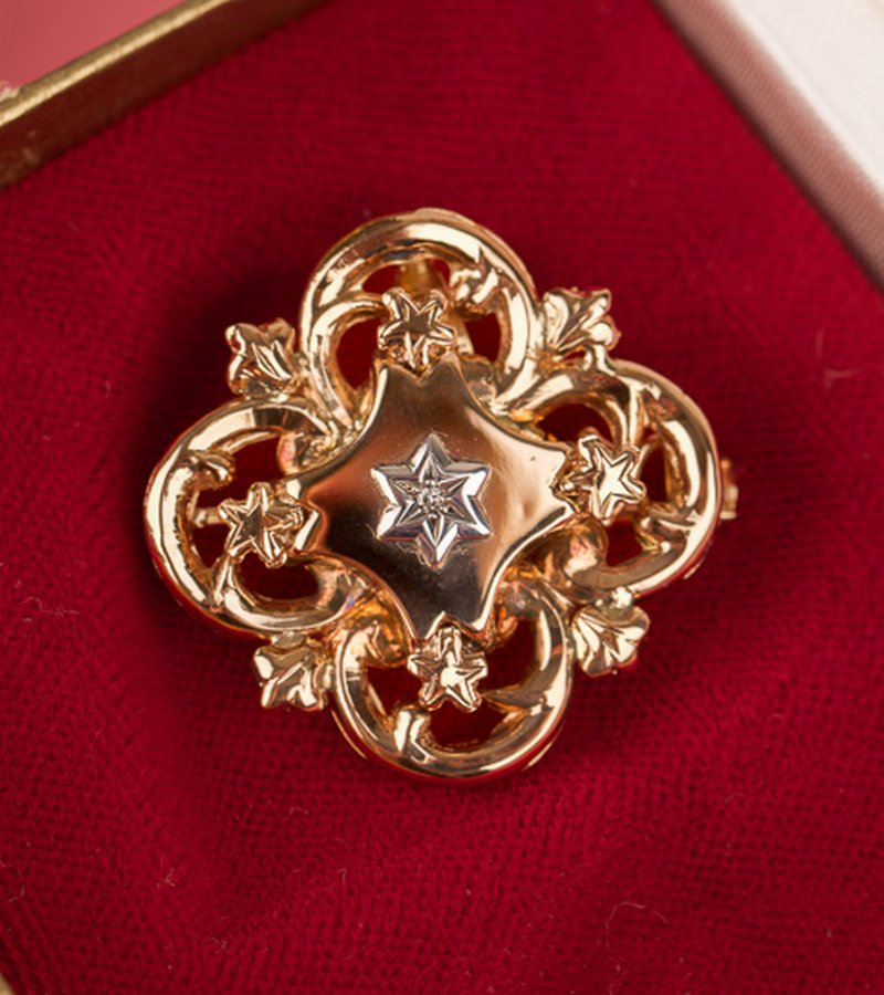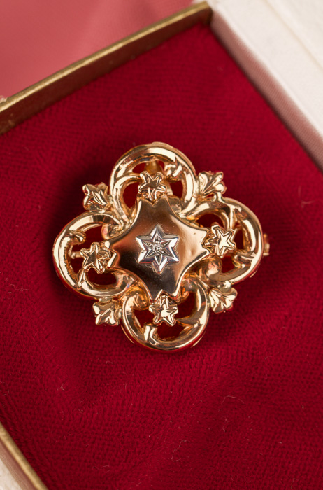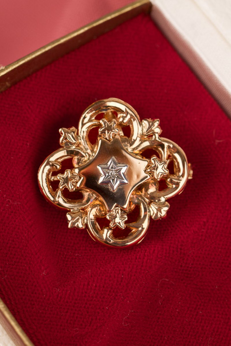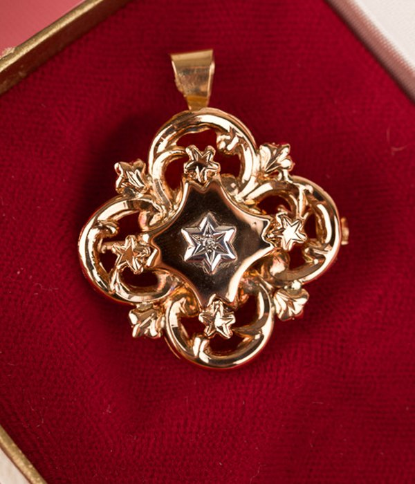Vintage-smycke som går att använda som brosch, eller som berlock om man fäller ut spetsöglan. Mycket välarbetat smycke med en diamant i mitten.