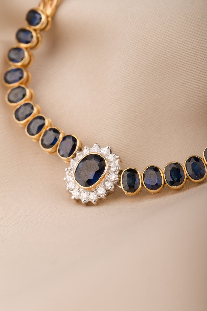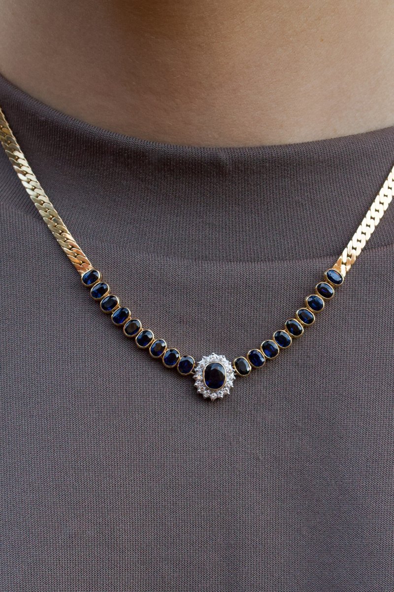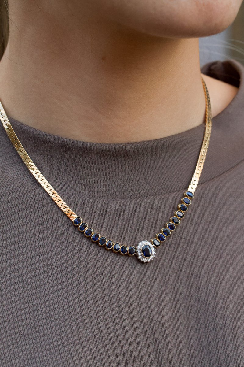 14K guld, Mörkblå safirer 1 st ca. 4,7 x 6 mm, 18 st ca.2,6 x 3,9 mm. 16 x 0,015 ct briljantslipade diamanter