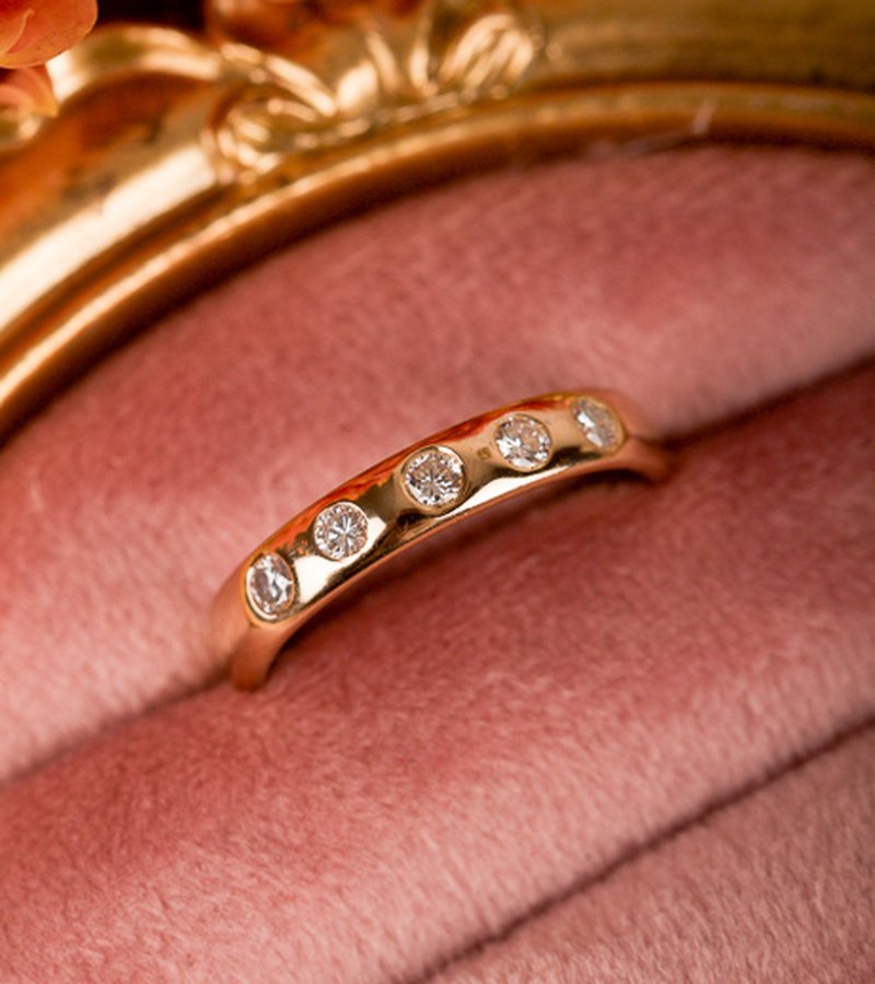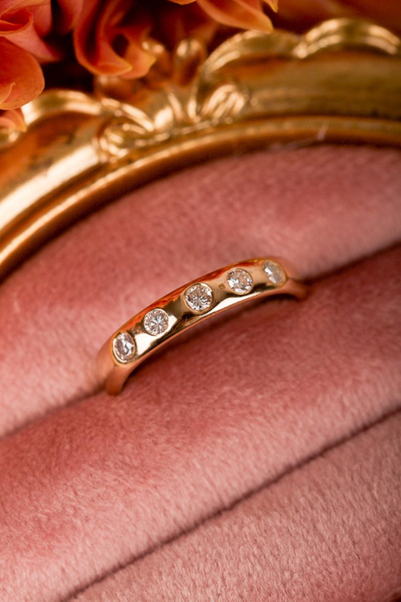 Diamantring från Schalins med fem stycken lordinfattade diamanter på 0,05 ct/st. Ringen går bra att öka i storlek.