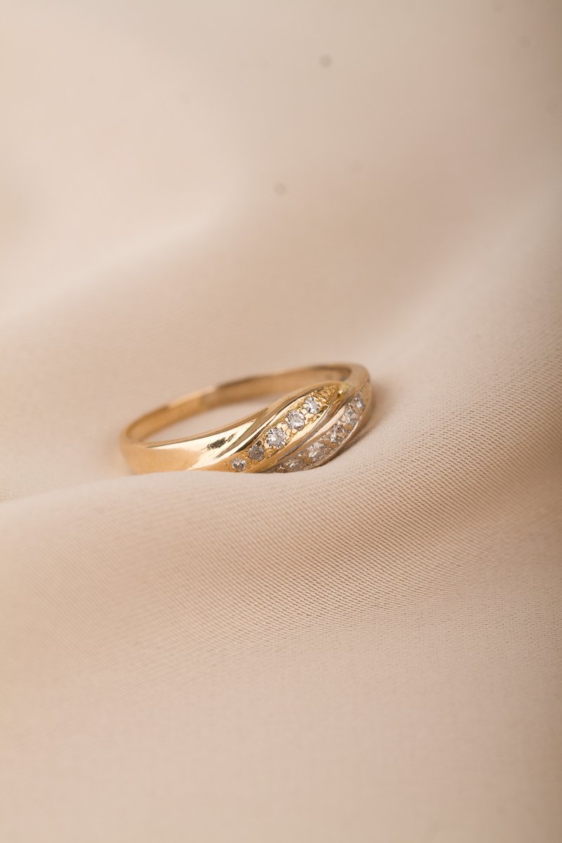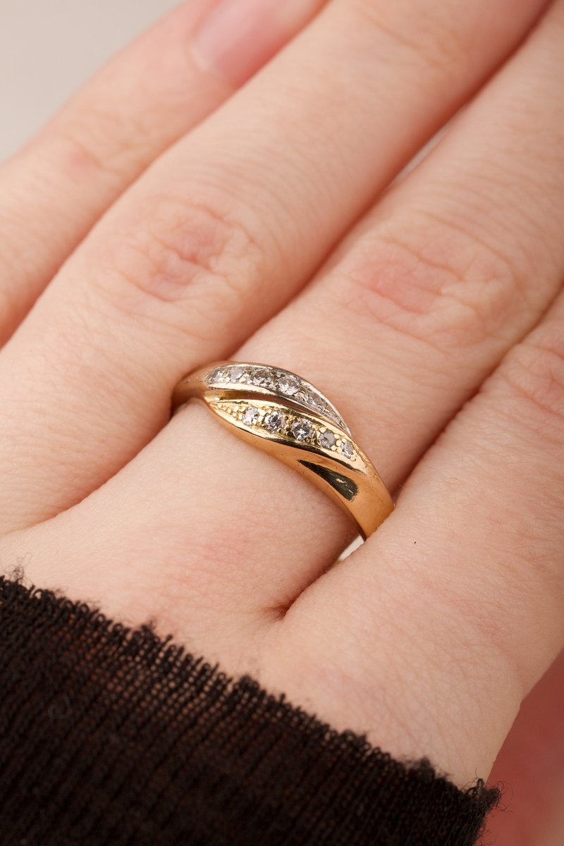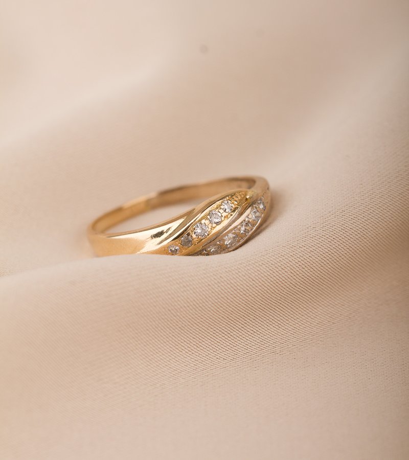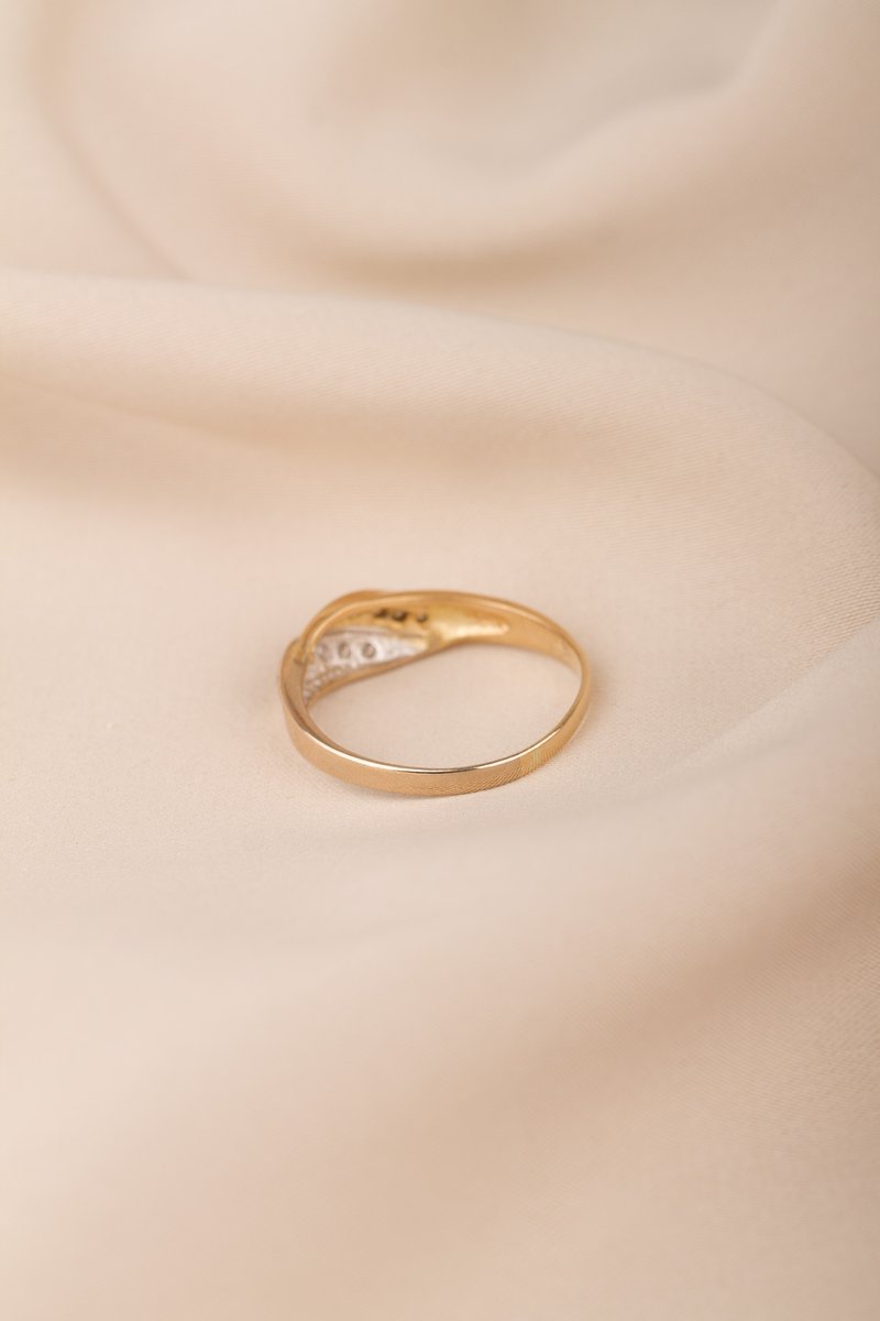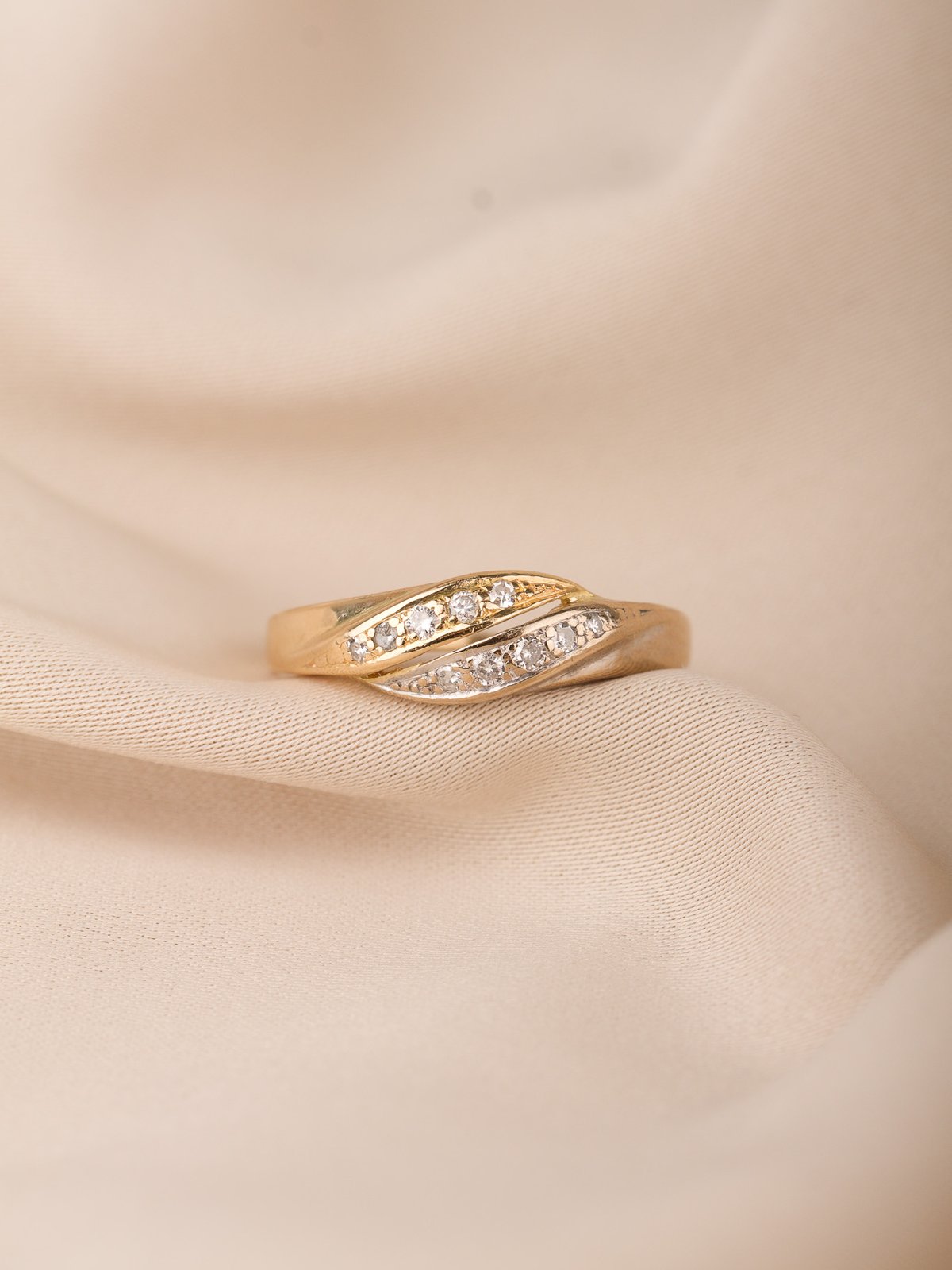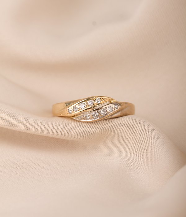 Diamantring med totalt 0,09 ct där halva skenan är i vitguld och halva i gult guld.