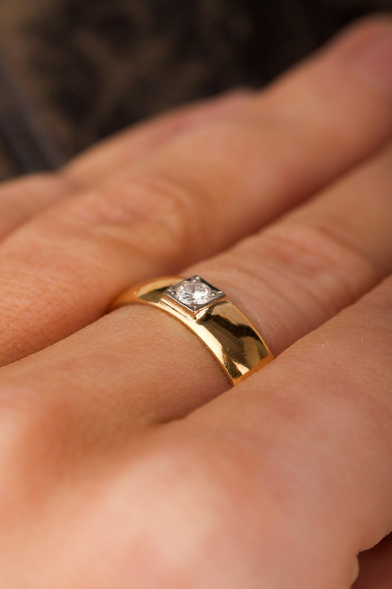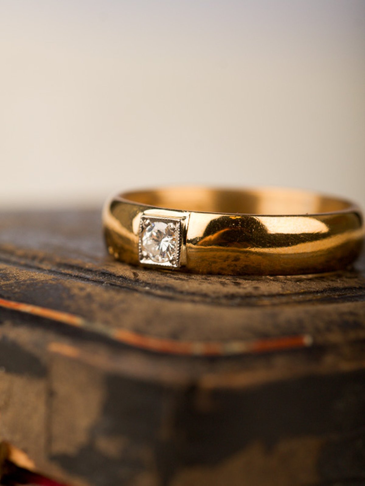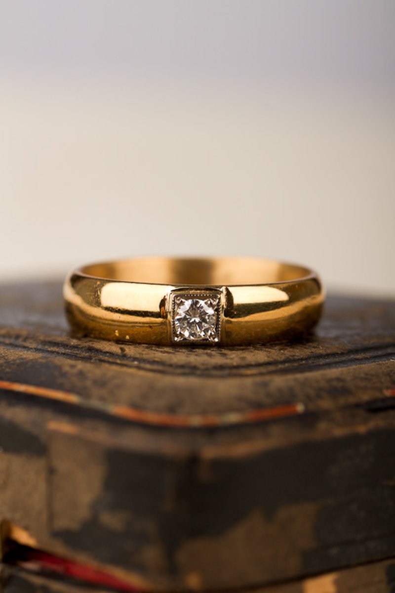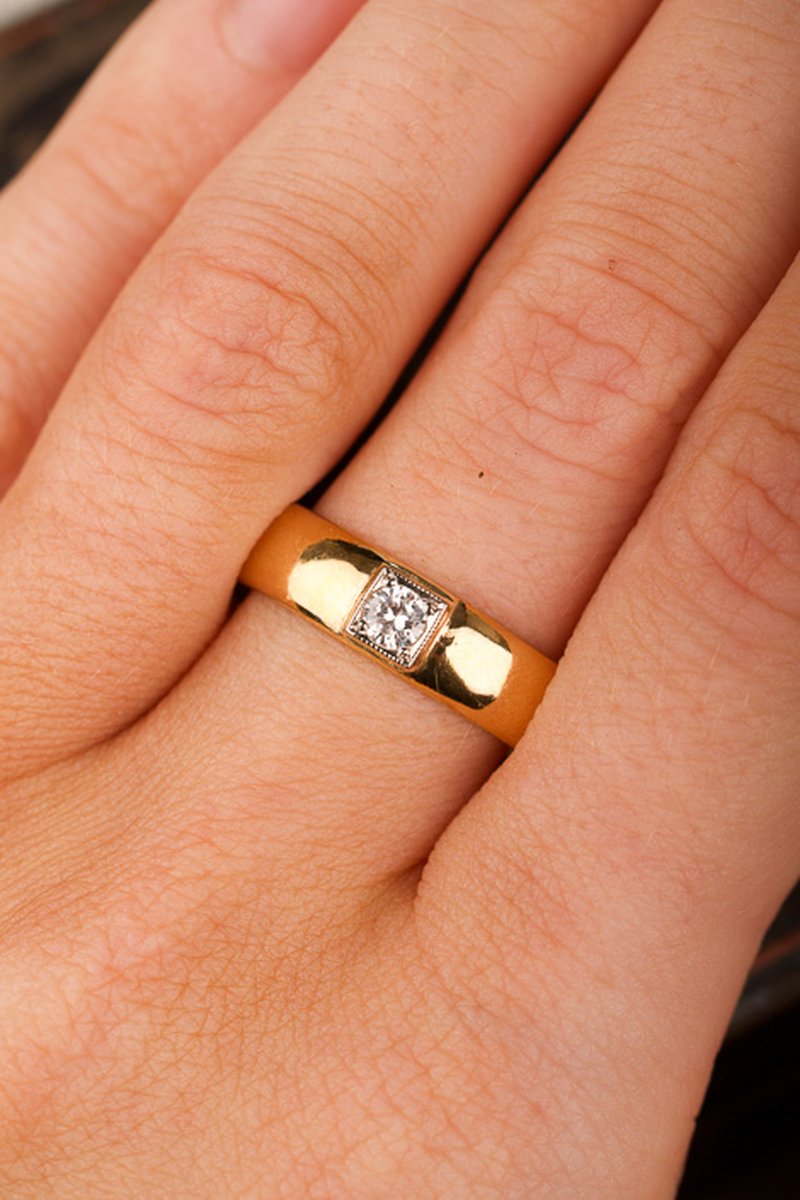 Fin guldring med en diamant som är lågt infattad med miligriff-detaljer.