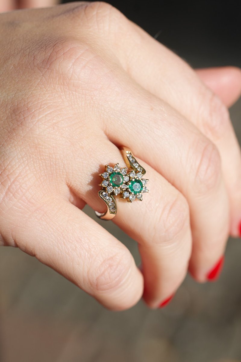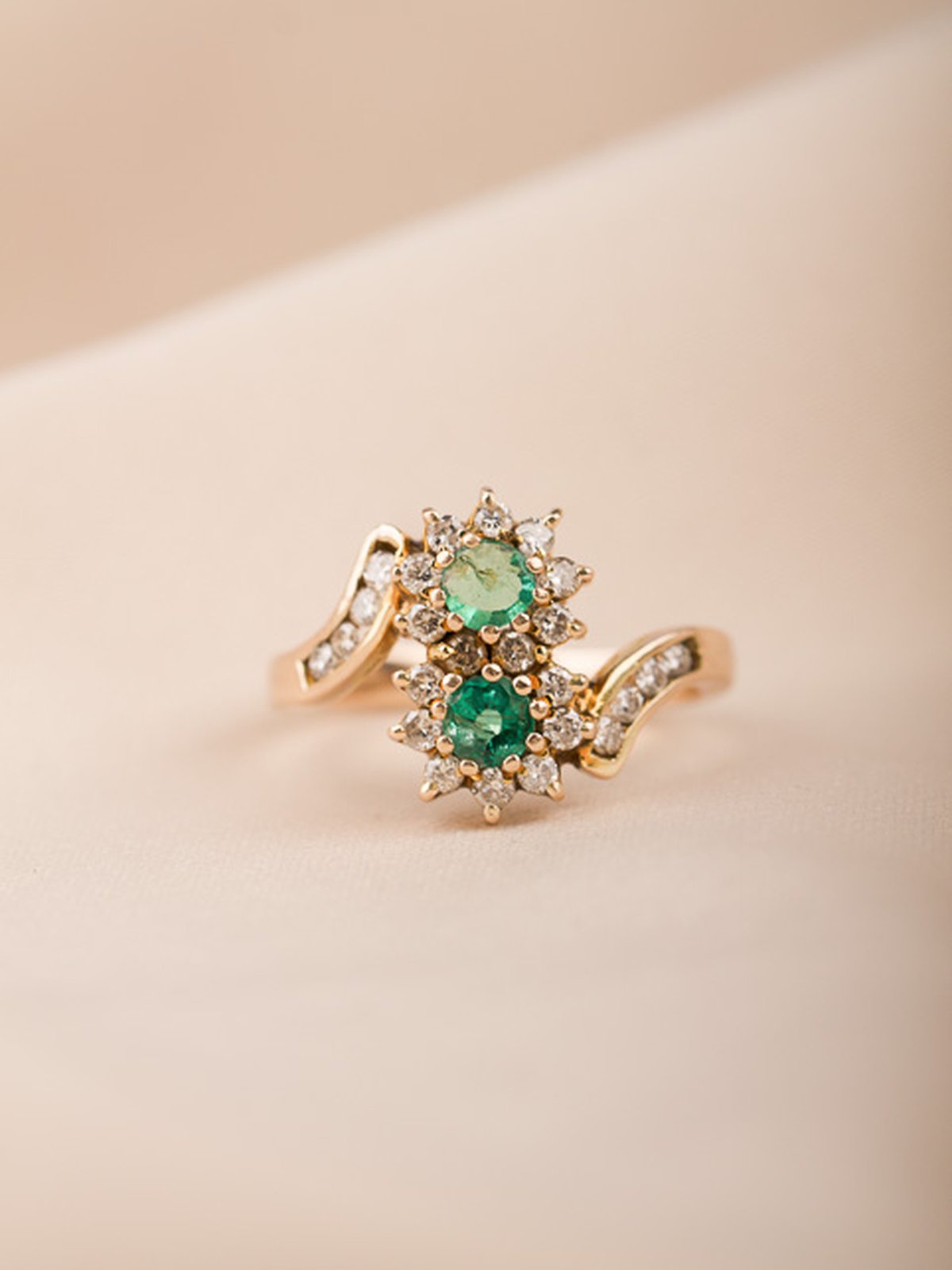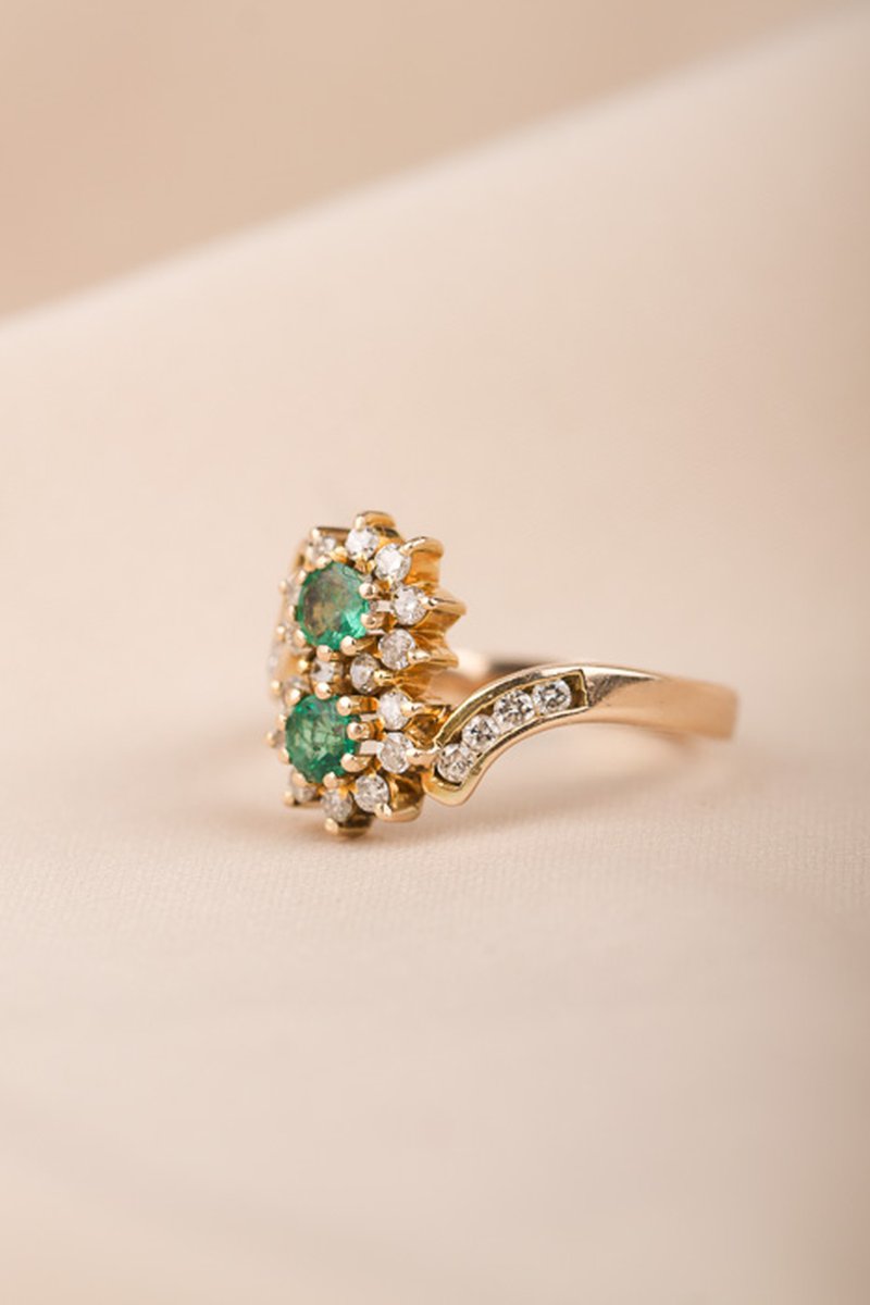 14K guld, Smaragder 2 st a 3,8 mm. Briljantslipade diamanter 26 x 0,02 ct