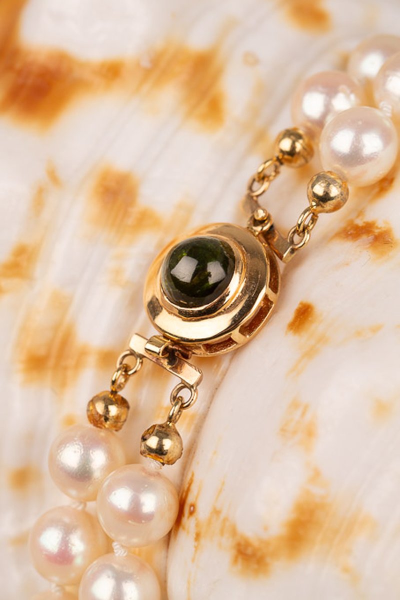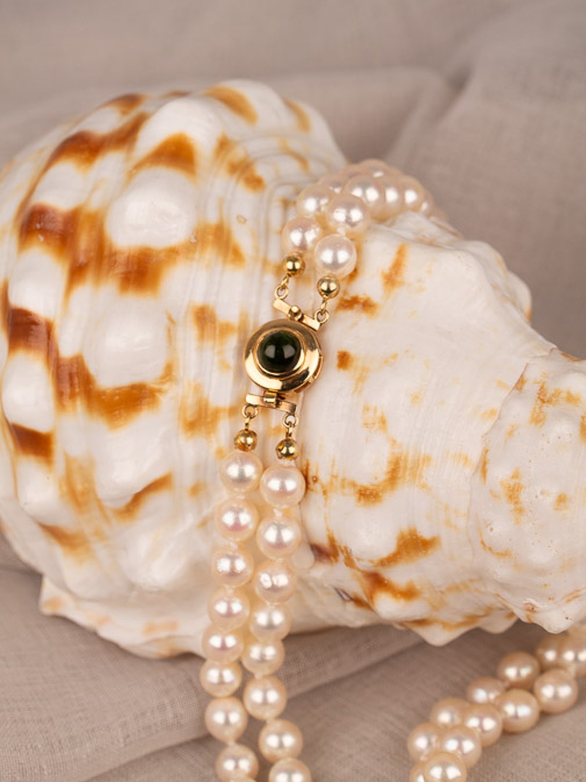 18K guld, 97 st odlade pärlor ca 8 mm, grön turmalin