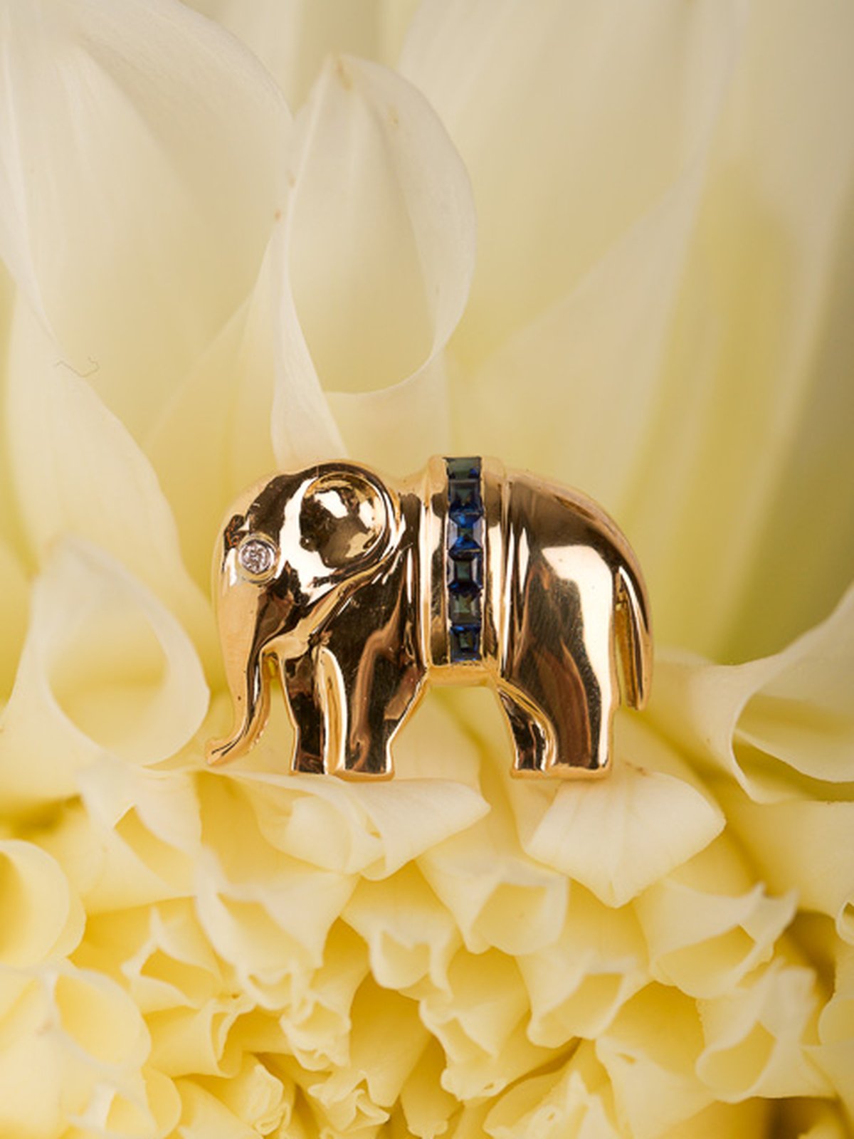 Underbar berlock i form av en safirbeklädd elefant. Ögat på elefanten är en diamant.