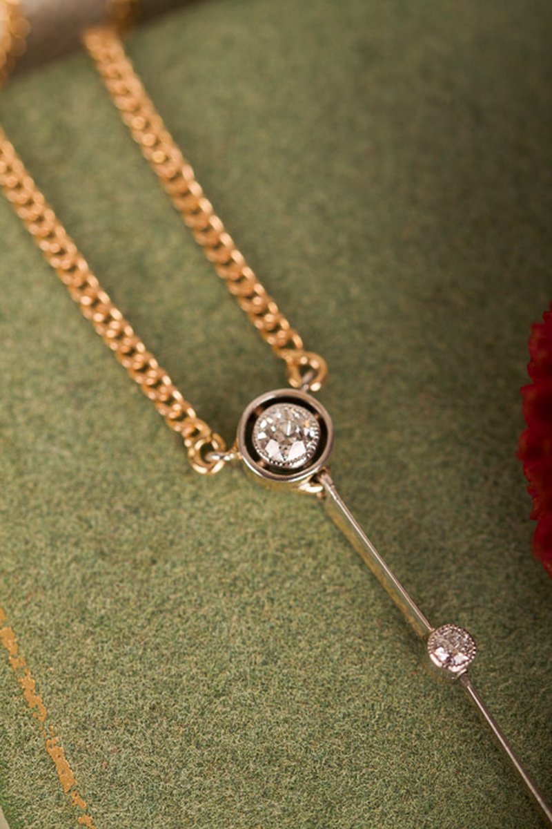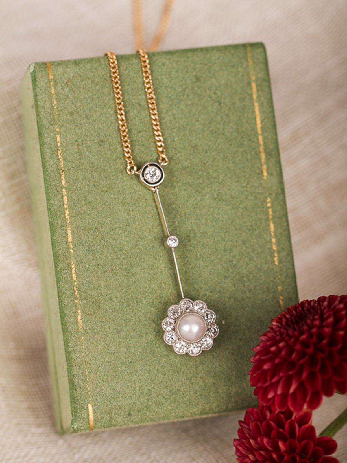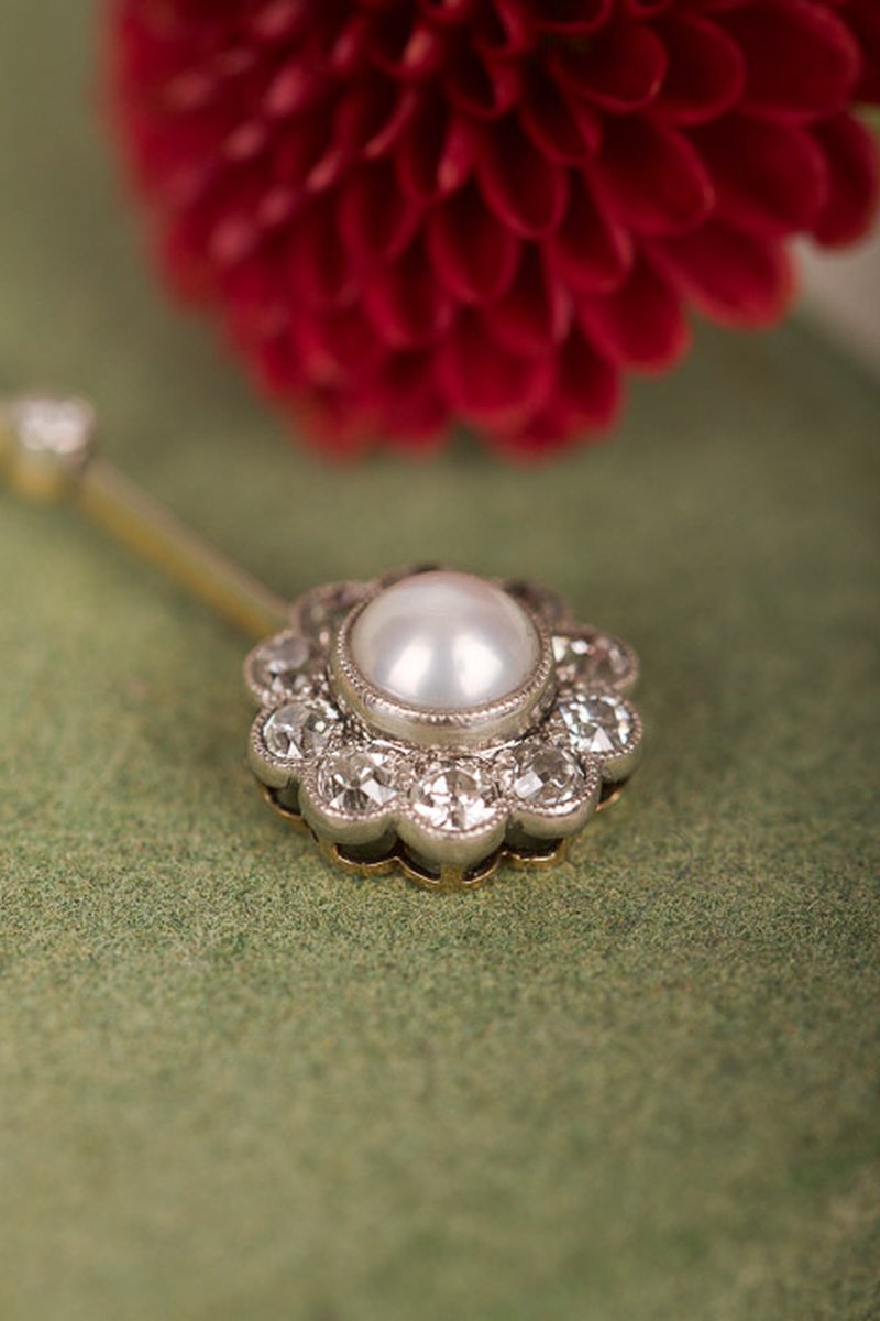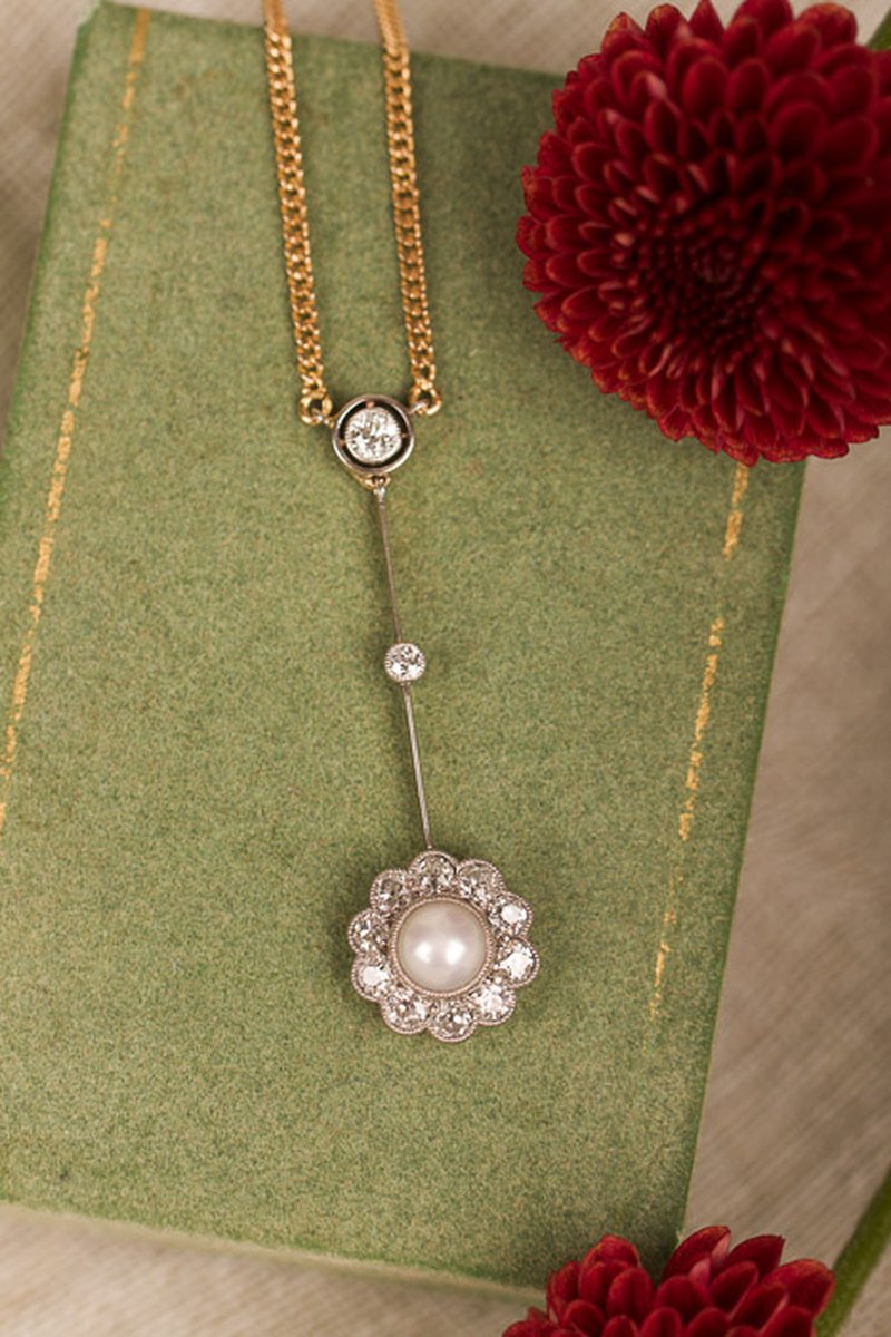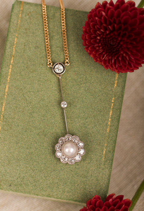 Romantiskt halsband med fantastiskt dejtalarbete. Gammelslipade diamanter omsluter den äkta pärlan, smycket är tillverkat i 18K guld med miligriff-detaljer i silver. Jättefint skick!