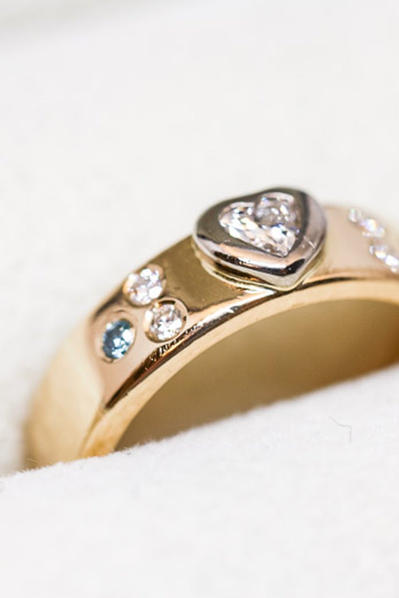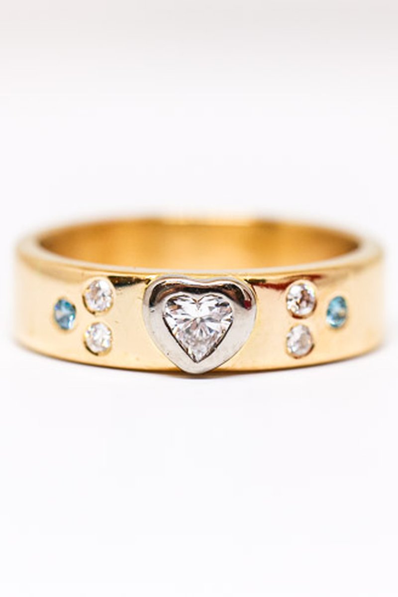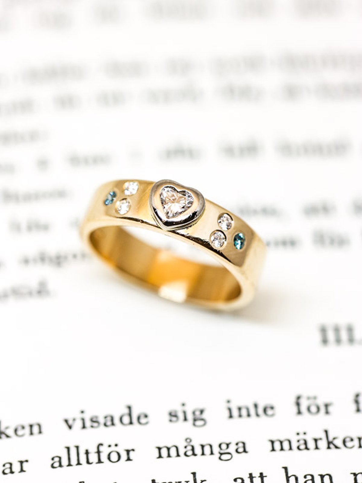 Romantisk ring med både blå stenar och diamanter. Mittstenen är en hjärt-slipad diamant infattad i vitguld.