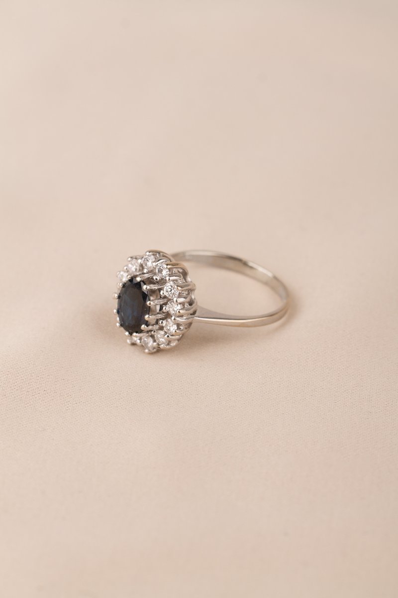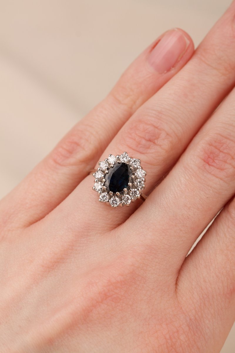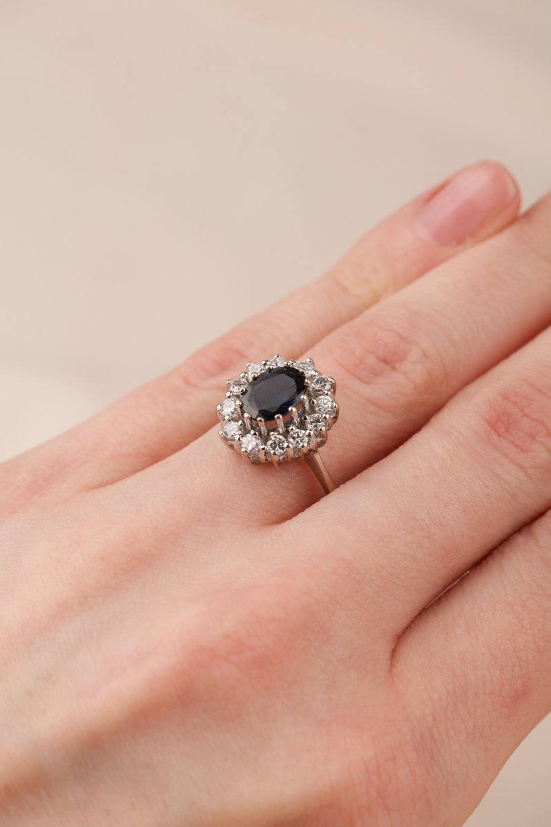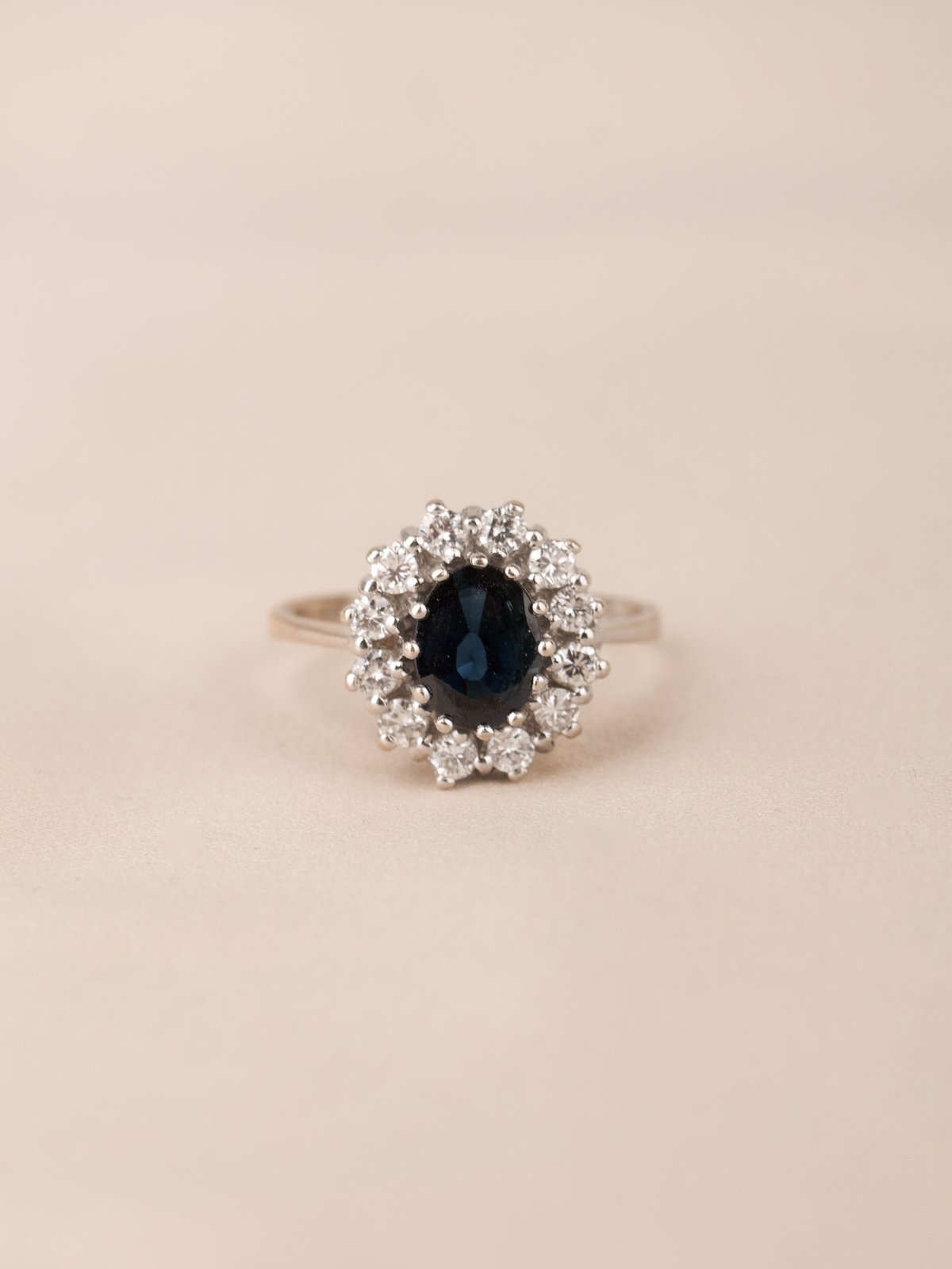 18K guld, Oval safir ca 8 x 6 mm, 12 x 0,04 ct åttkantsslipade diamanter