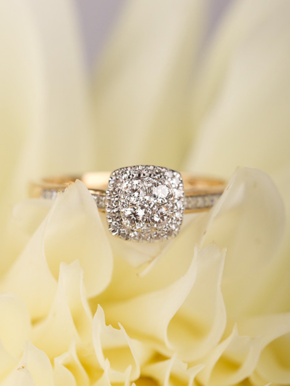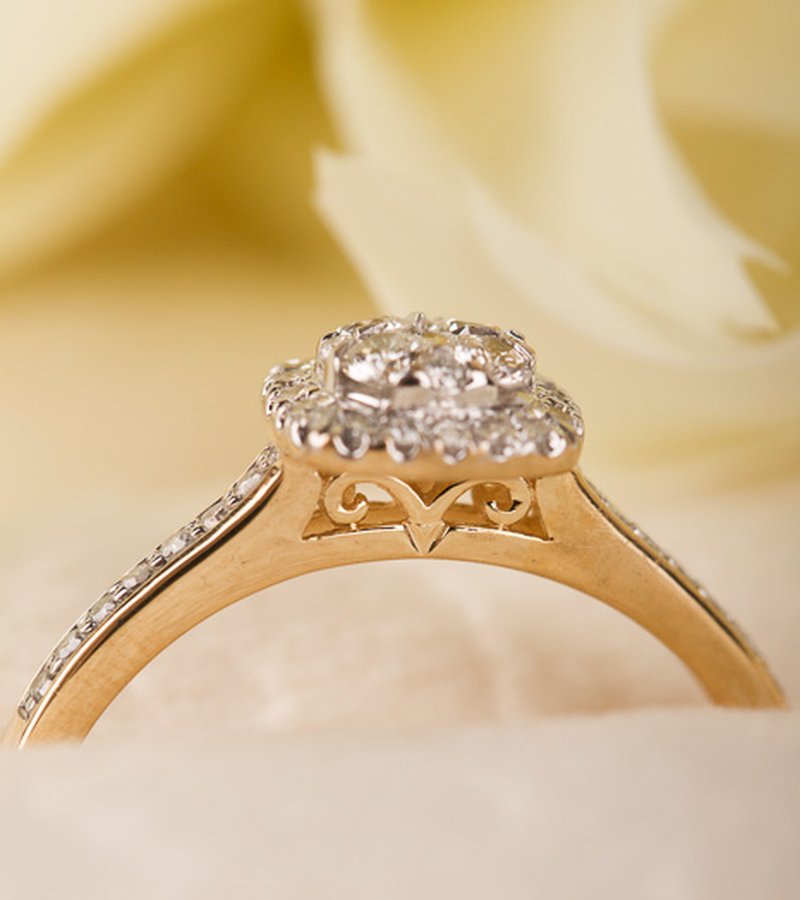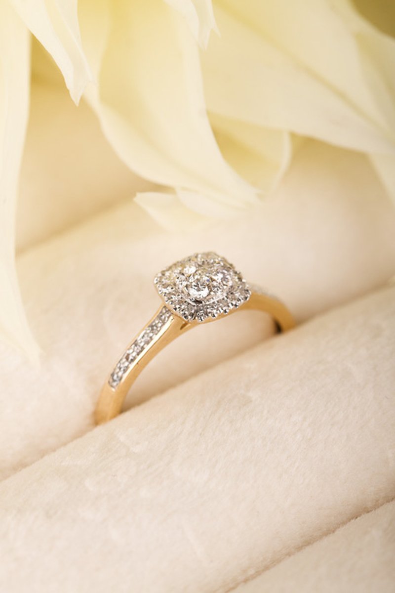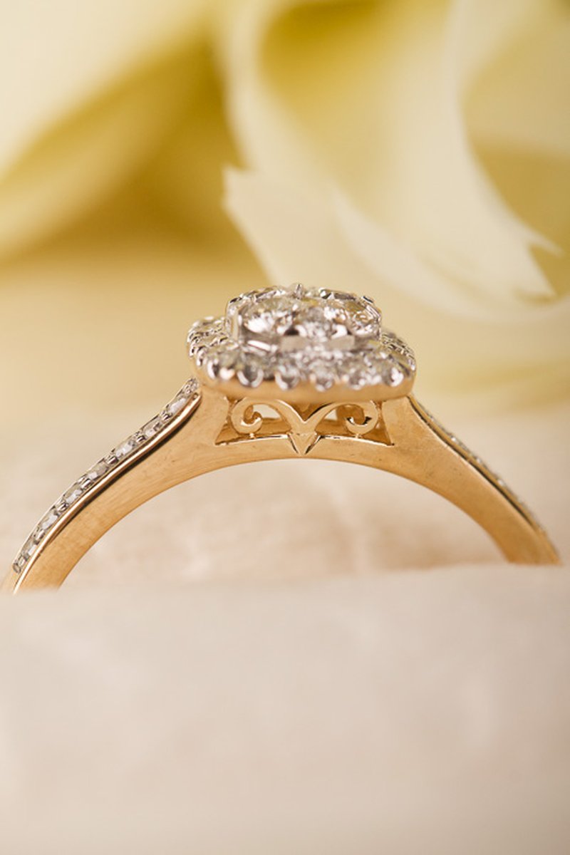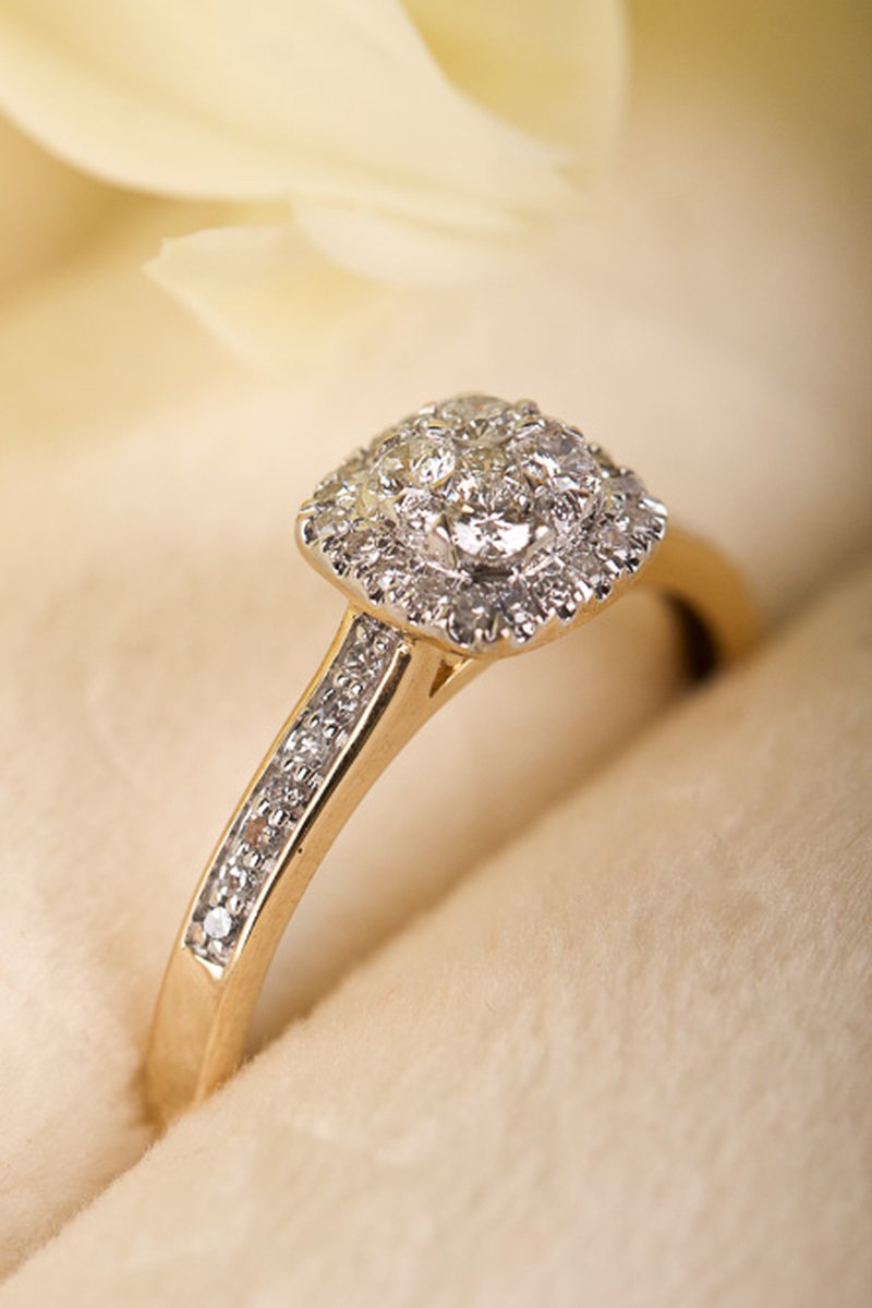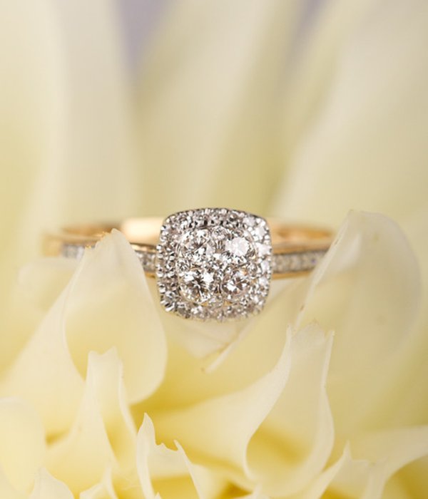 Diamantring med många små gnistrande diamanter. Chatongen är upphöjd på ett dekorativt sätt för att göra plats för en alliansring bredvid.