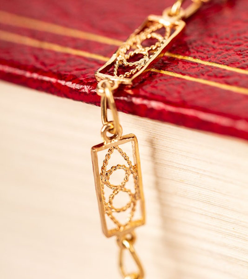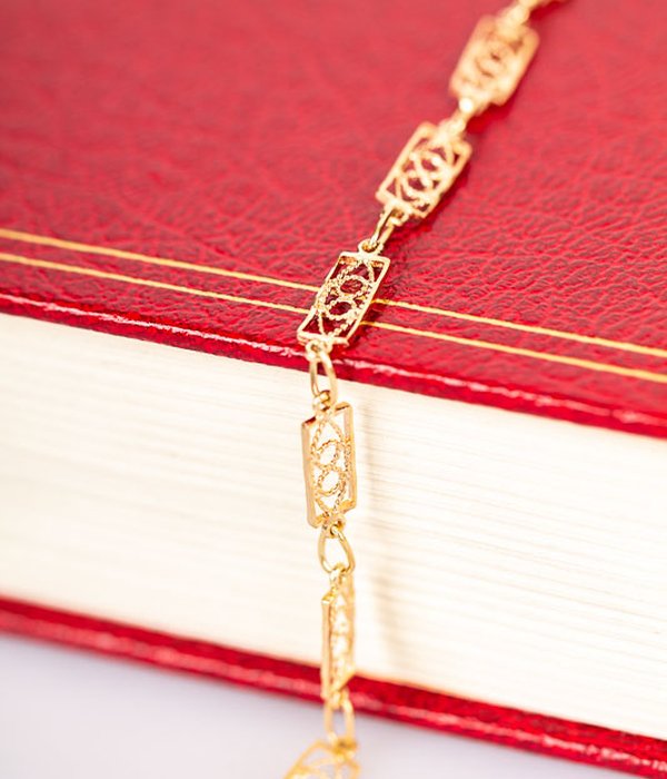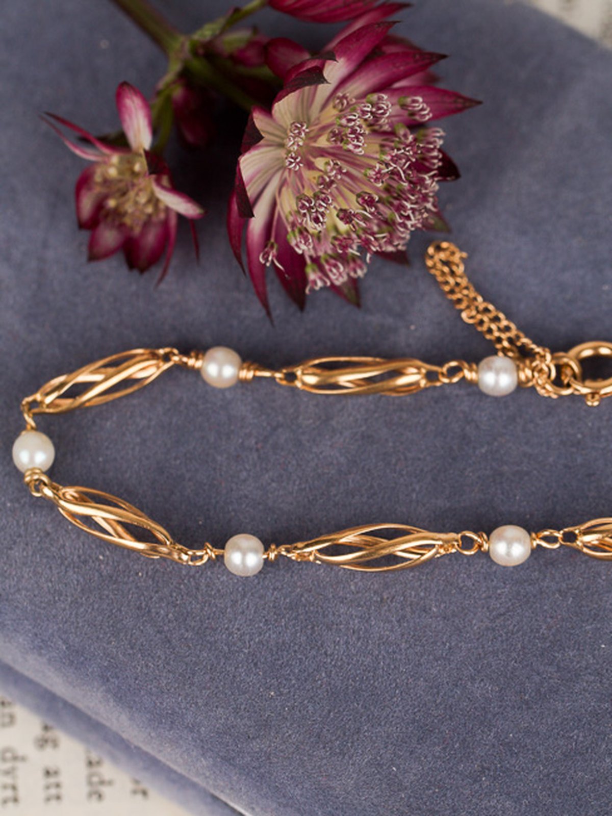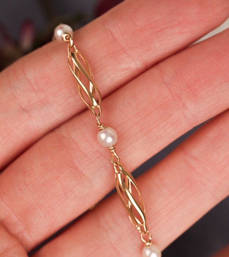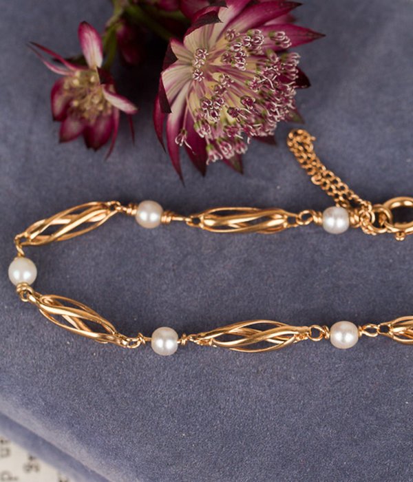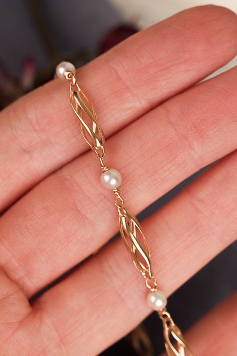 Fint guldarmband med pärlor, armbandet har en säkerhetskedja.