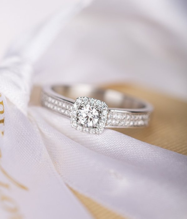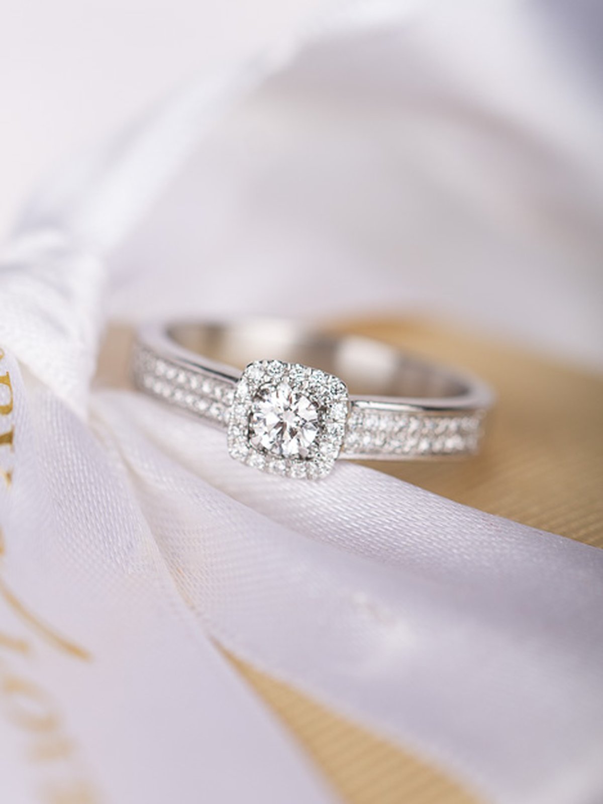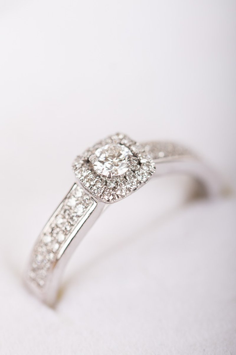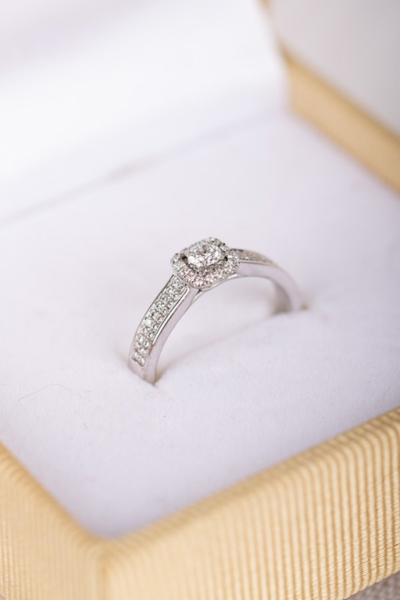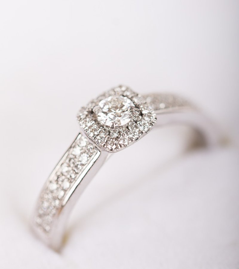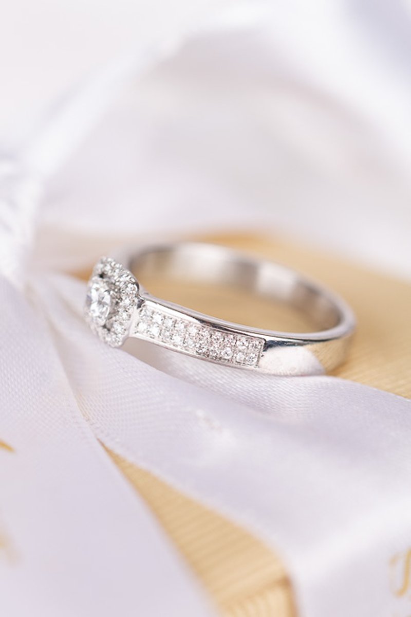 Halo-ring i vitguld med många diamanter, mittsten på 0,20 ct.
