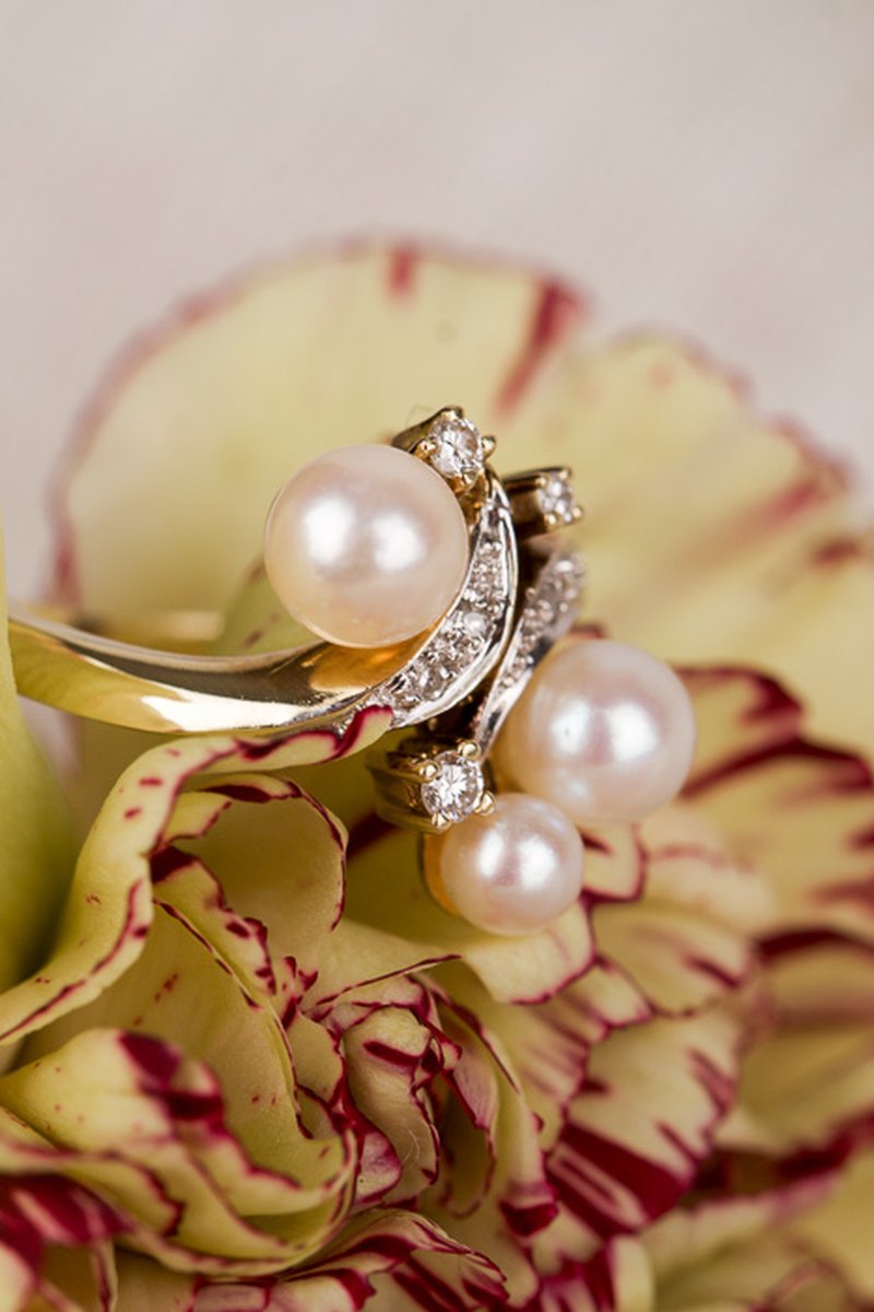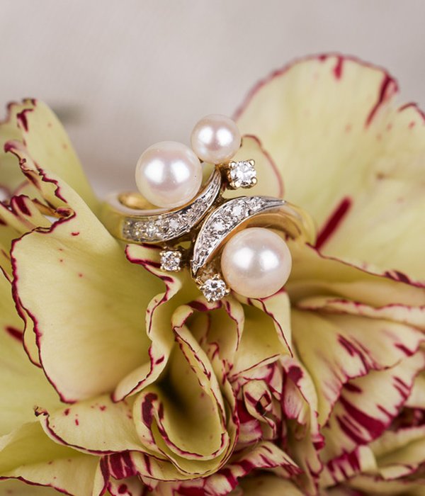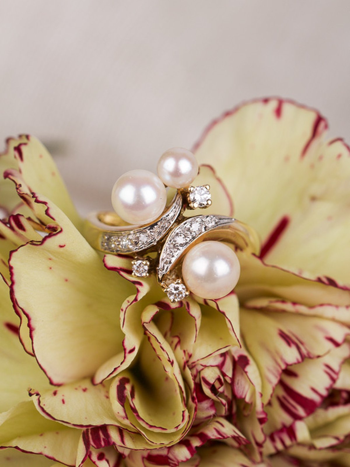 Vacker ring med sötvattenspärlor och vitguldsinfattade diamanter.