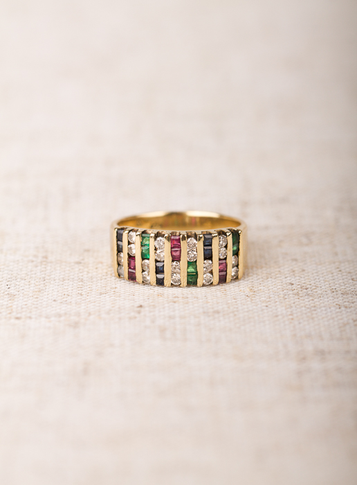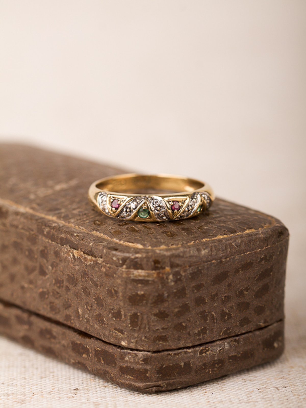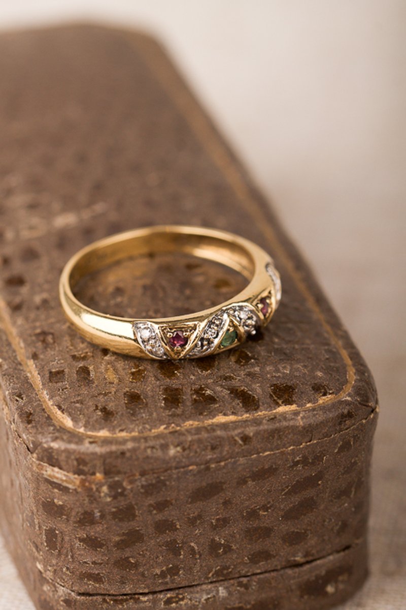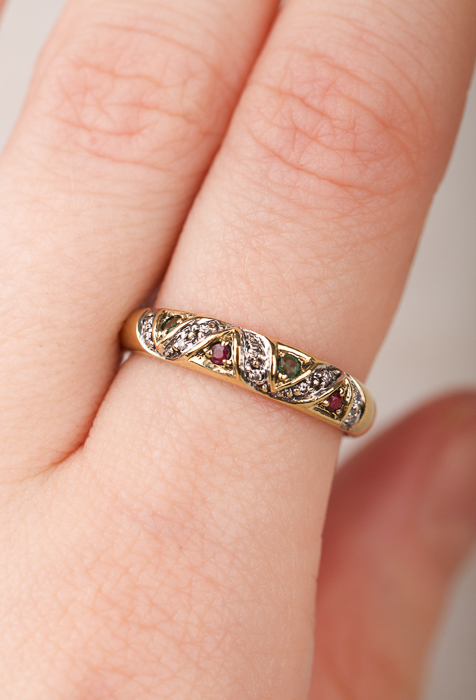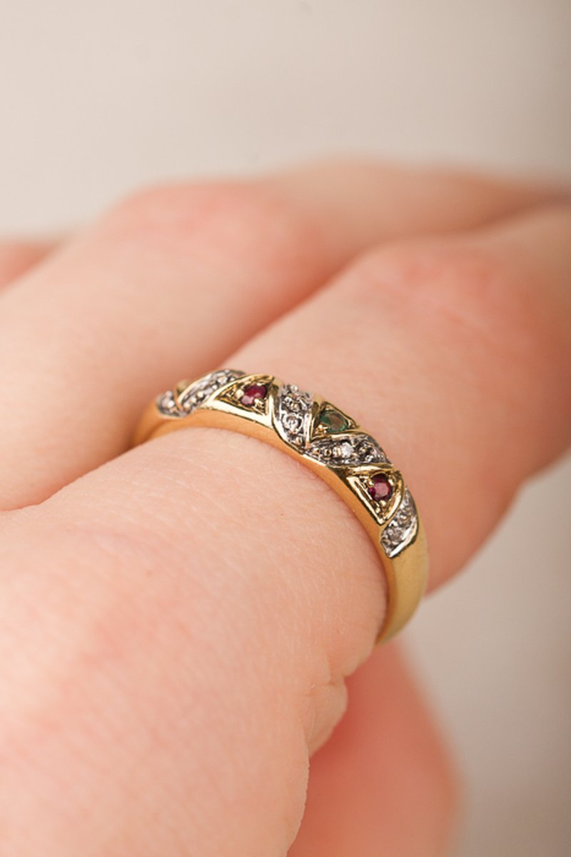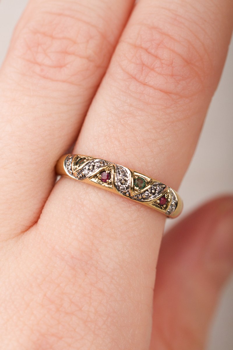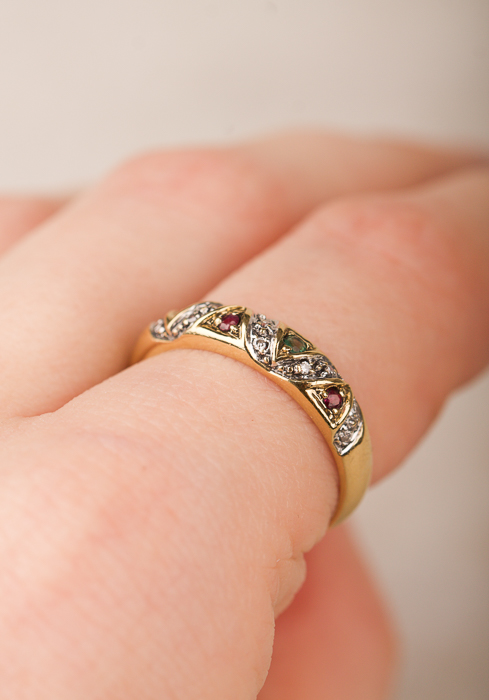 18K guld, 10 x 0,005 ct diamanter, två smaragder och två rubiner