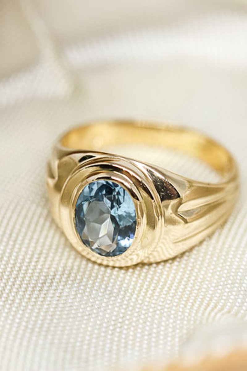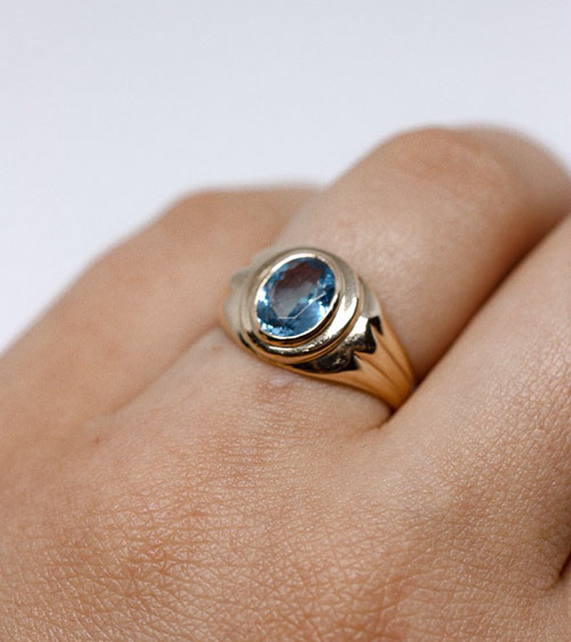 Läcker 80-tals ring tillverkad i 18k guld med med blå syntetisk spinell. En ring som sticker ut i mängden med sin design och underbara kvalitet.