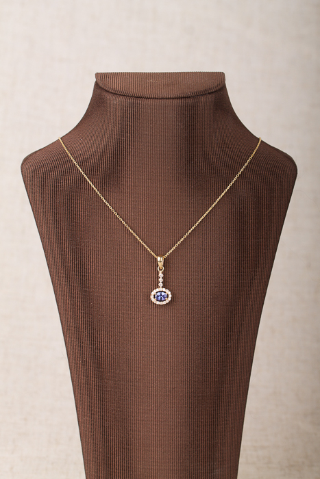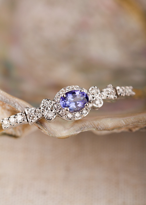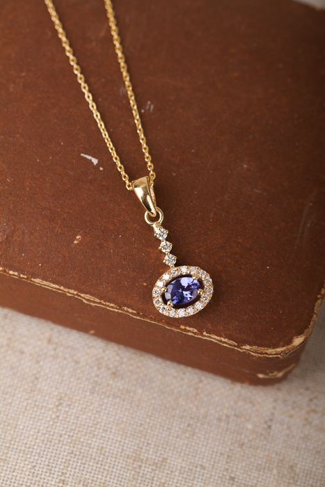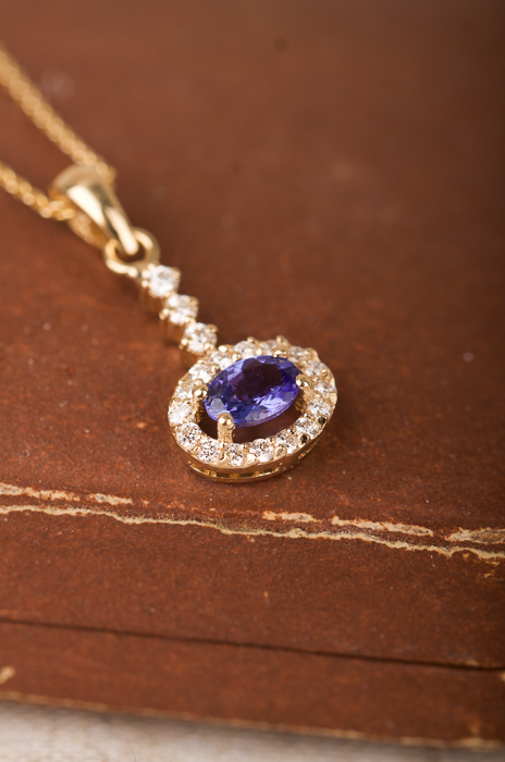 14K guld, Tanzanit 6 x 4 mm (0,42 ct) samt 19 st briljantslipade diamanter tot. 0,25 ct