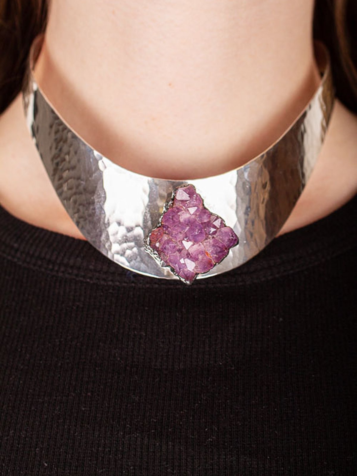 Maffig halsring i silver med ametist kluster. Detta halsband är något för den riktiga smyckesfantasten. Ett riktigt showpiece!