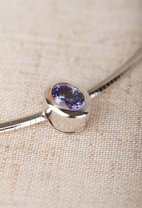 Vitguldshalsband med en tanzanit i härlig storlek. Baksidan av länken är i gulguld.