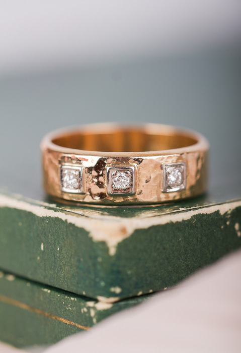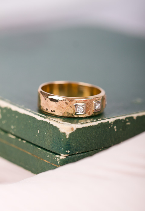 Praktfull ring tillverkad 1978 i Skellefteå av Flavia. Vitguldsinfattade briljanter i den sju mm breda skenan. Unisex.