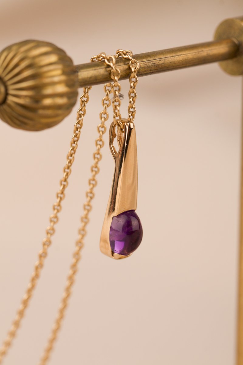 Vacker hängsmycke med en cabuchonslipad ametist. Kedjan ingår ej.
