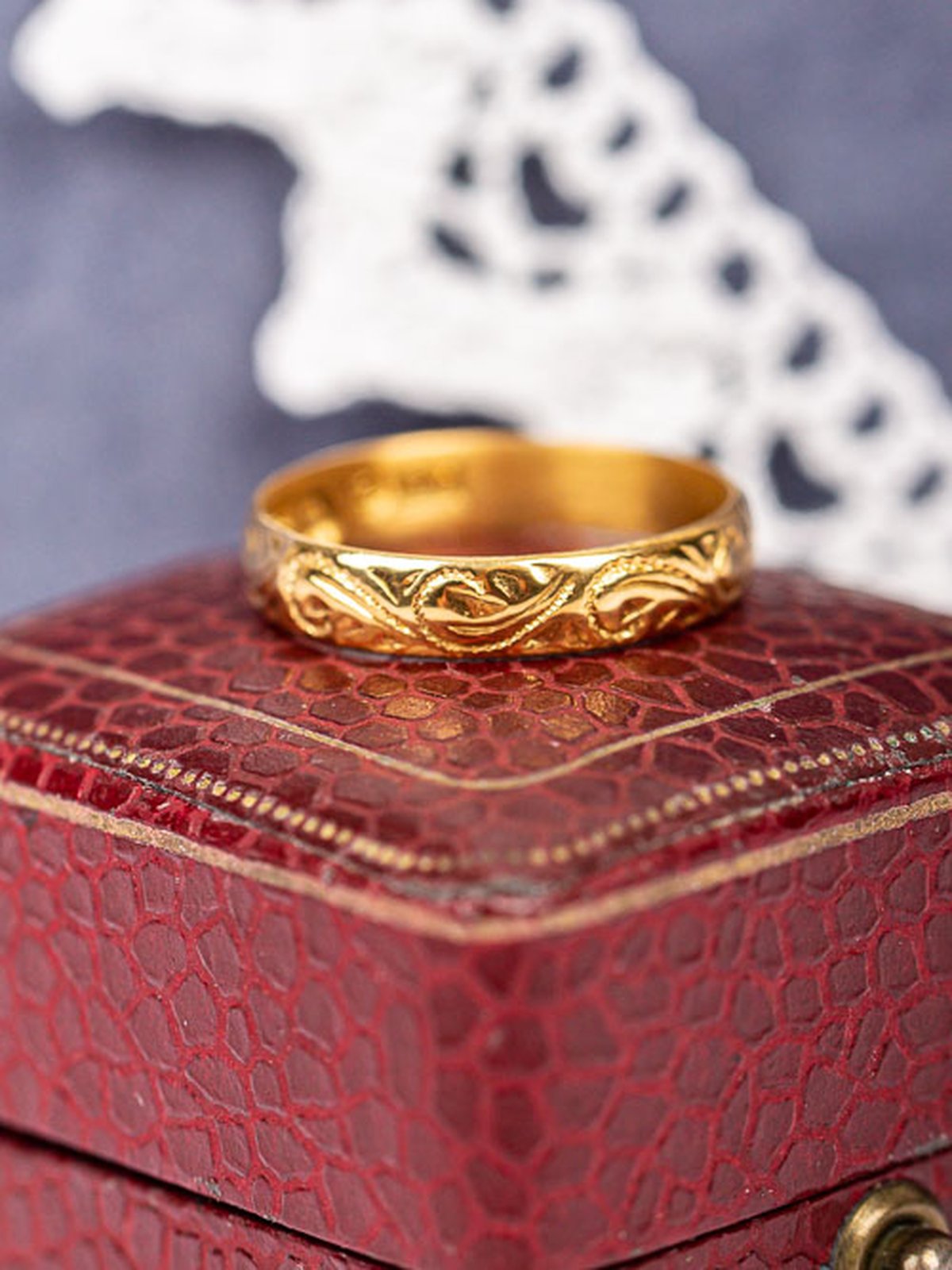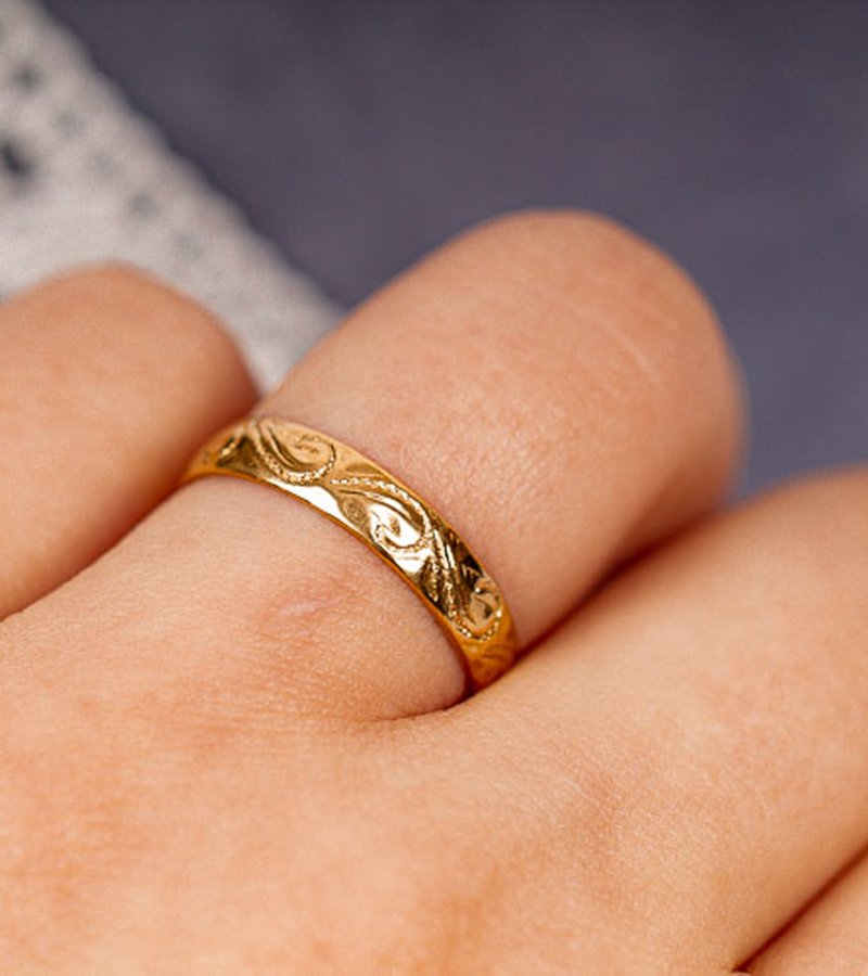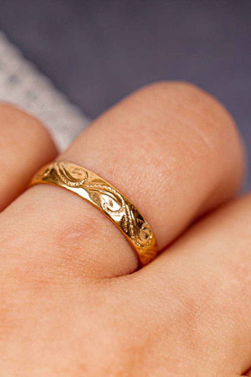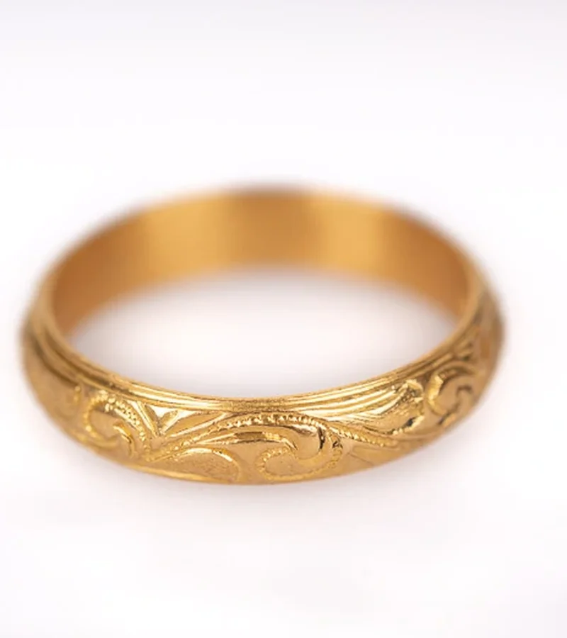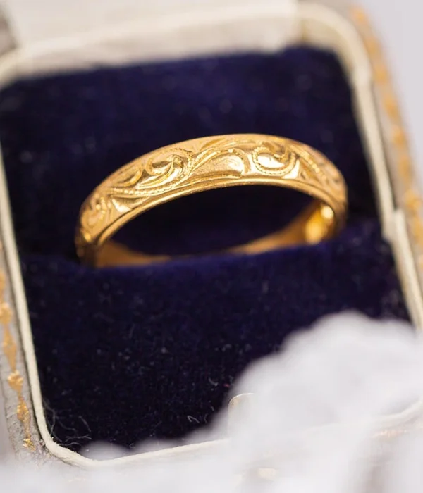 Vintage guldring med vacker handgraverat mönster. Tillverkad av Helge Brandt i Skellefteå år 1960. Går både att gravera och storleksändra vid önskemål.