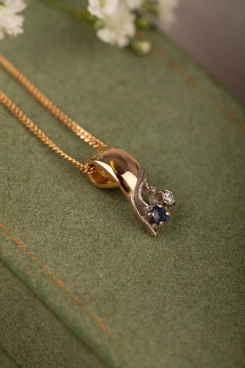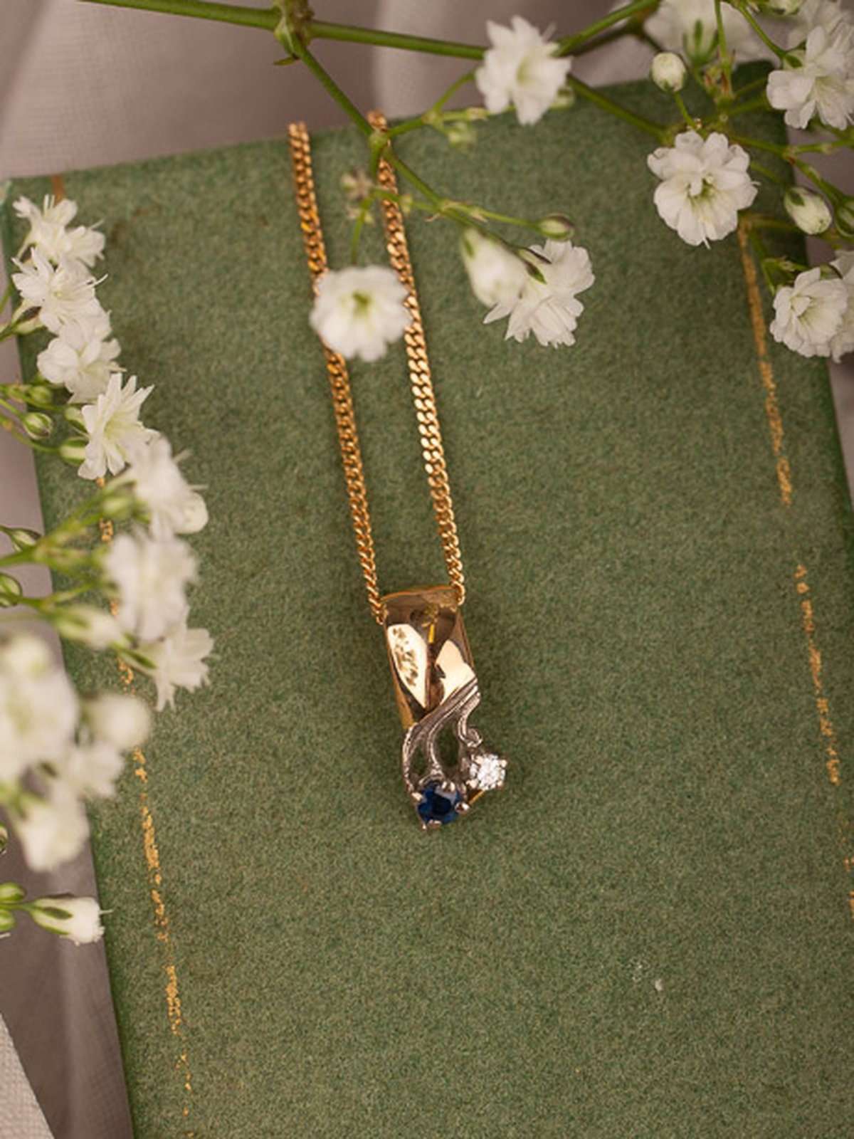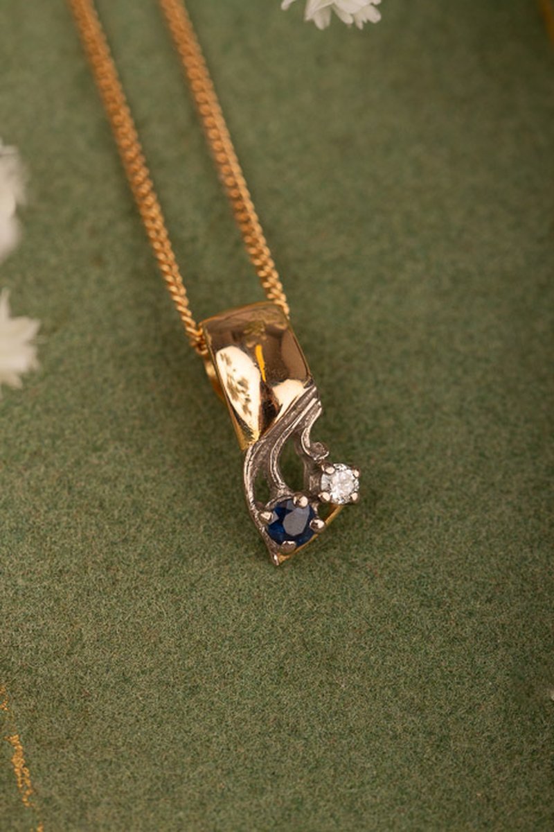 Gulligt hängsmycke i guld med två vitguldsinfattade ädelstenar. Kedjan ingår ej