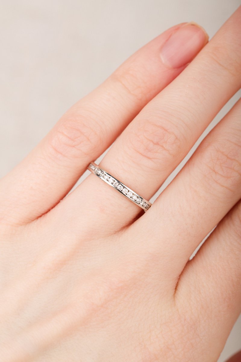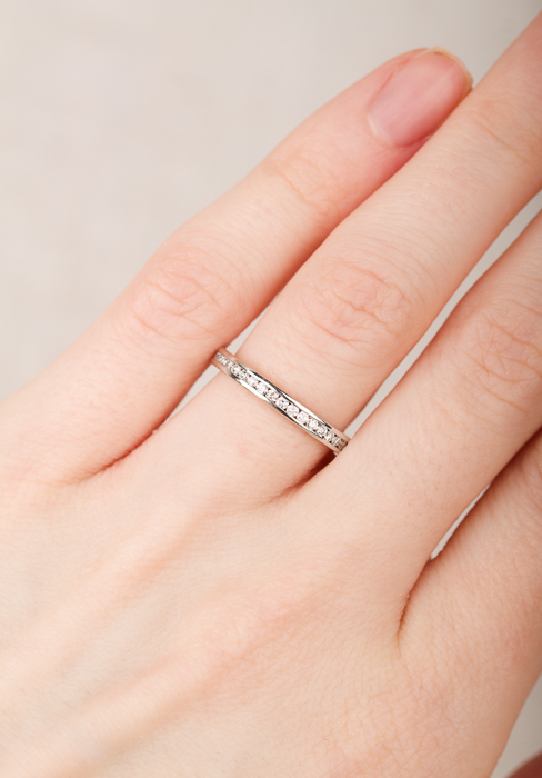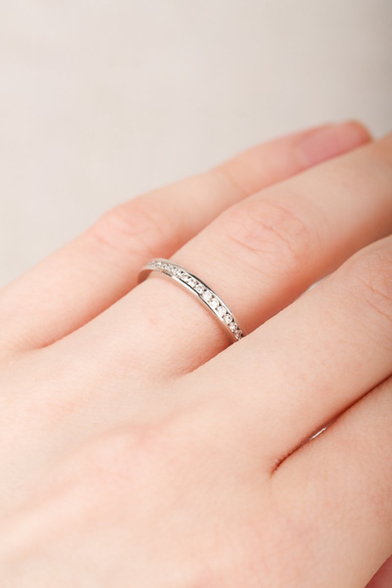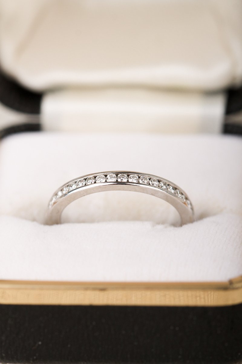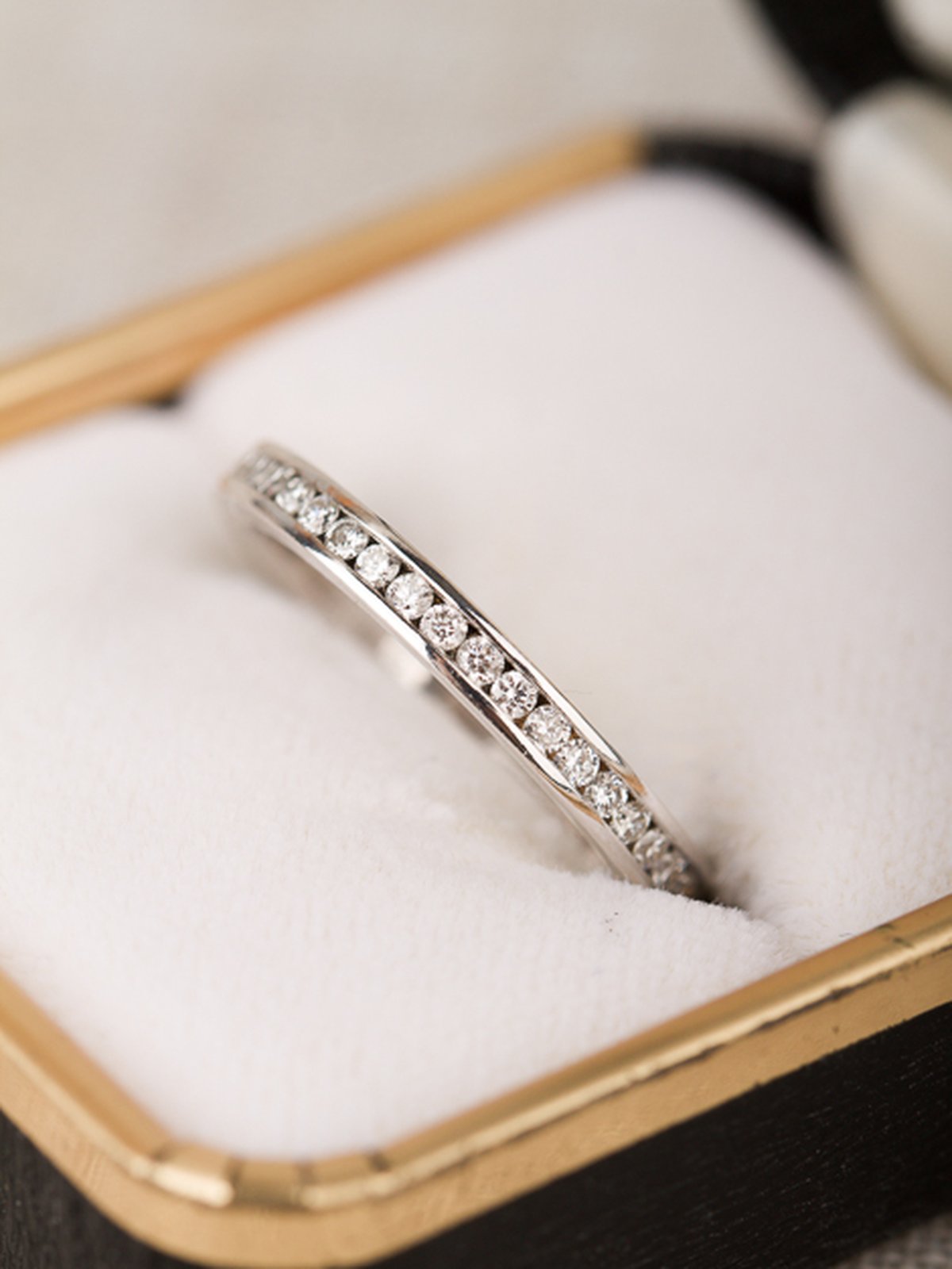 Vacker alliansring med stenar runt hela ringen. Diamanterna är kanalinfattade och gnistrar väldigt mycket. Den här ringen går tyvärr inte att justera i storlek.