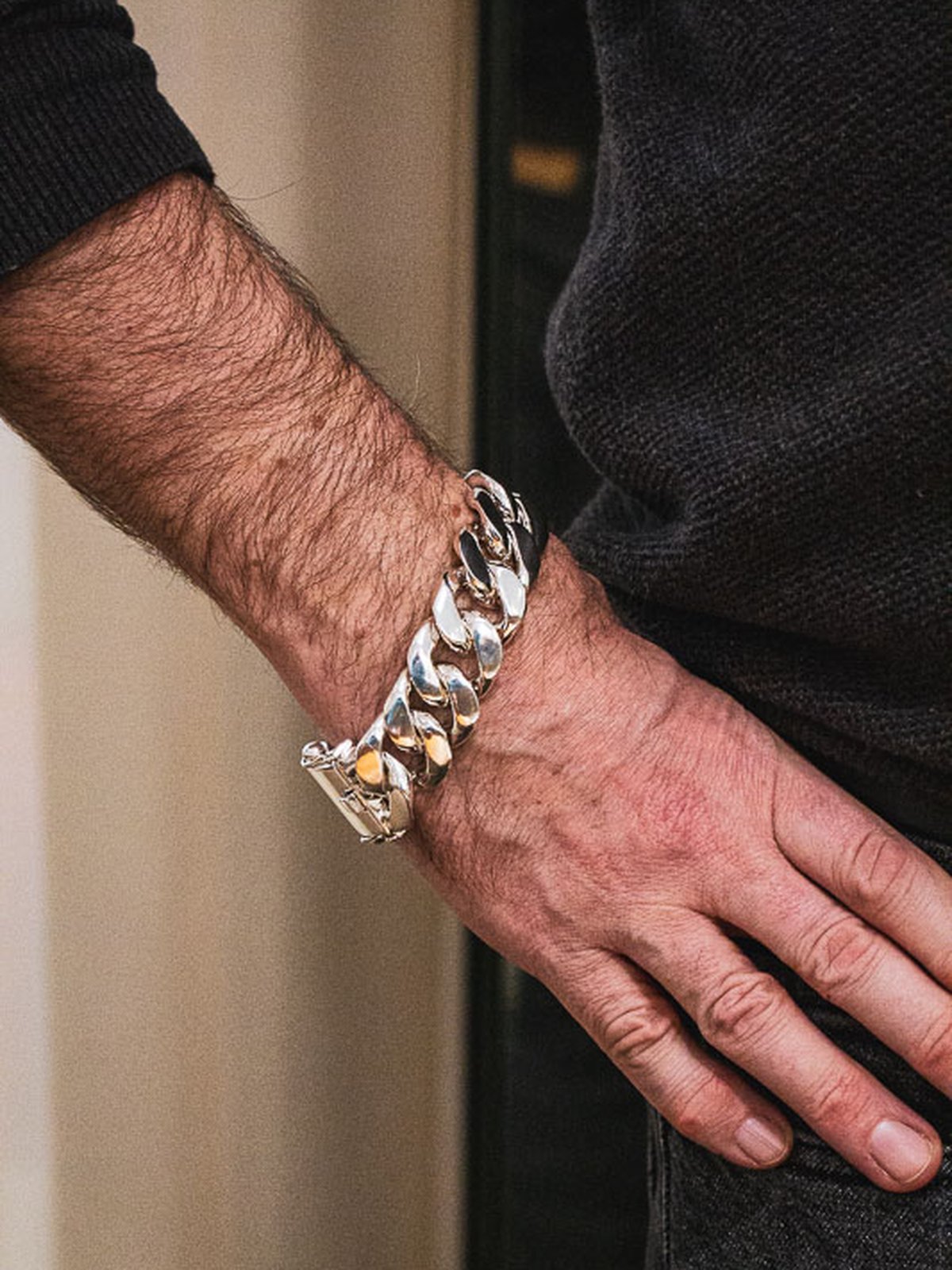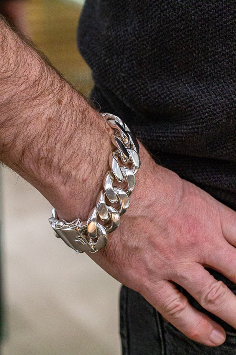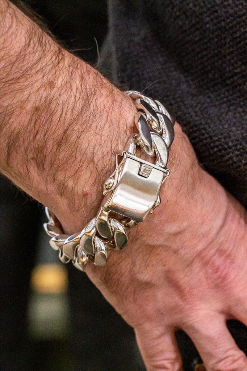 Grovt silverarmband som väger över 200g. Utrustat med rejält lås med rejäla säkerhetsåttor.