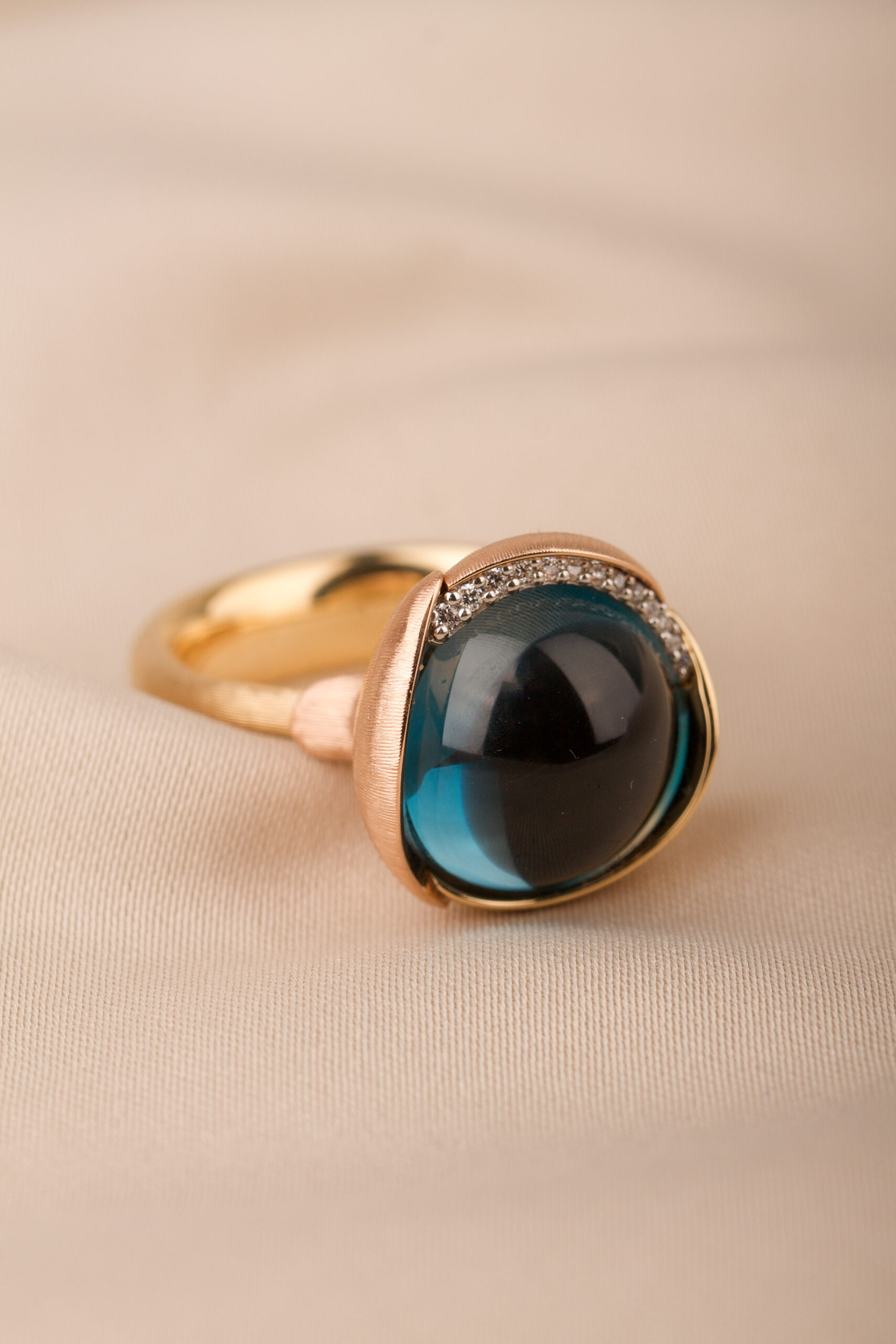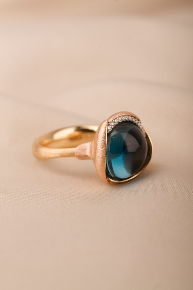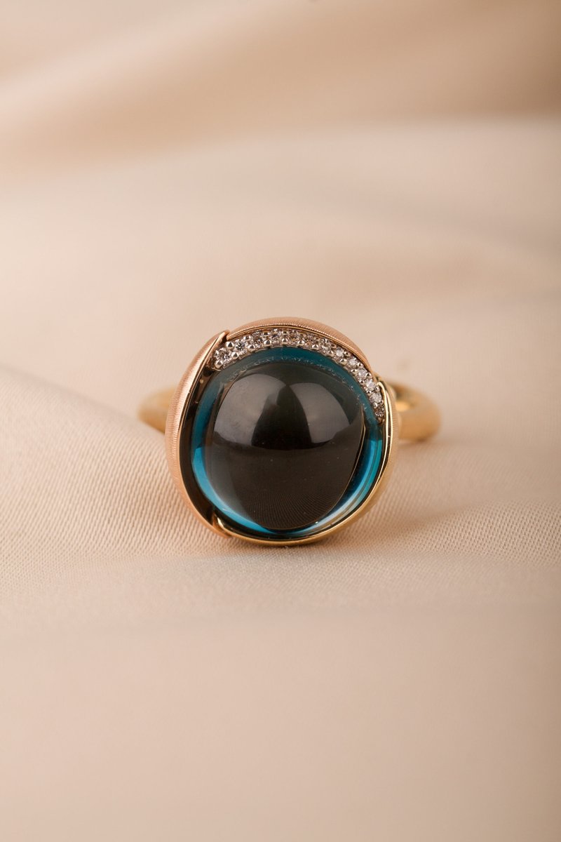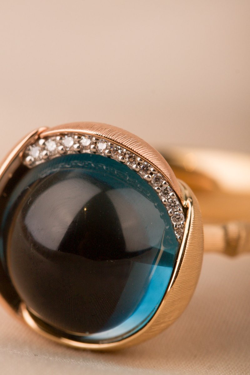 18K guld. Cabuchonslipad topas ca 13 mm, briljantlslipade diamanter 13 st tot. 0,05 ct TW/VS
