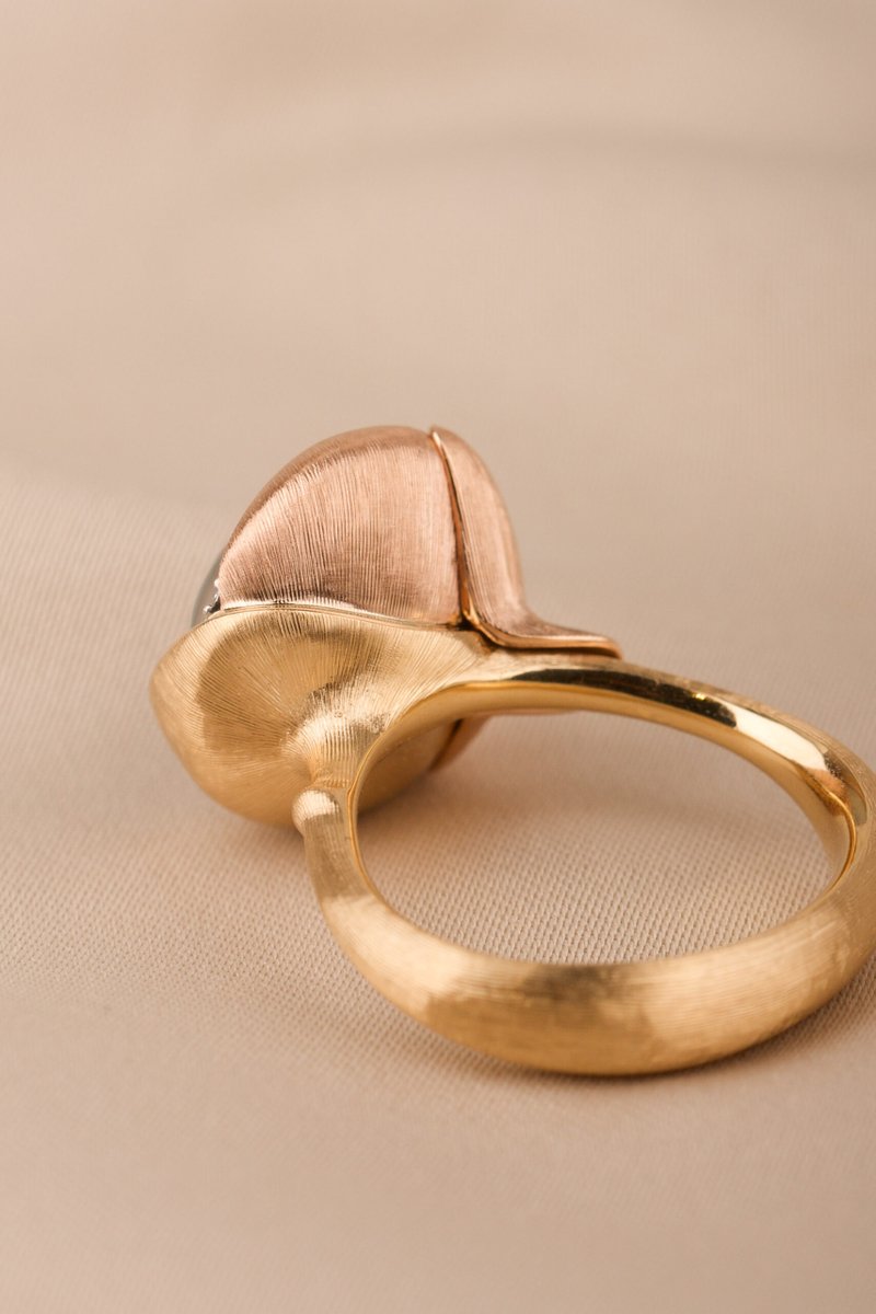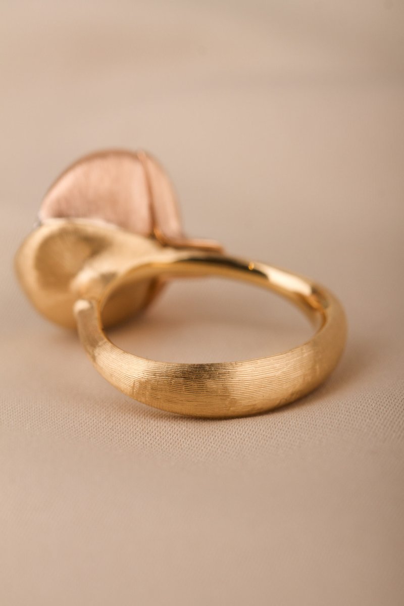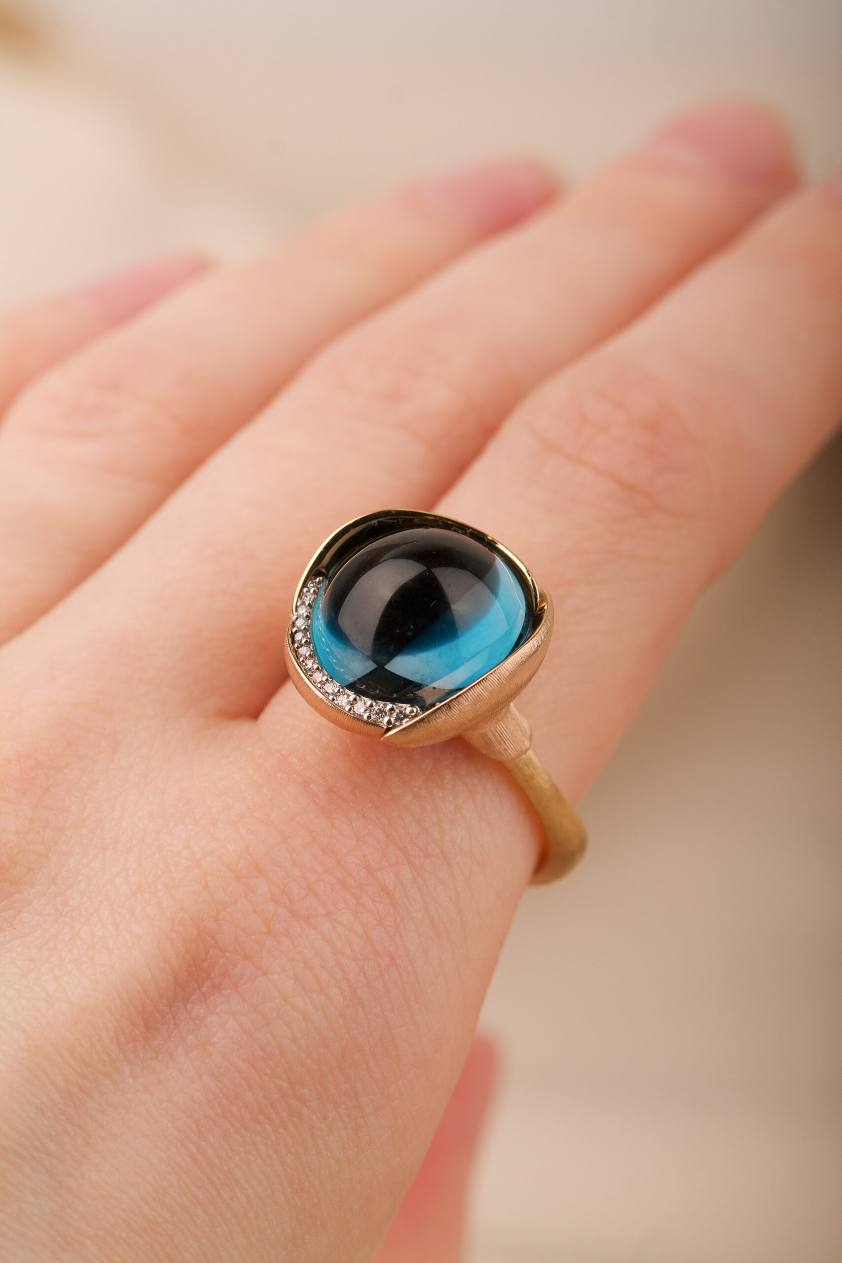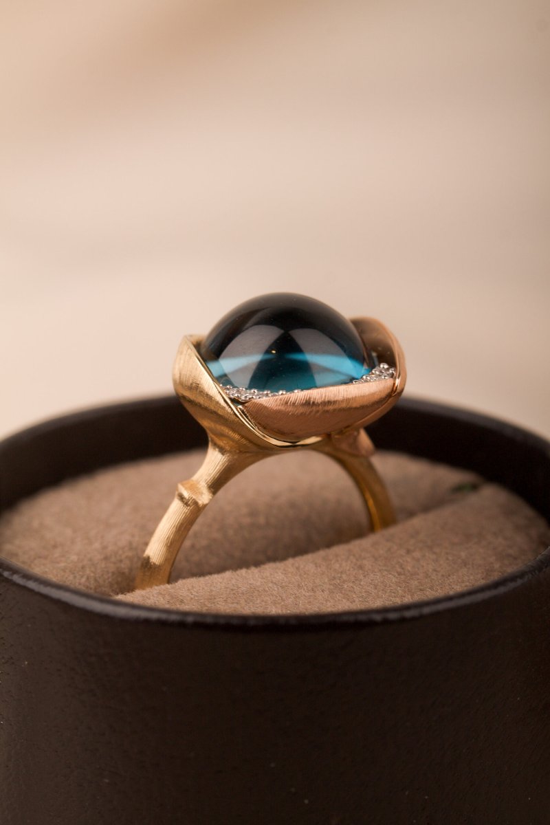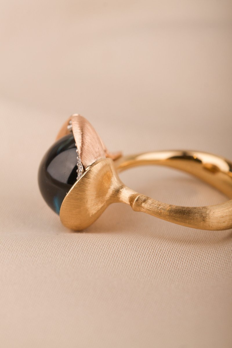 18K guld. Cabuchonslipad topas ca 13 mm, briljantlslipade diamanter 13 st tot. 0,05 ct TW/VS