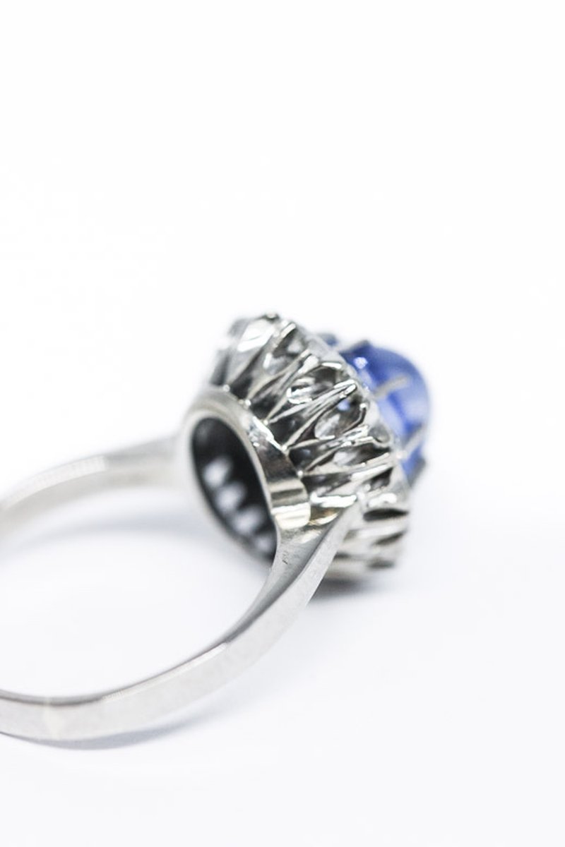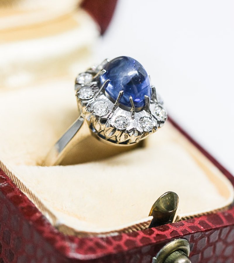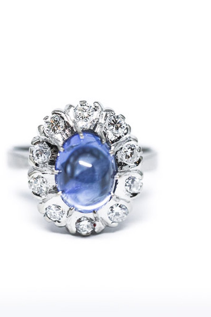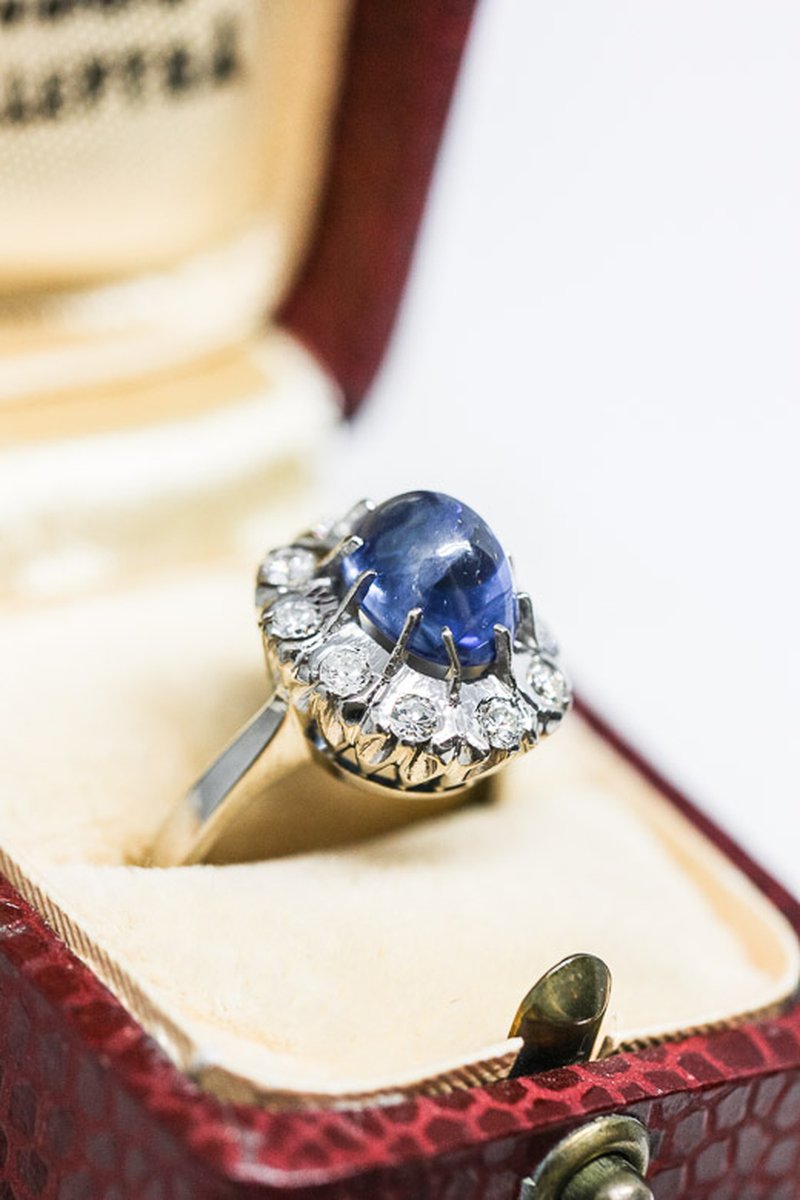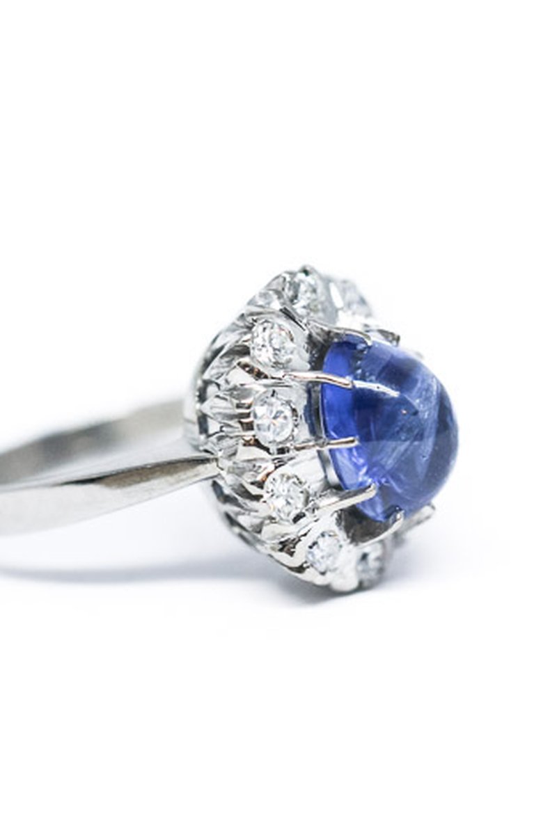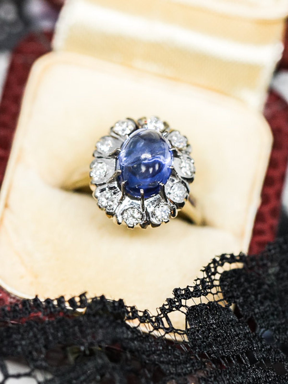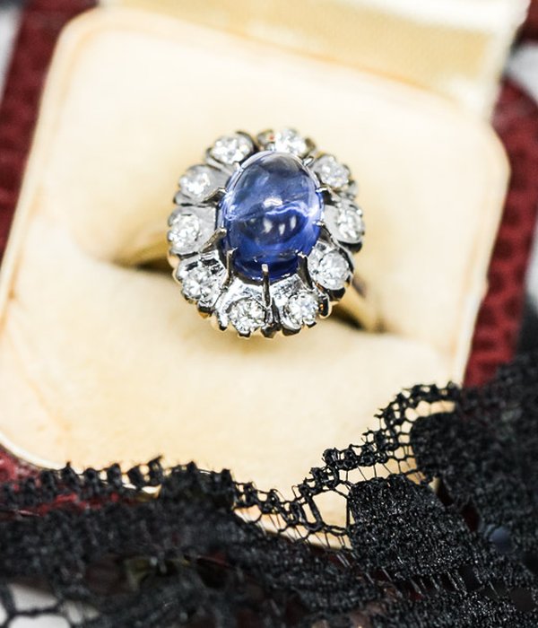 Romantisk safirring med en 8,9x8,6mm cabochonslipad safir i härlig blåfärg. Safiren omges av 10st gnistrande 0,04ct briljantslipade diamanter. Denna eleganta ring passar dig som söker det lilla extra. Går bra att både storleksändra och gravera om så önskas.